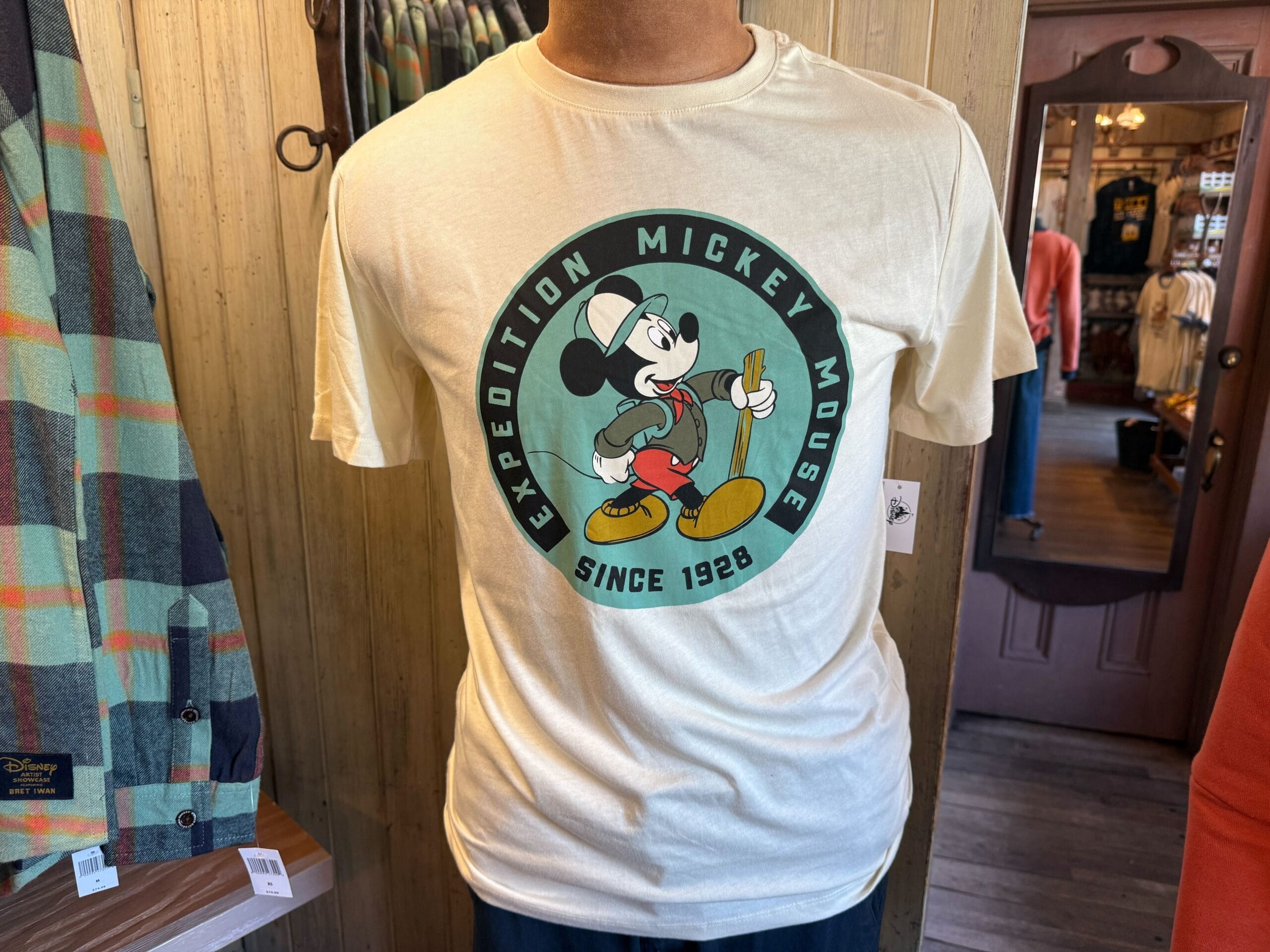 Expedition Mickey Mouse continues his hike on this off white tee with a teal medallion graphic.