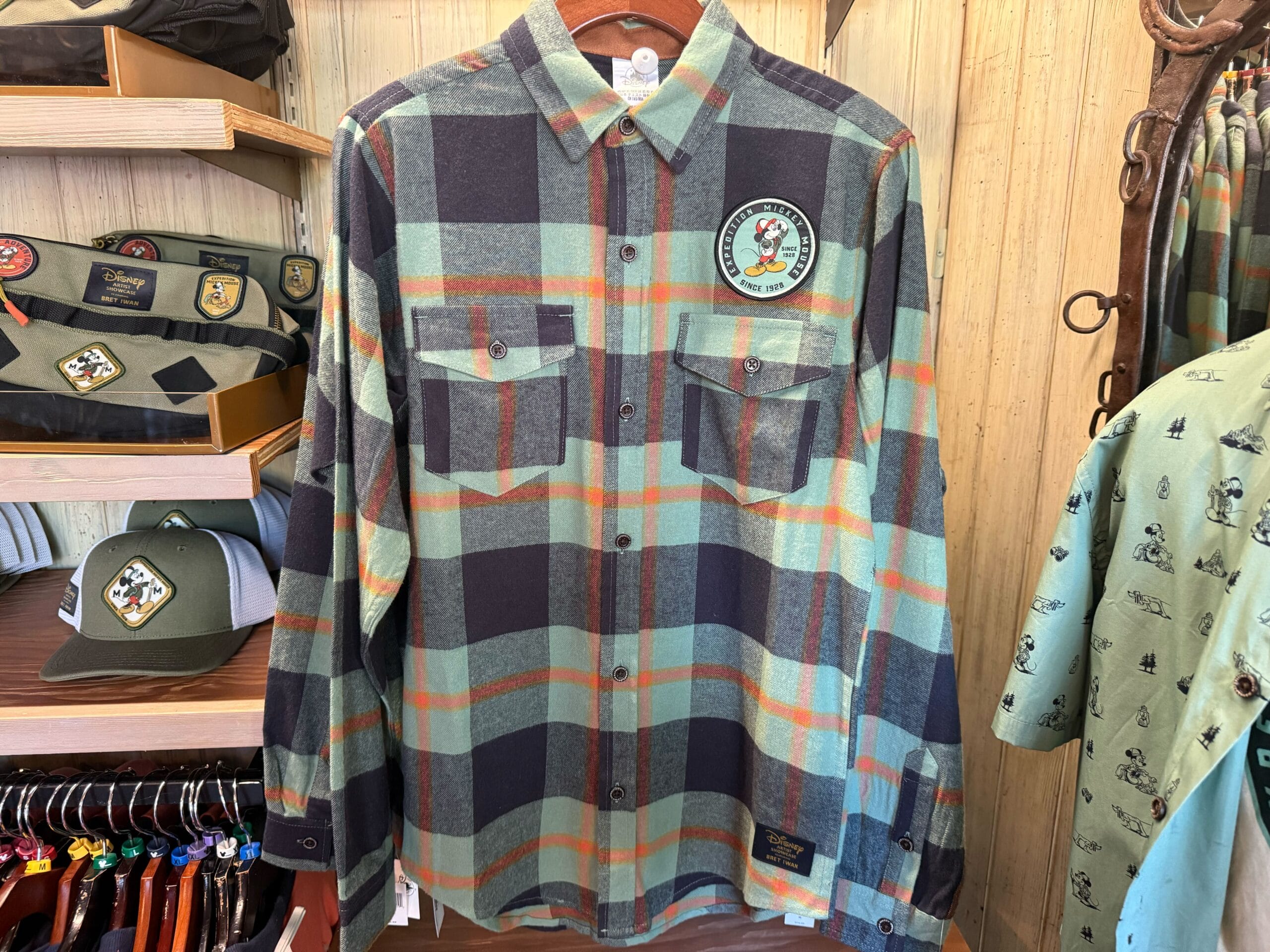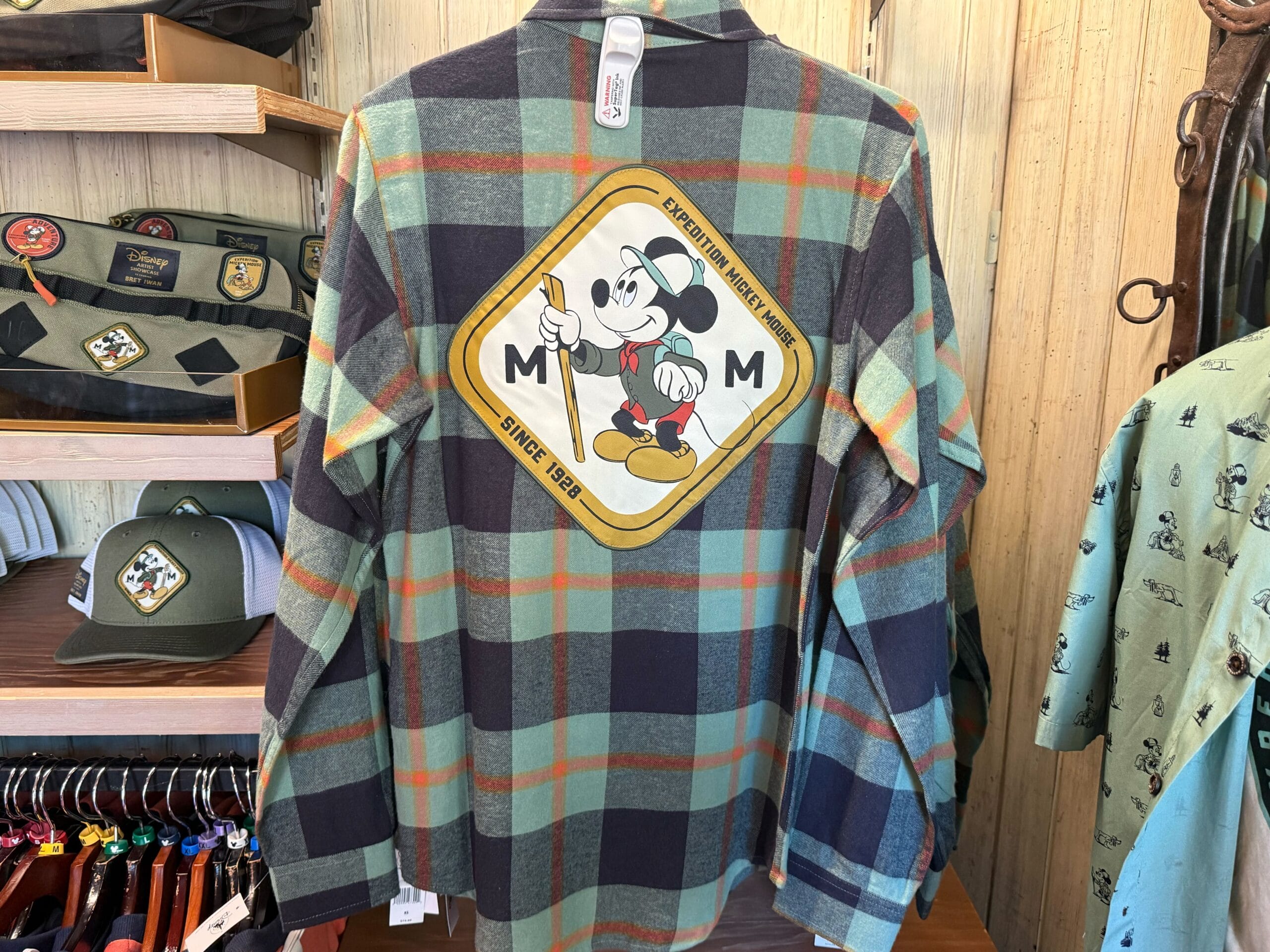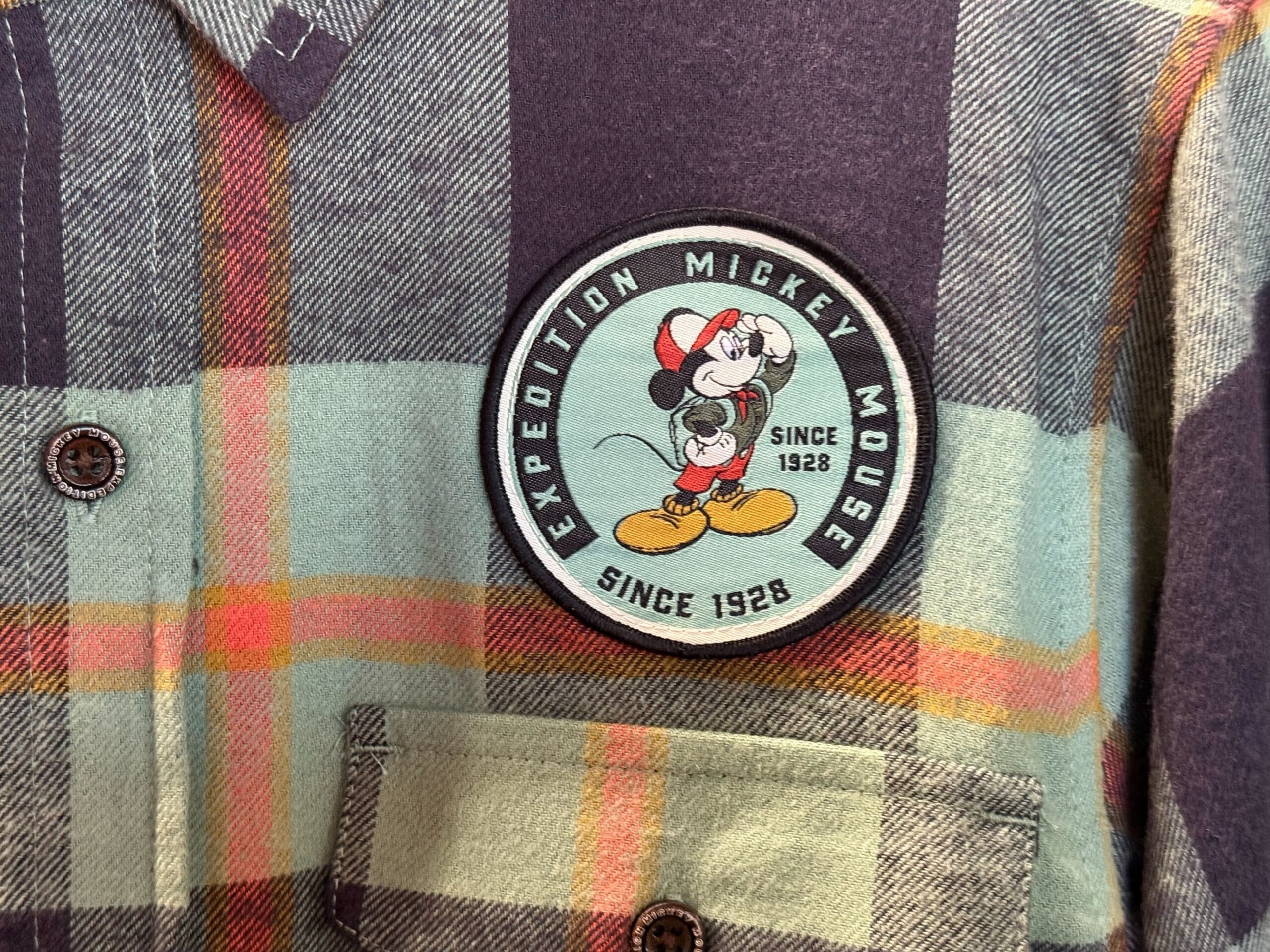 The flannel shirt is green, orange, and brown plaid. It buttons up the middle and has an Expedition Mickey Mouse patch above the left pocket.