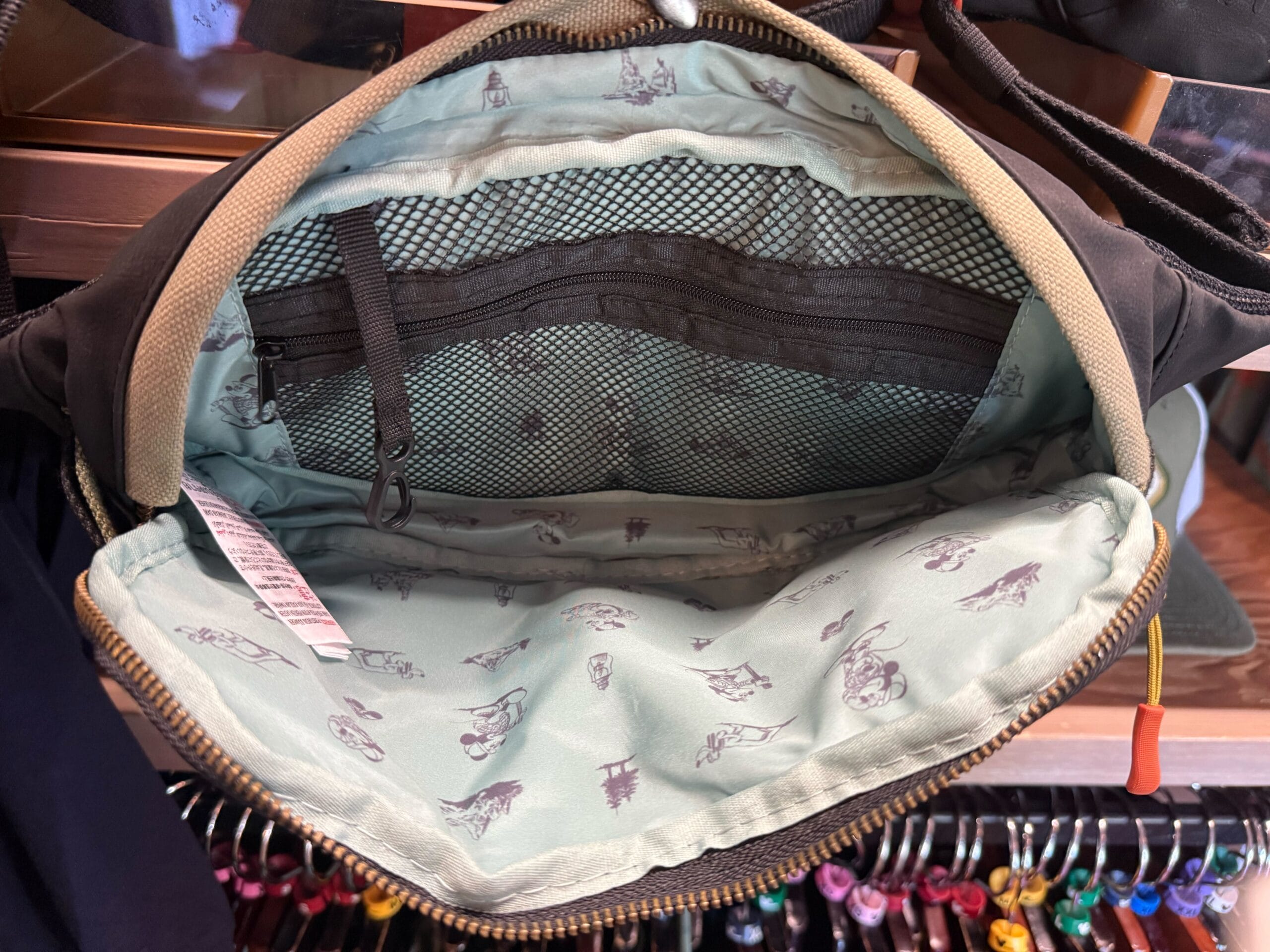 The interior has a mesh zippered pouch and a clip for keys. The lining is an all-over print of Expedition Mickey Mouse and other adventure icons. The back is padded and black with plastic orange hardware. A top carrying loop is also attached for ease of storing.