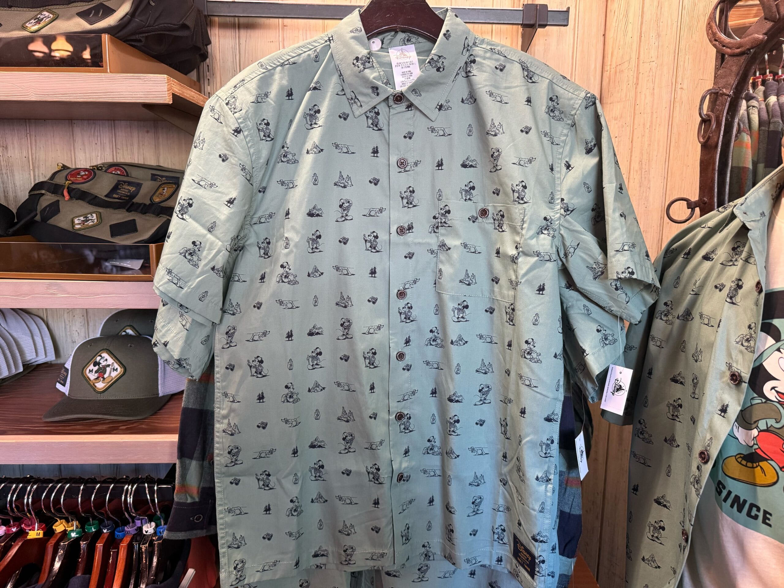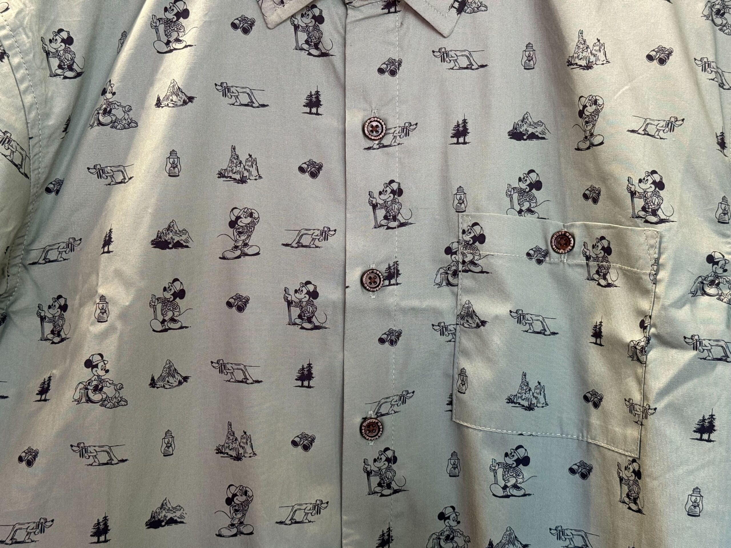 This collared shirt is sage green and features different Expedition Mickey Mouse and Pluto designs along with other camping and adventure-themed icons.