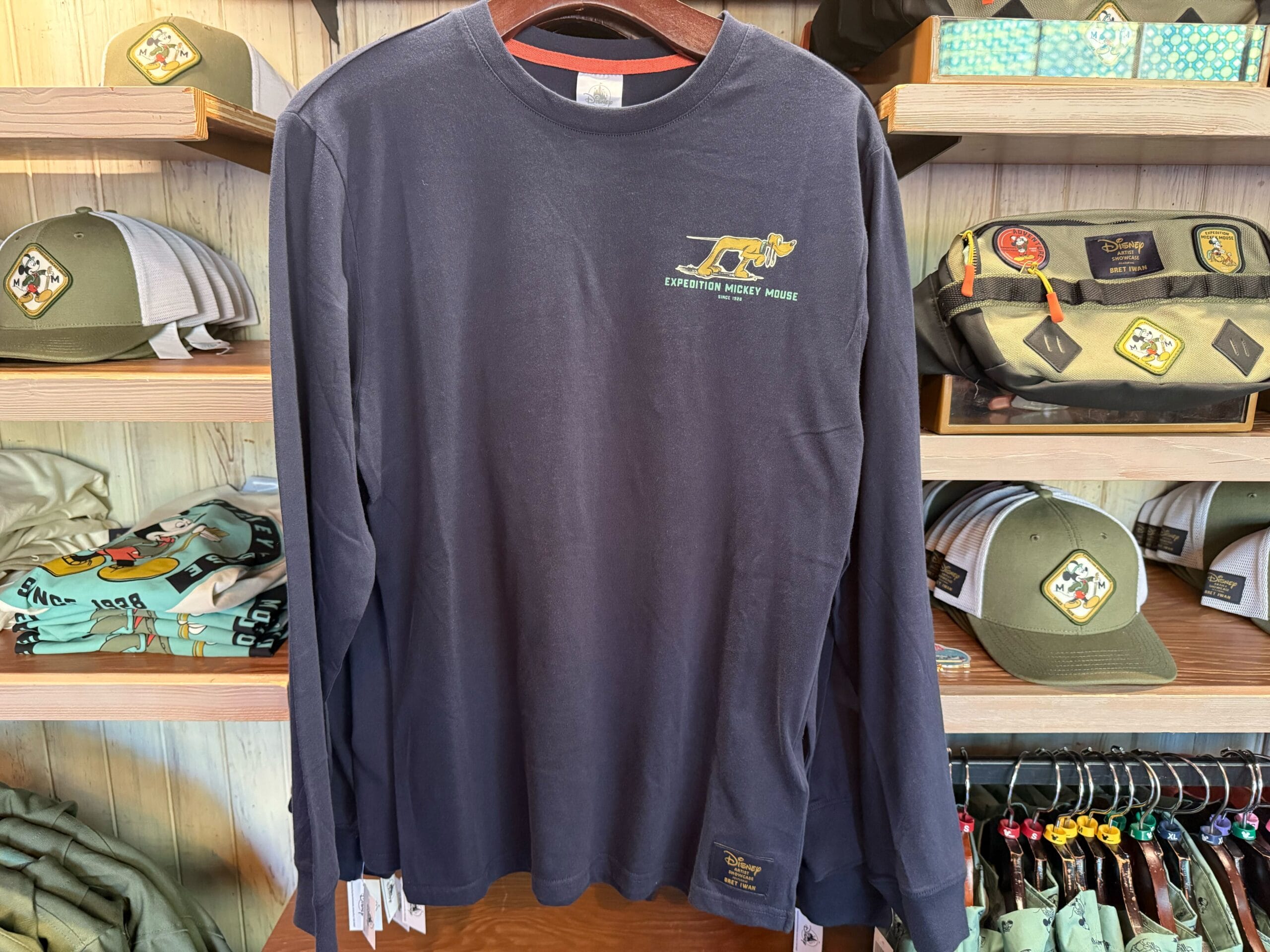 An image of Pluto is above green “Expedition Mickey Mouse” text on this navy long sleeve T-shirt.