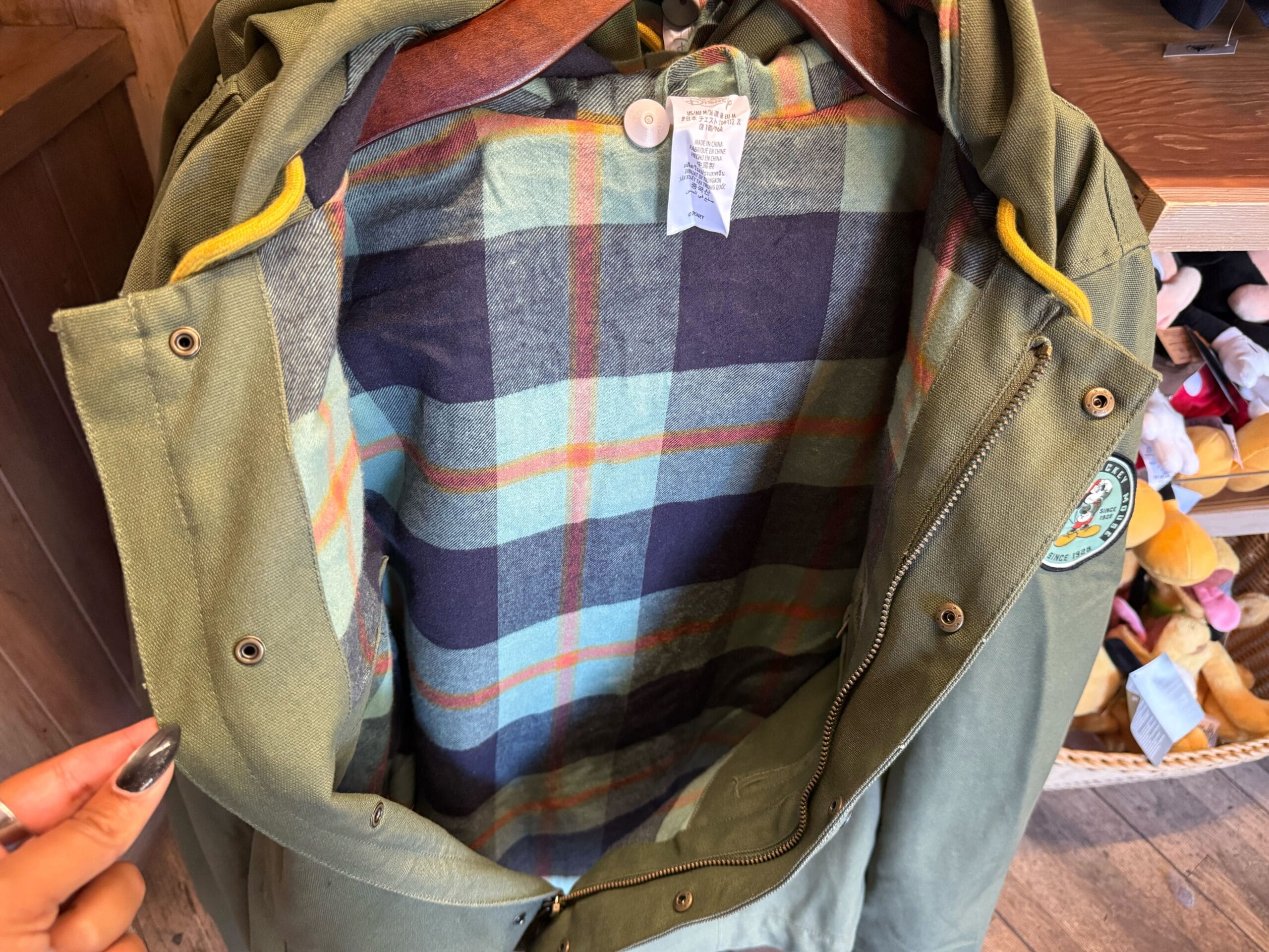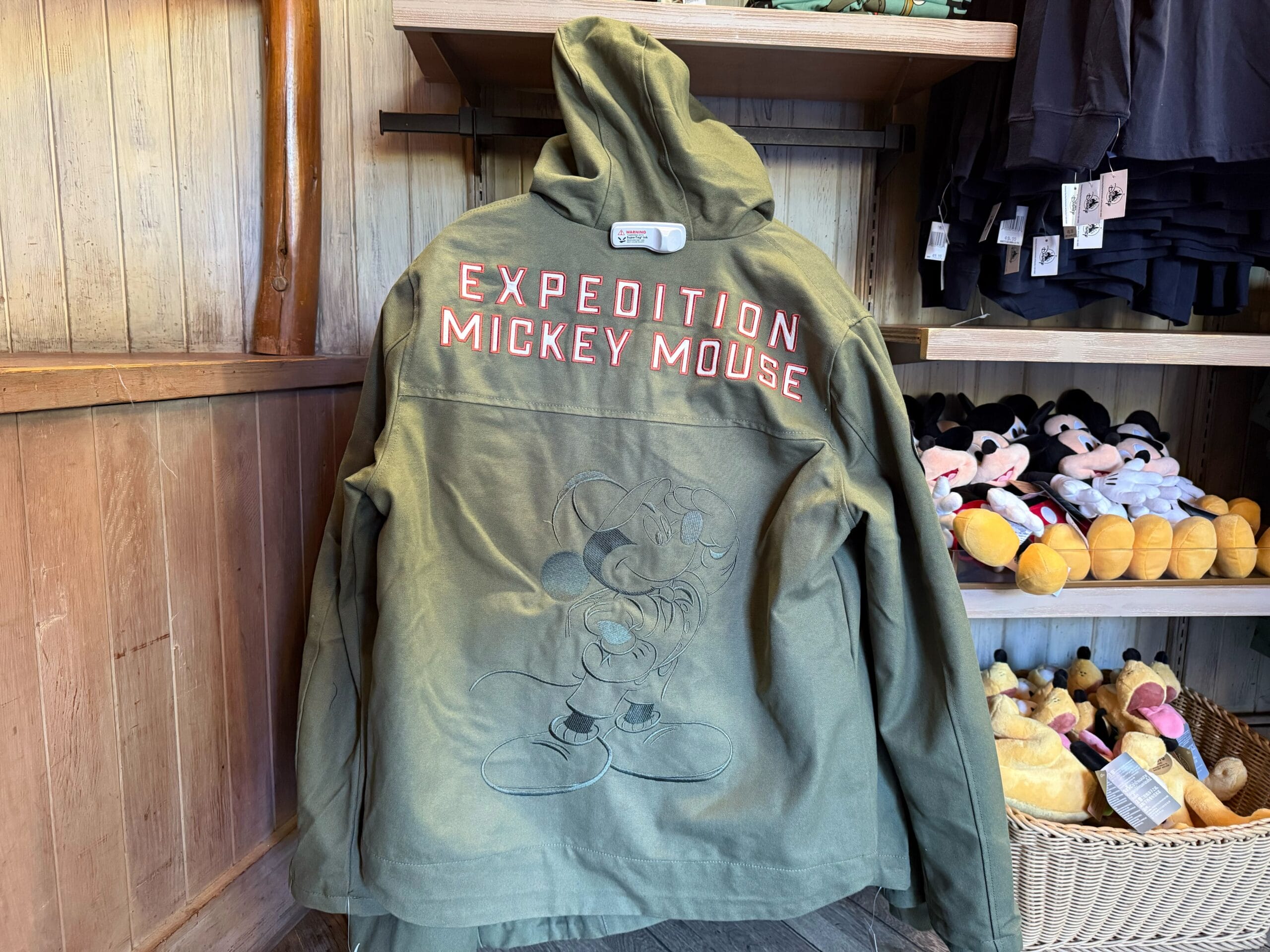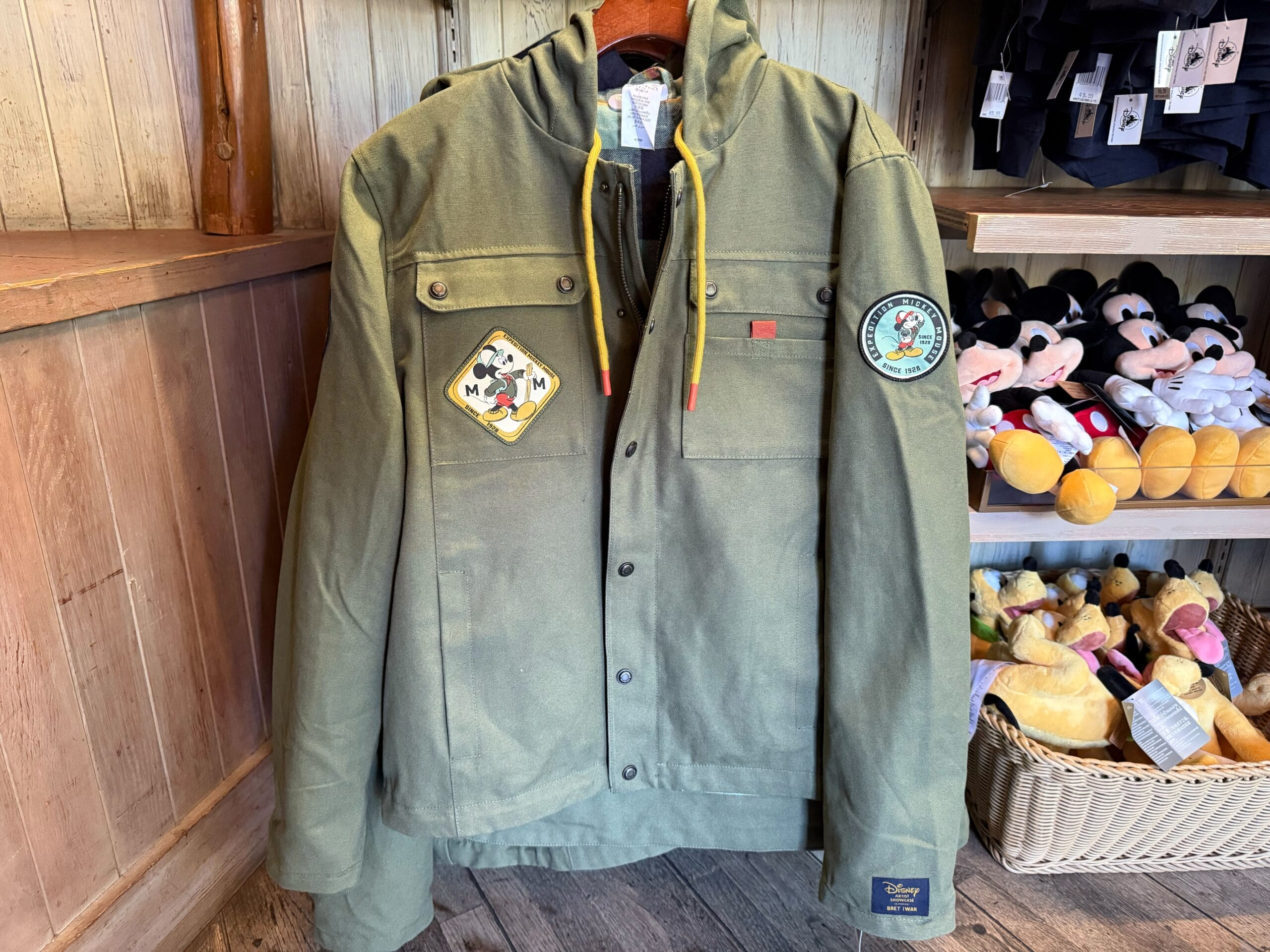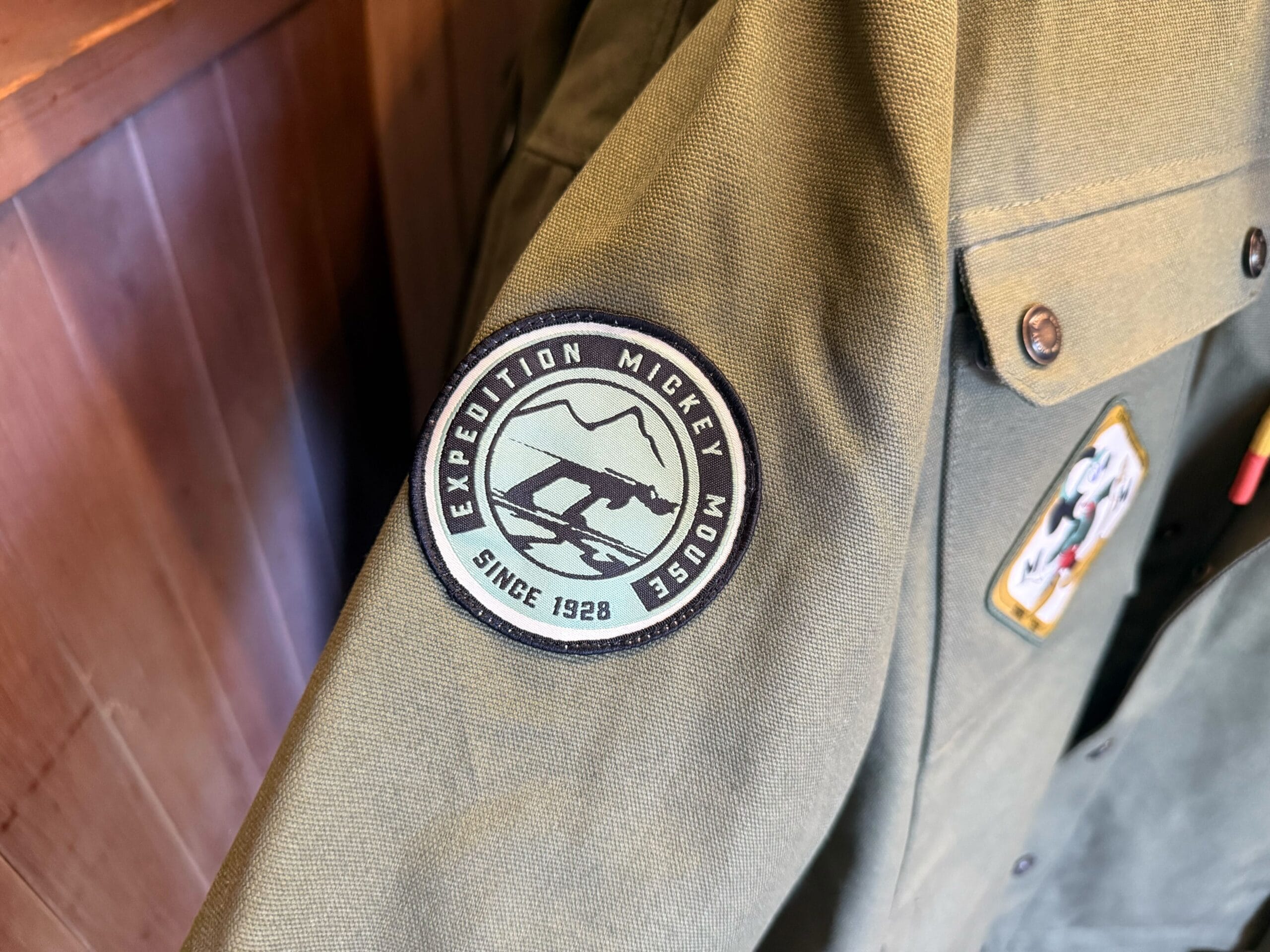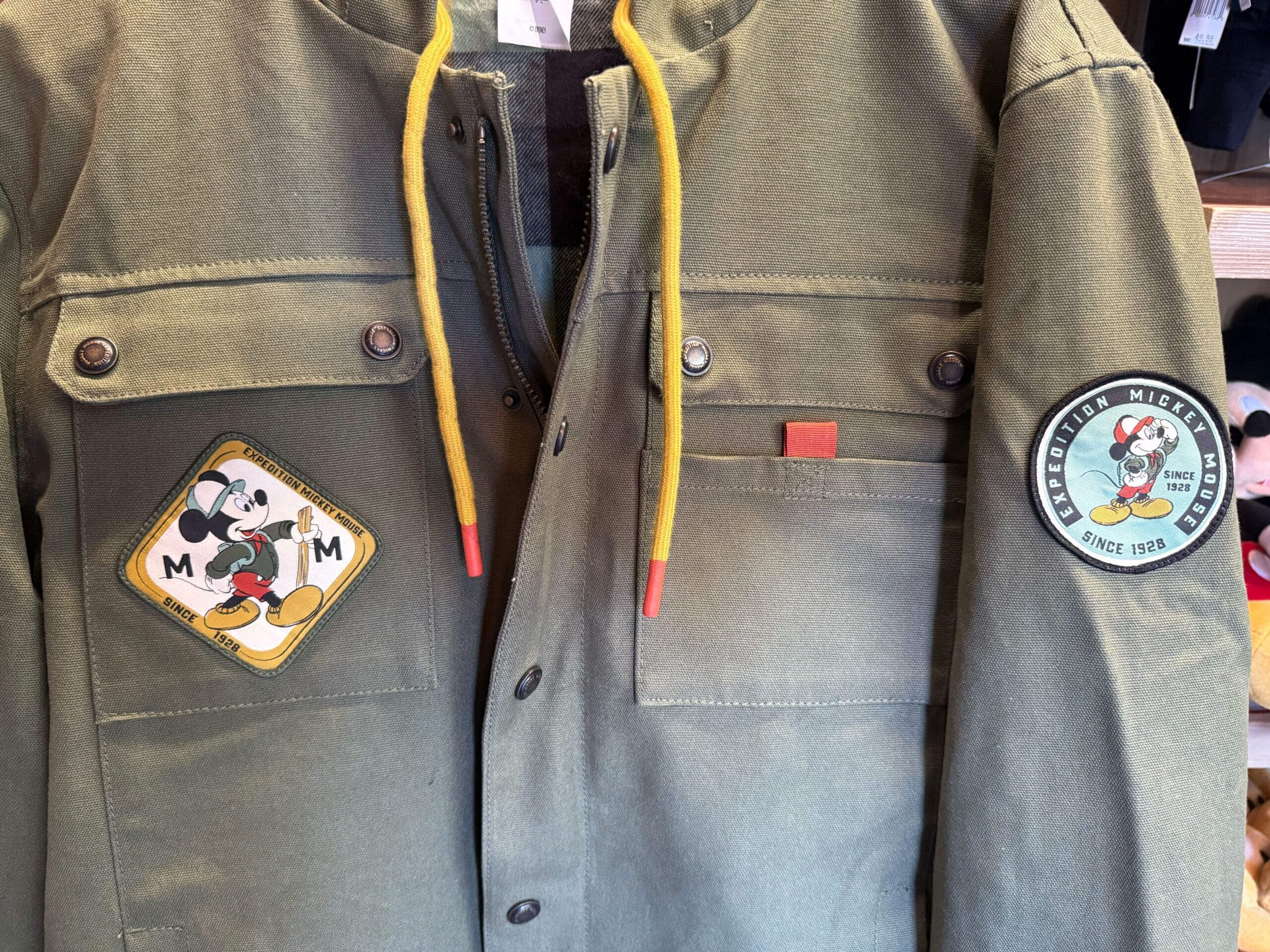 The thick, flannel lined jacket buttons up the middle and features a patch on the right chest. The back has ” Expedition Mickey Mouse” text in large red and white lettering. Underneath is an embroidered Scout Mickey.