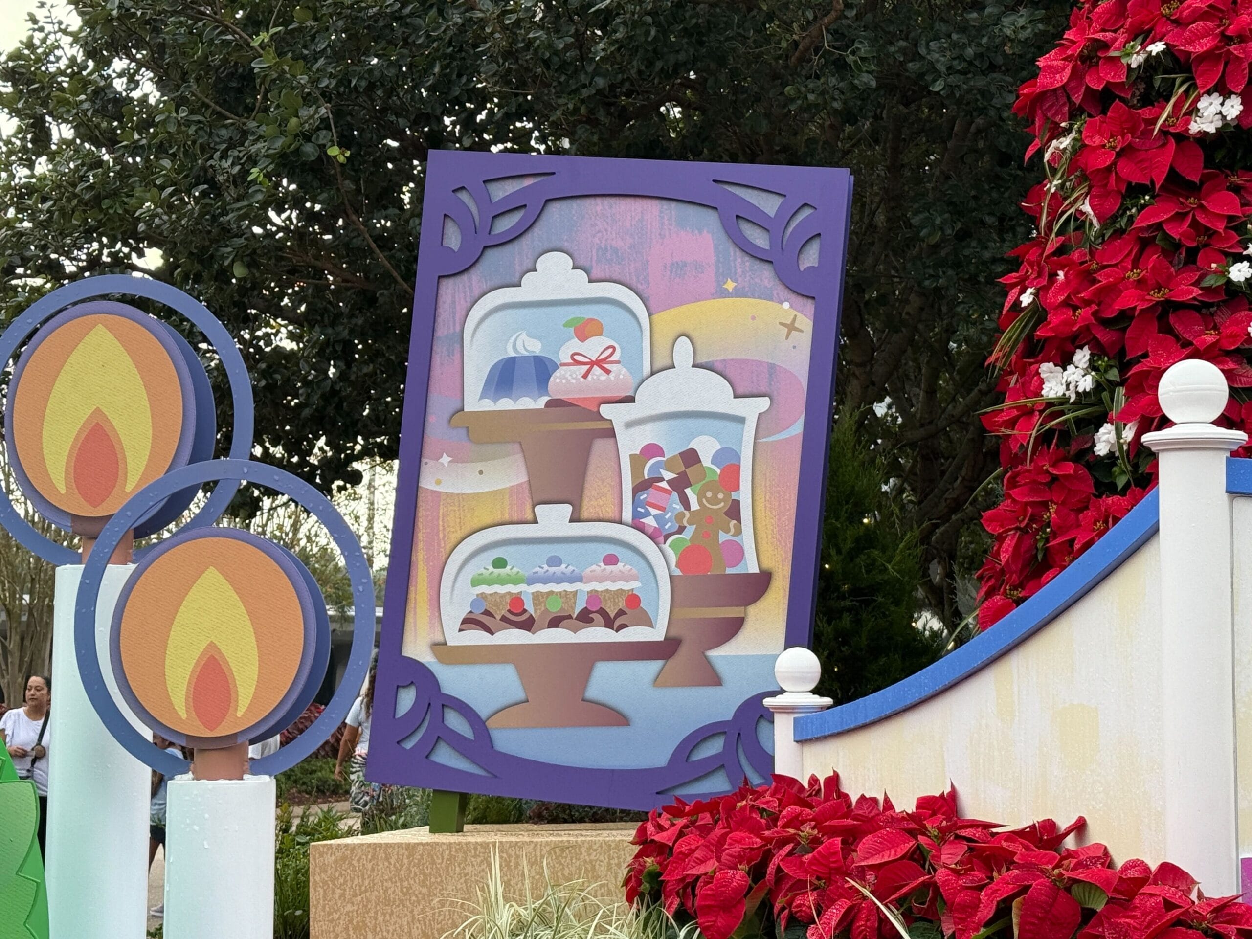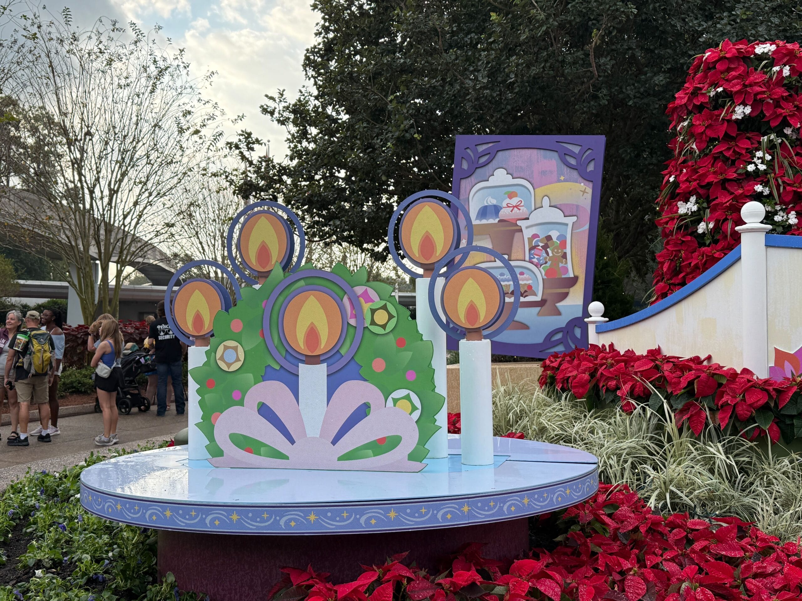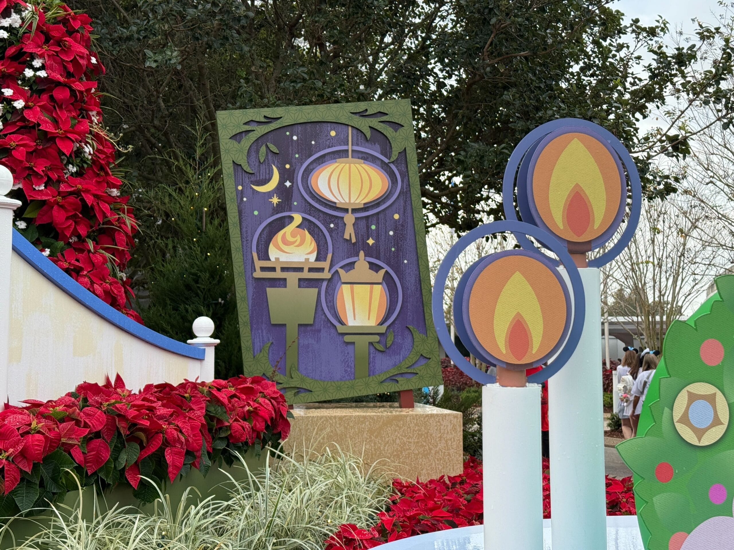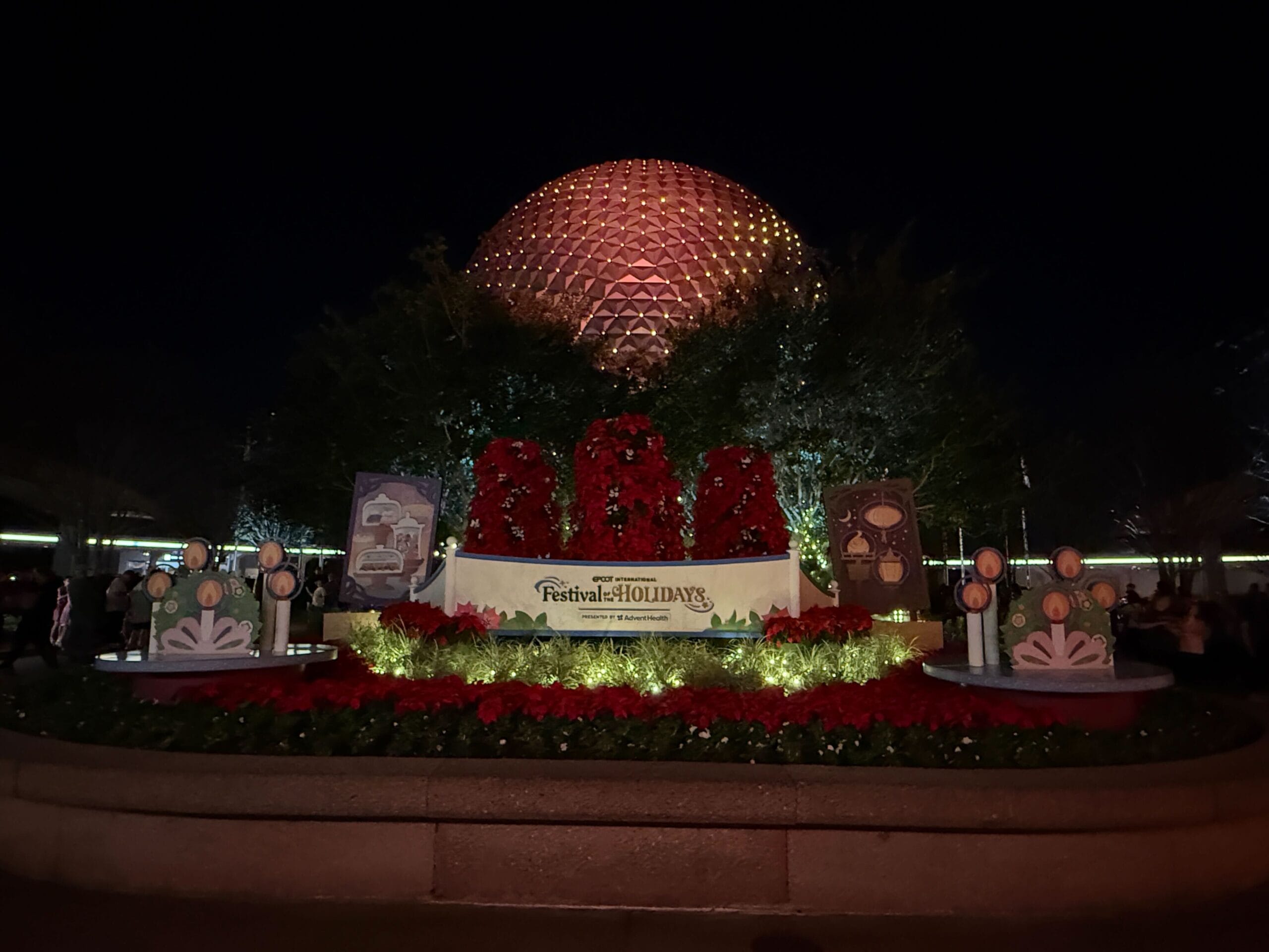 As you enter the park, you’ll see a vibrant display featuring holiday foliage, such as poinsettia plants, and holiday iconography. At the center is a sign that reads EPCOT International Festival of the Holidays Presented by AdventHealth.