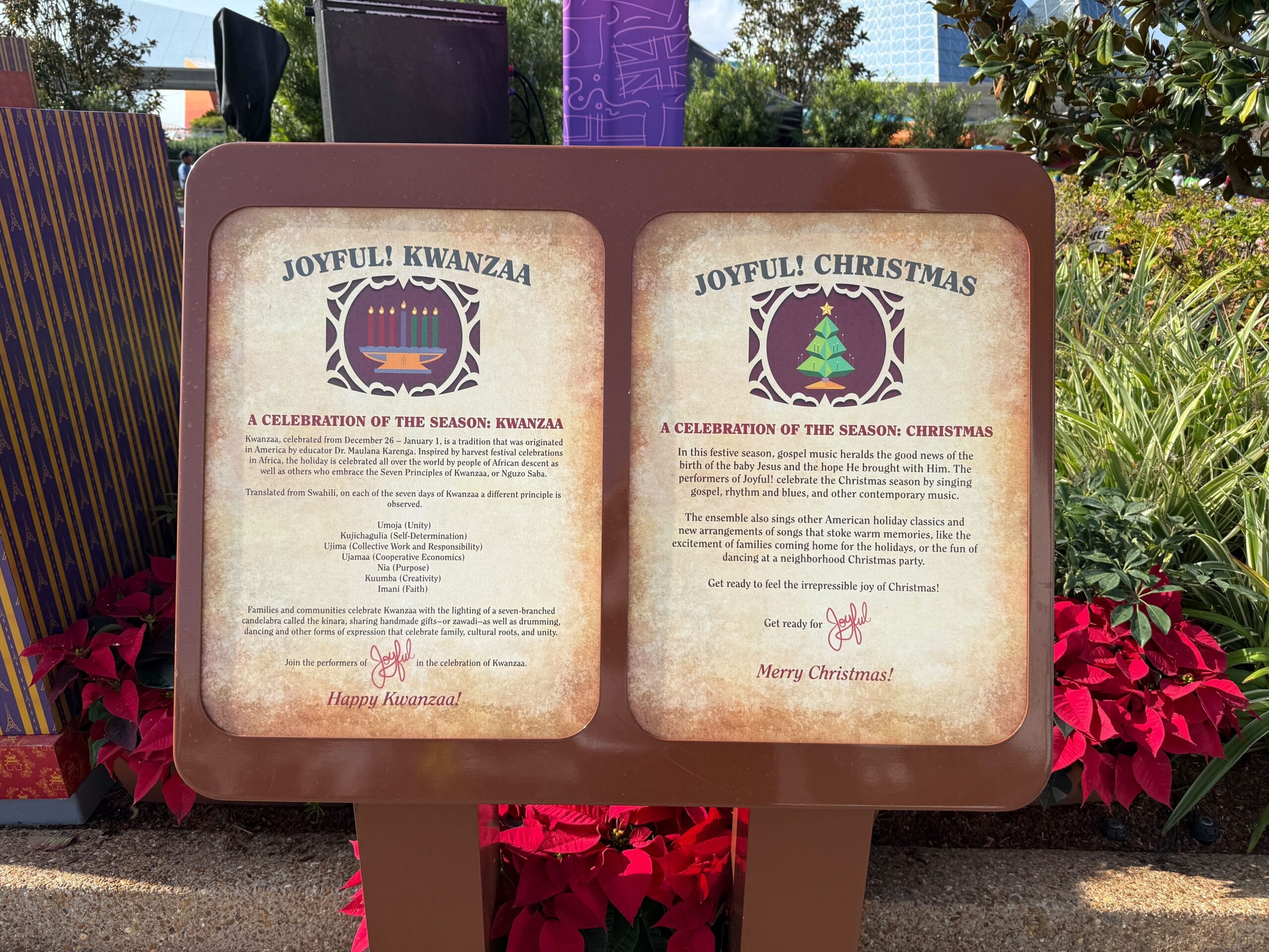 At the nearby CommuniCore Plaza stage, which is set up for “JOYFUL! A Celebration of the Season,” there are signs explaining the show and its celebration of both Kwanzaa and Christmas.
