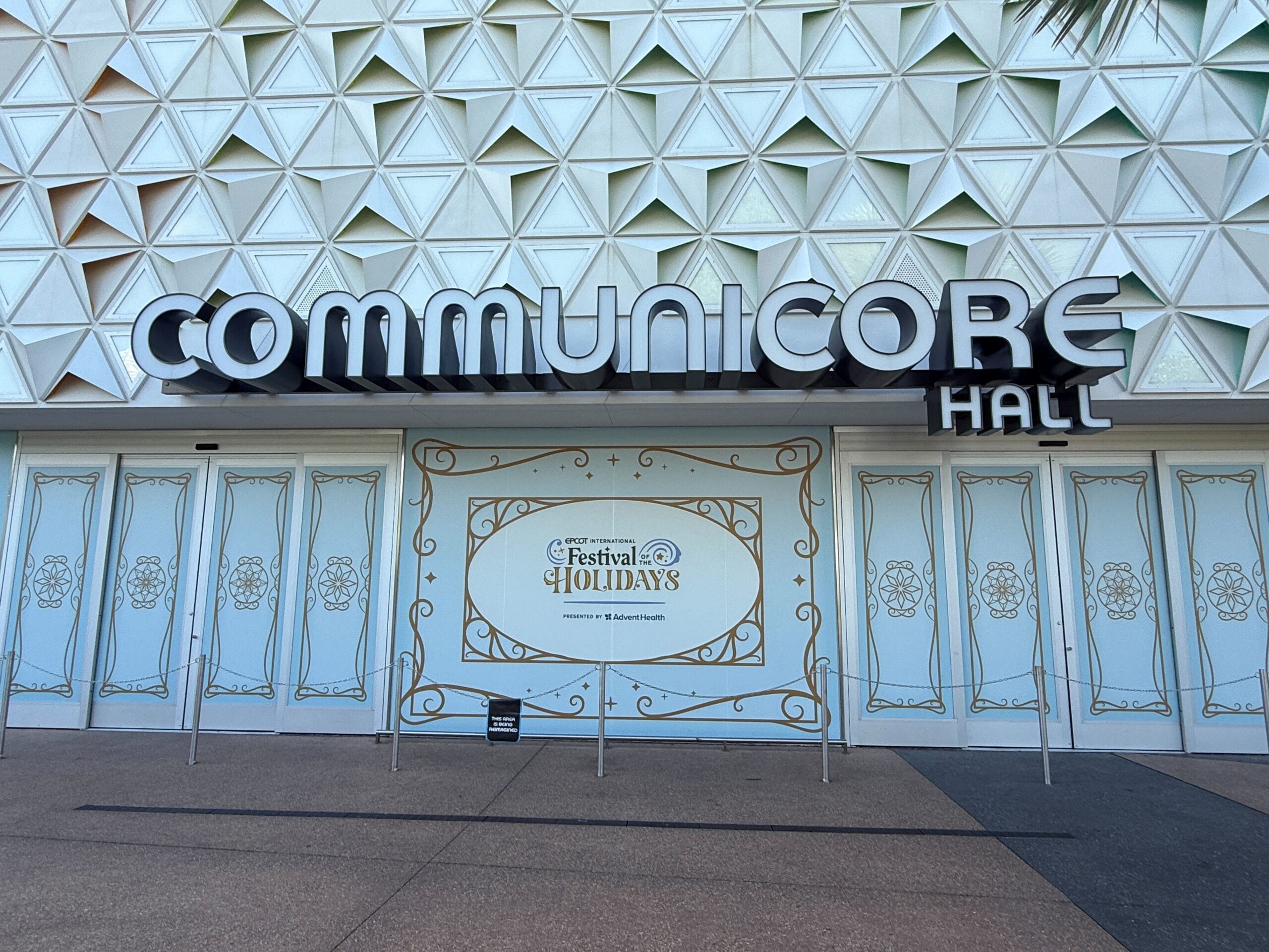 The Odyssey pavilion is also adorned with a variety of holiday-themed images, with the park’s iconic geodesic dome pattern visible in the background.