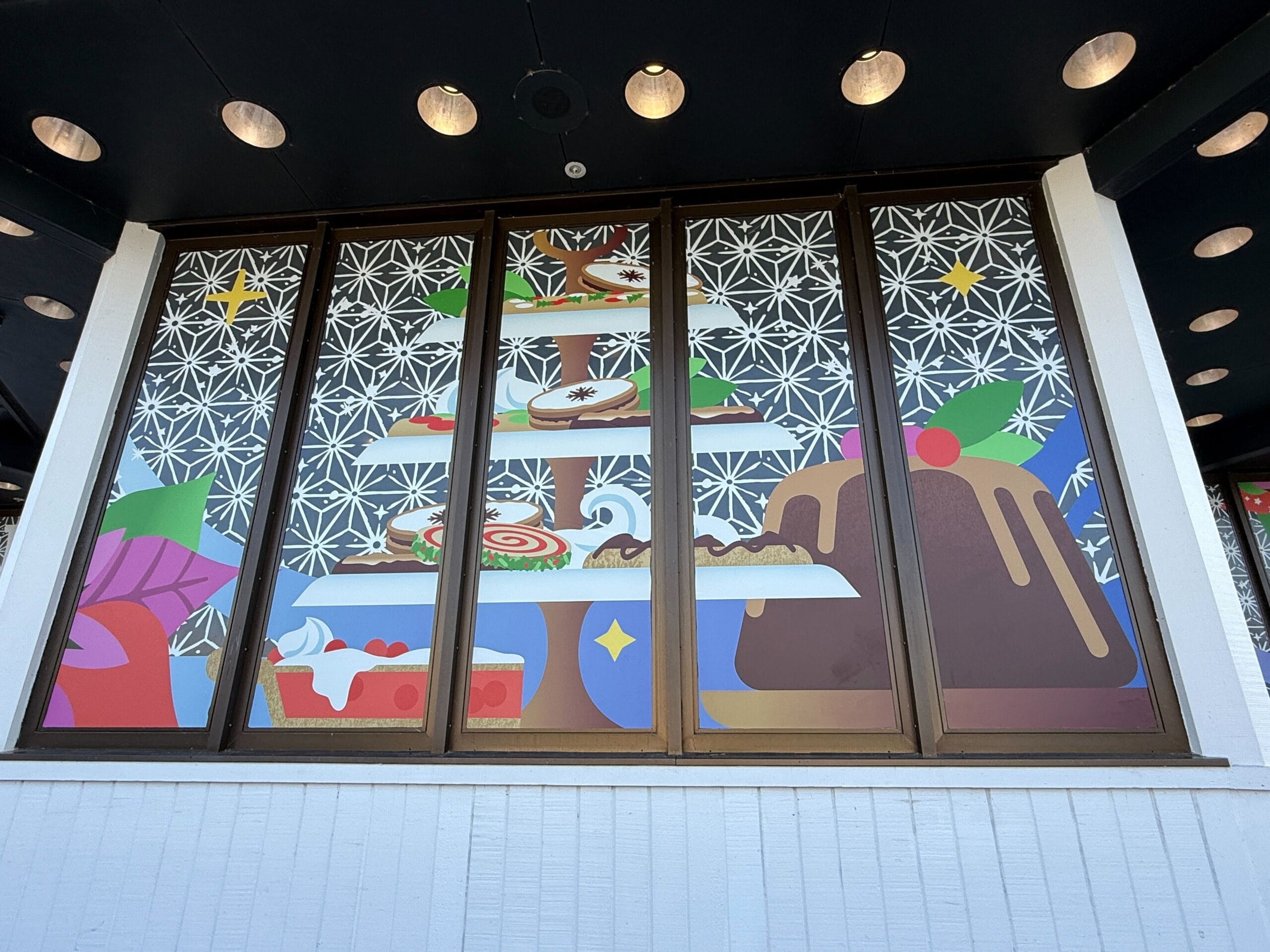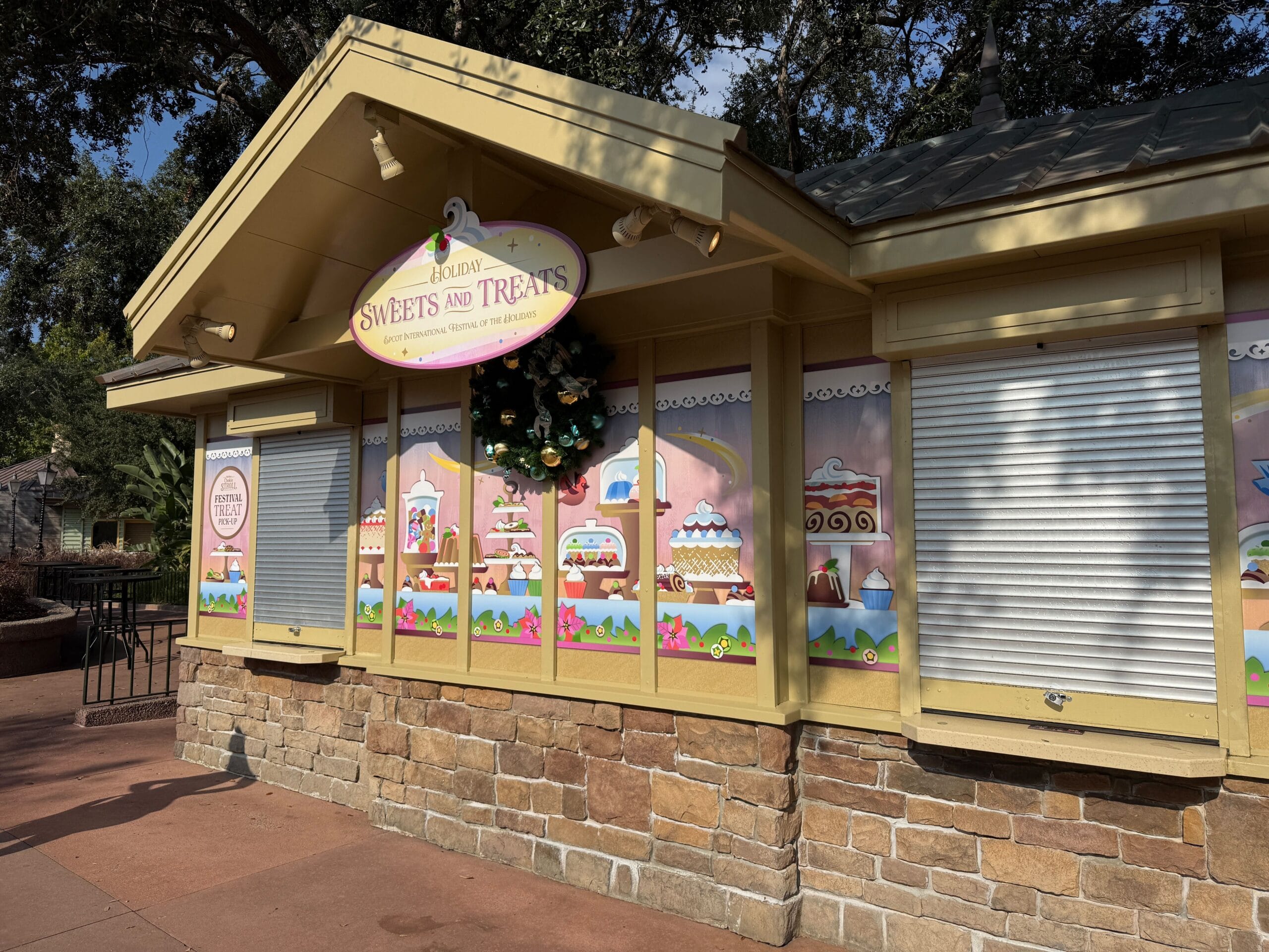 The Holiday Sweets and Treats kiosk is set up to satisfy sweet tooths during the season. Across the front of the kiosk are images of various desserts and sweet treats. At the center, just behind the kiosk sign, is a pine wreath with gold and blue ornaments.