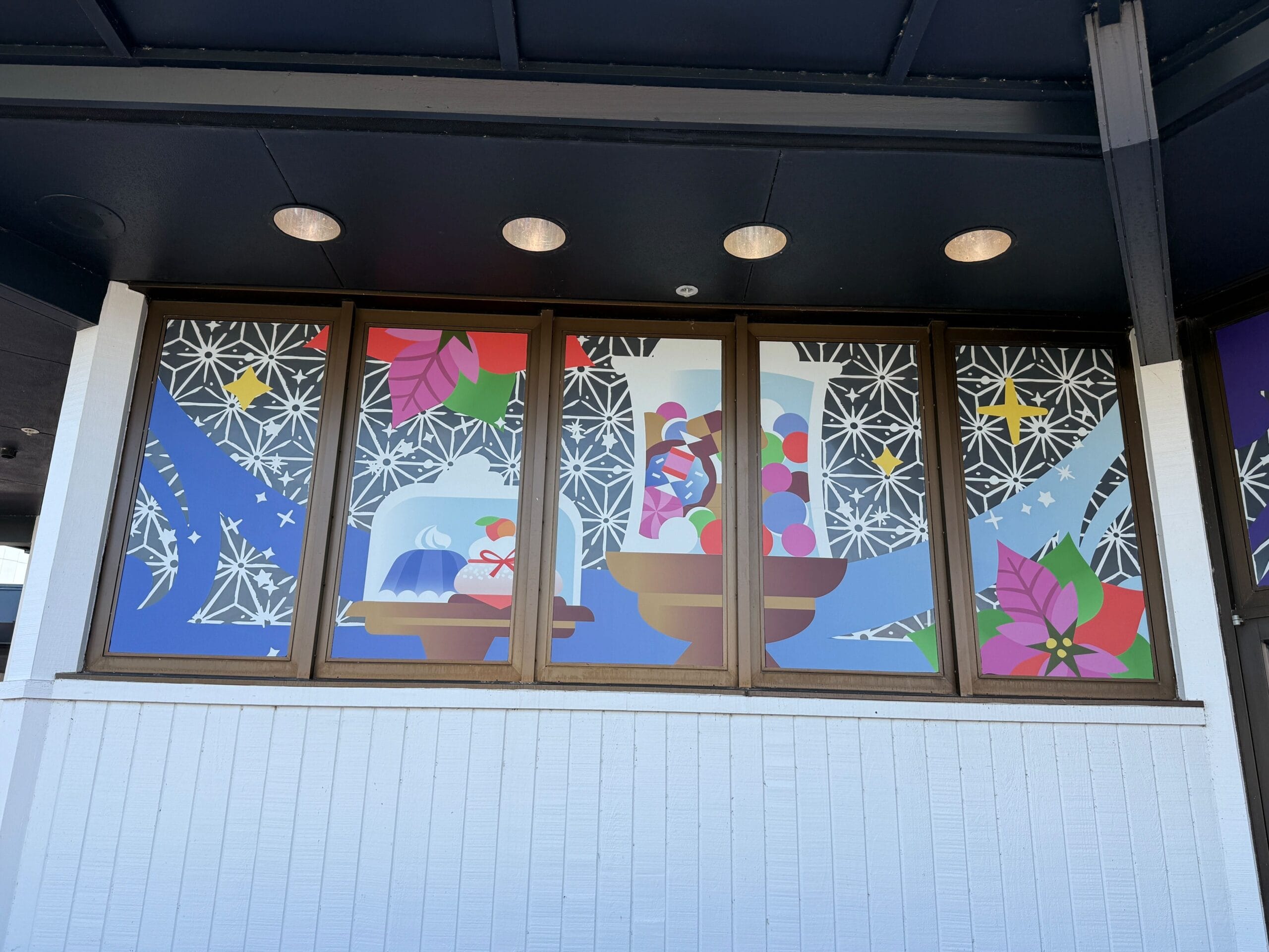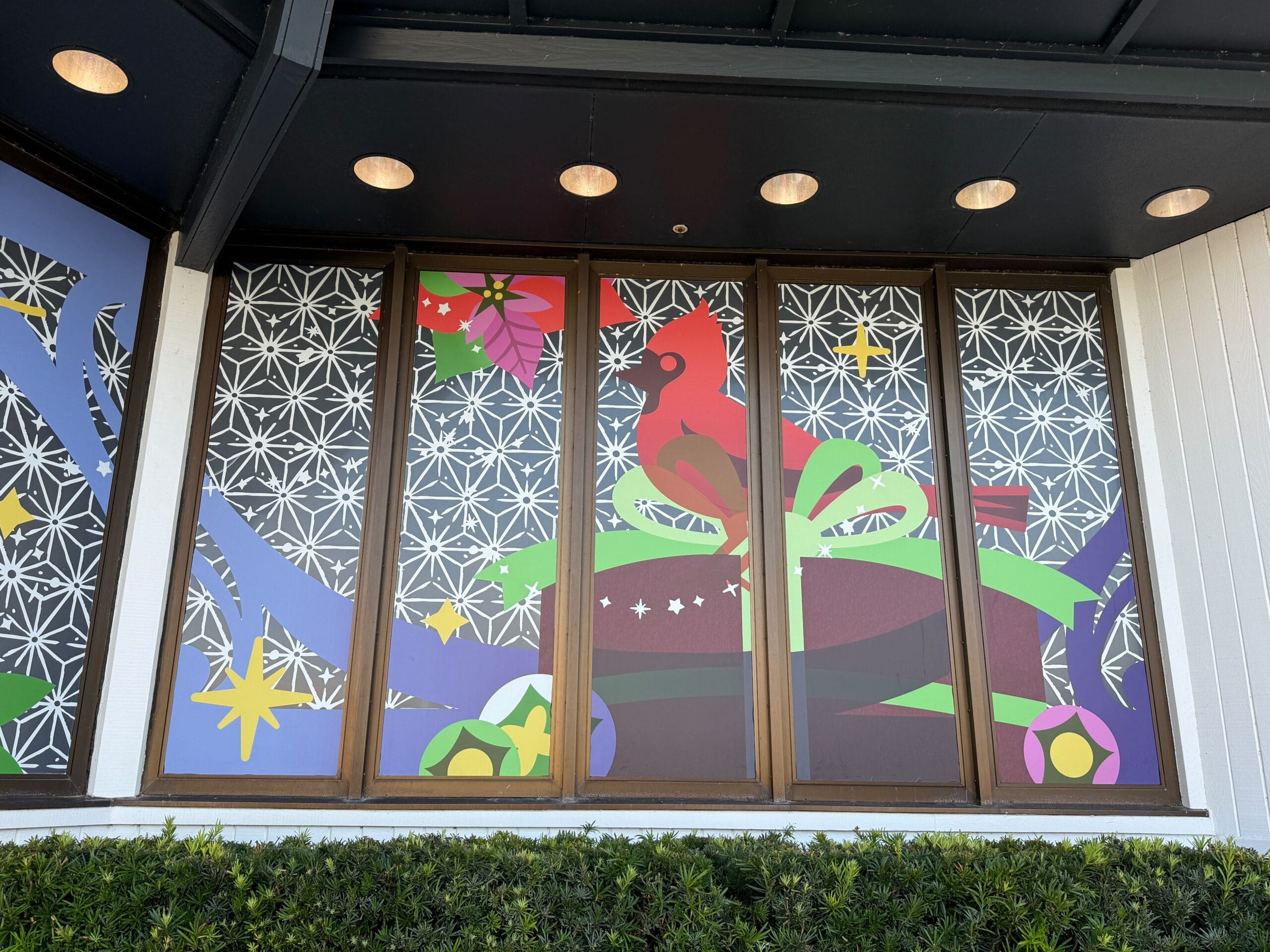 The image panels on the Odyssey pavilion display similar goodies shown elsewhere around the park, such as the torches and lanterns. There are also additional images, such as a cardinal with a burgundy holiday package with a green ribbon.