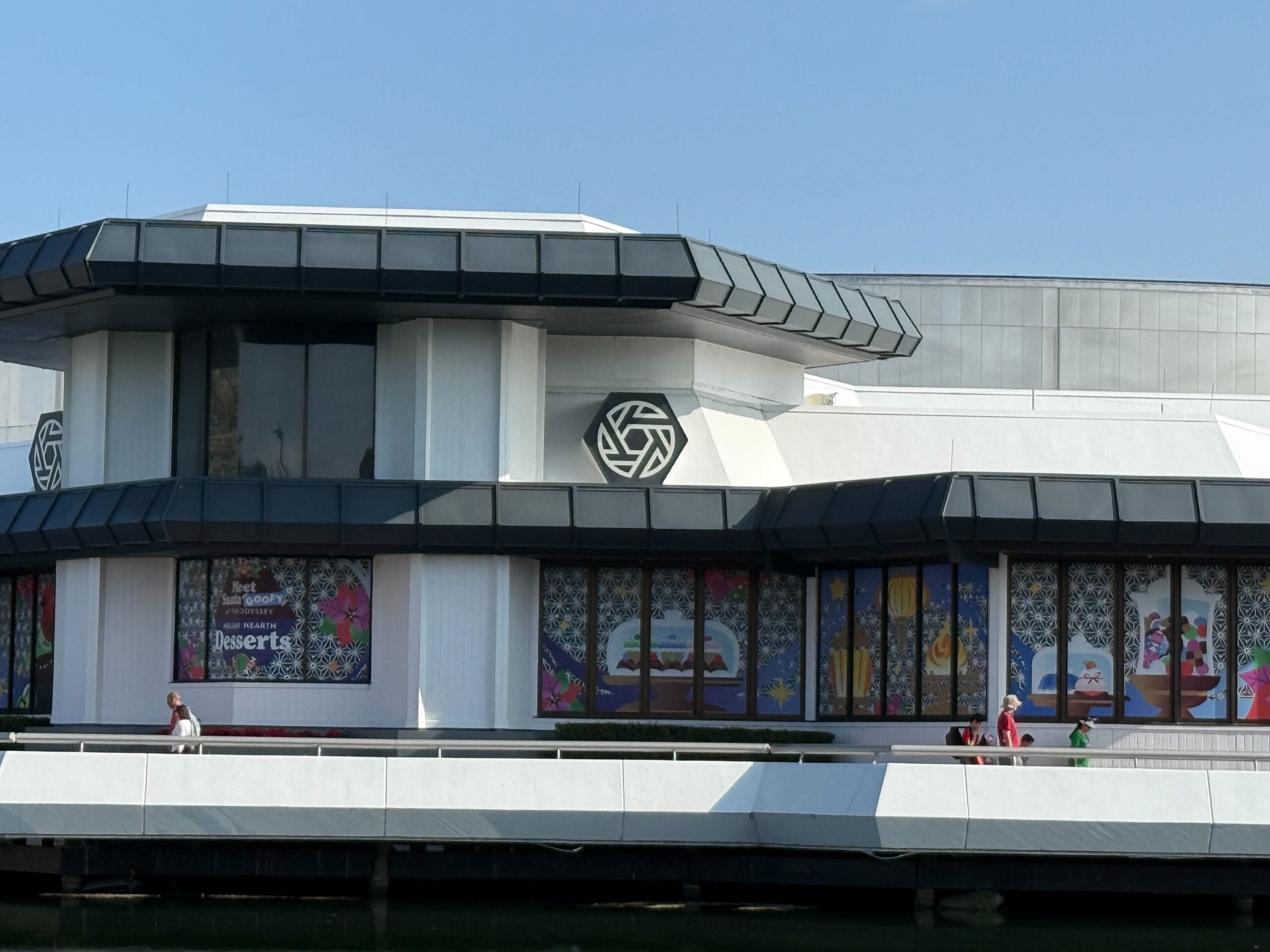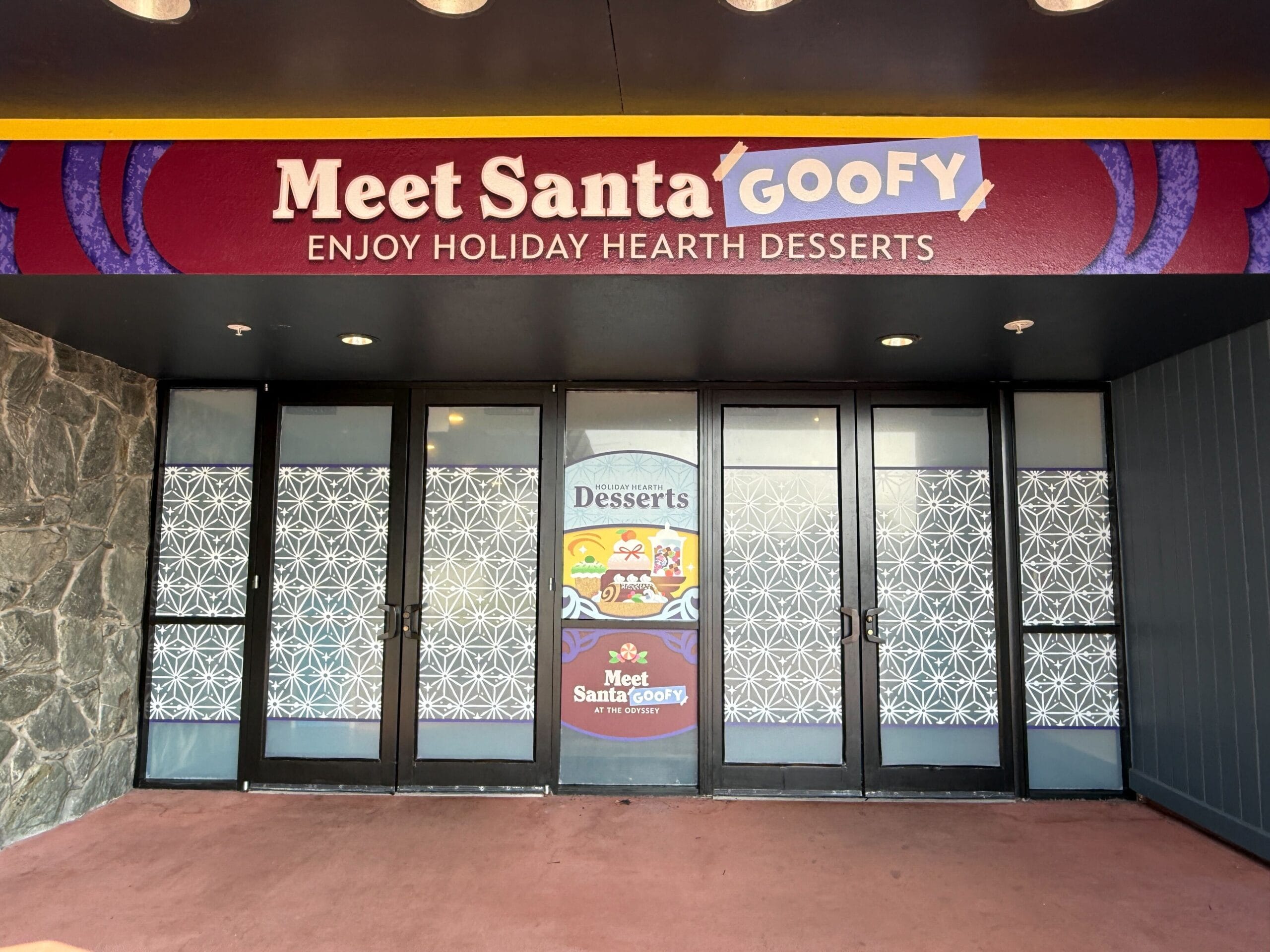 At the front entrance of The Odyssey pavilion, a new sign reads “Meet Santa Goofy” and “Enjoy Holiday Hearth Desserts.” Holiday Hearth Desserts is a special food installation for the Festival of the Holidays.