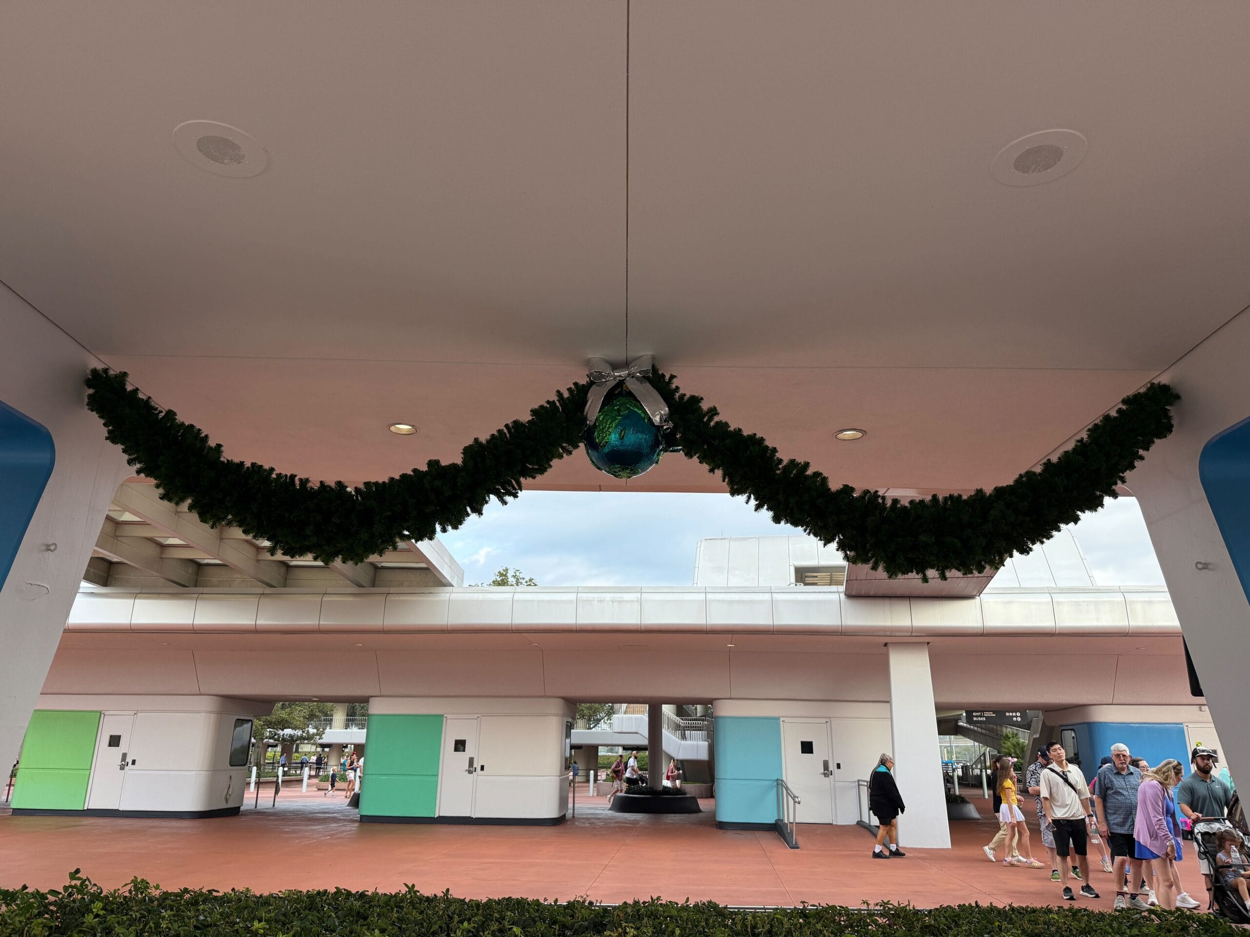 At the EPCOT main entrance, garlands are strung between the walls. At the center of them are oversized globe ornaments with silver bows.