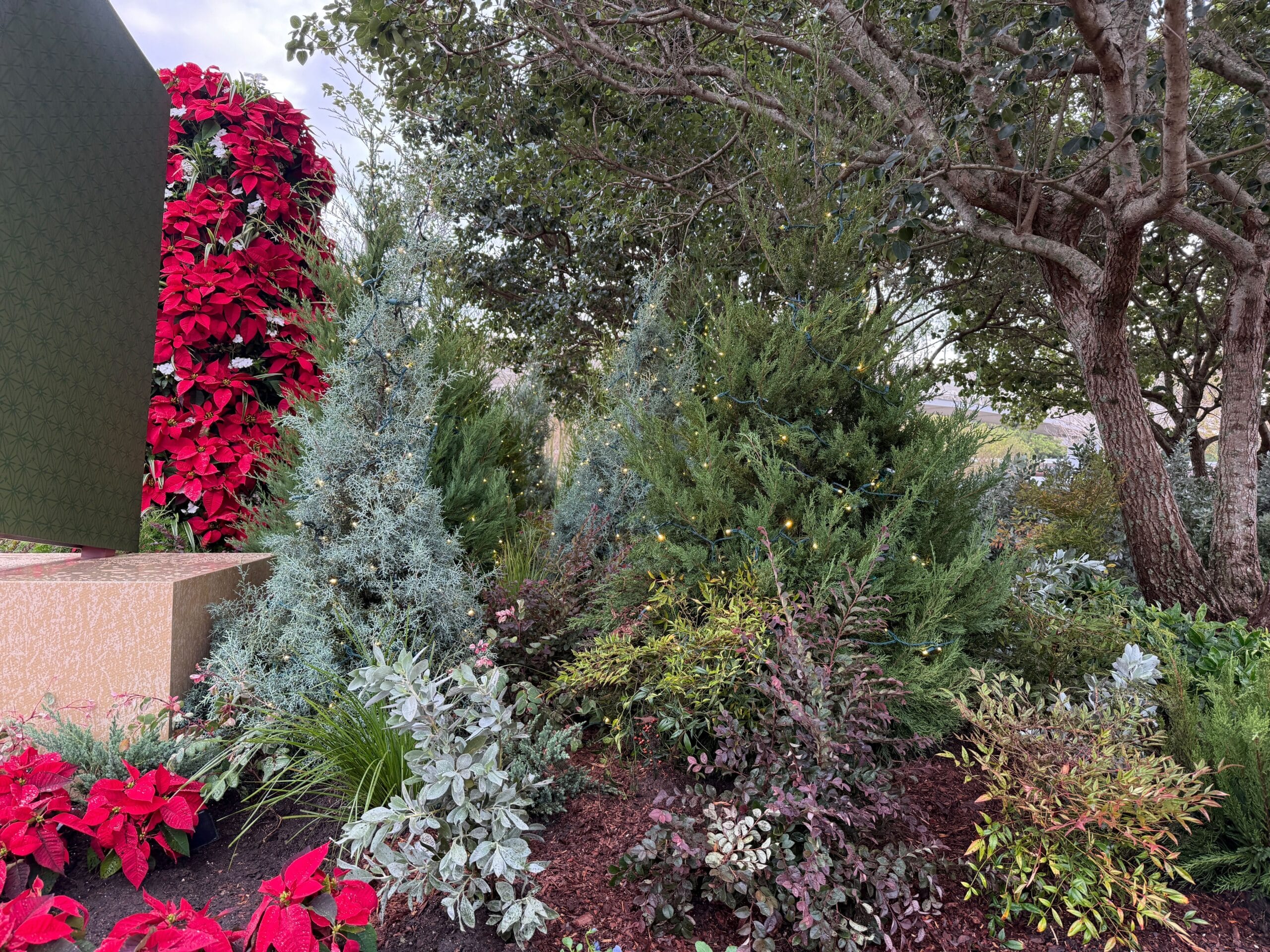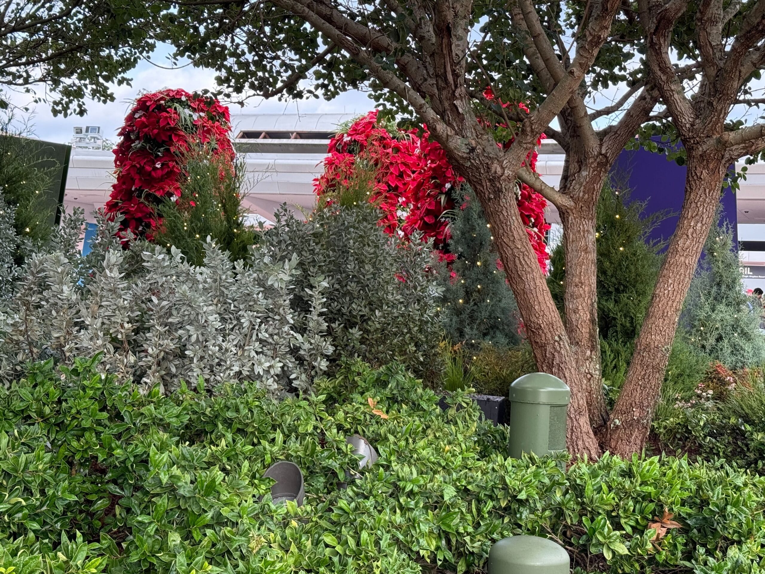 Although hard to spot in the daytime, we noticed trees strung with holiday lights near the front of the park.
