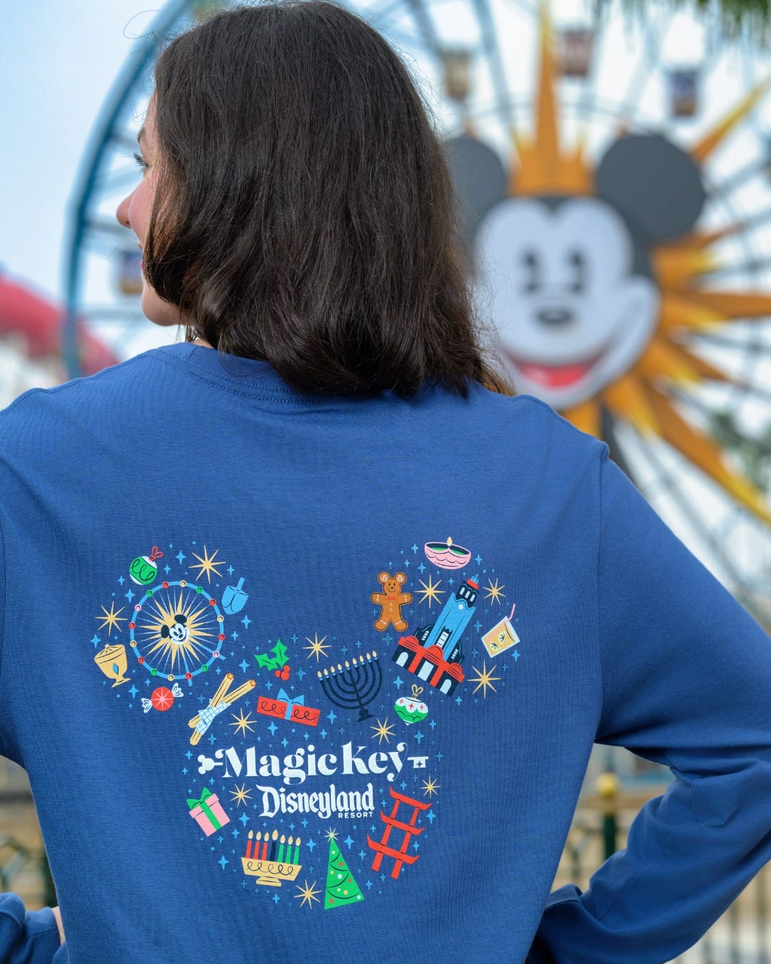 The long-sleeved crewneck is royal blue and features a back graphic of a Mickey head made up of assorted holiday and Disneyland Resort icons. The Magic Key and Disneyland Resort wordmarks are in the center.