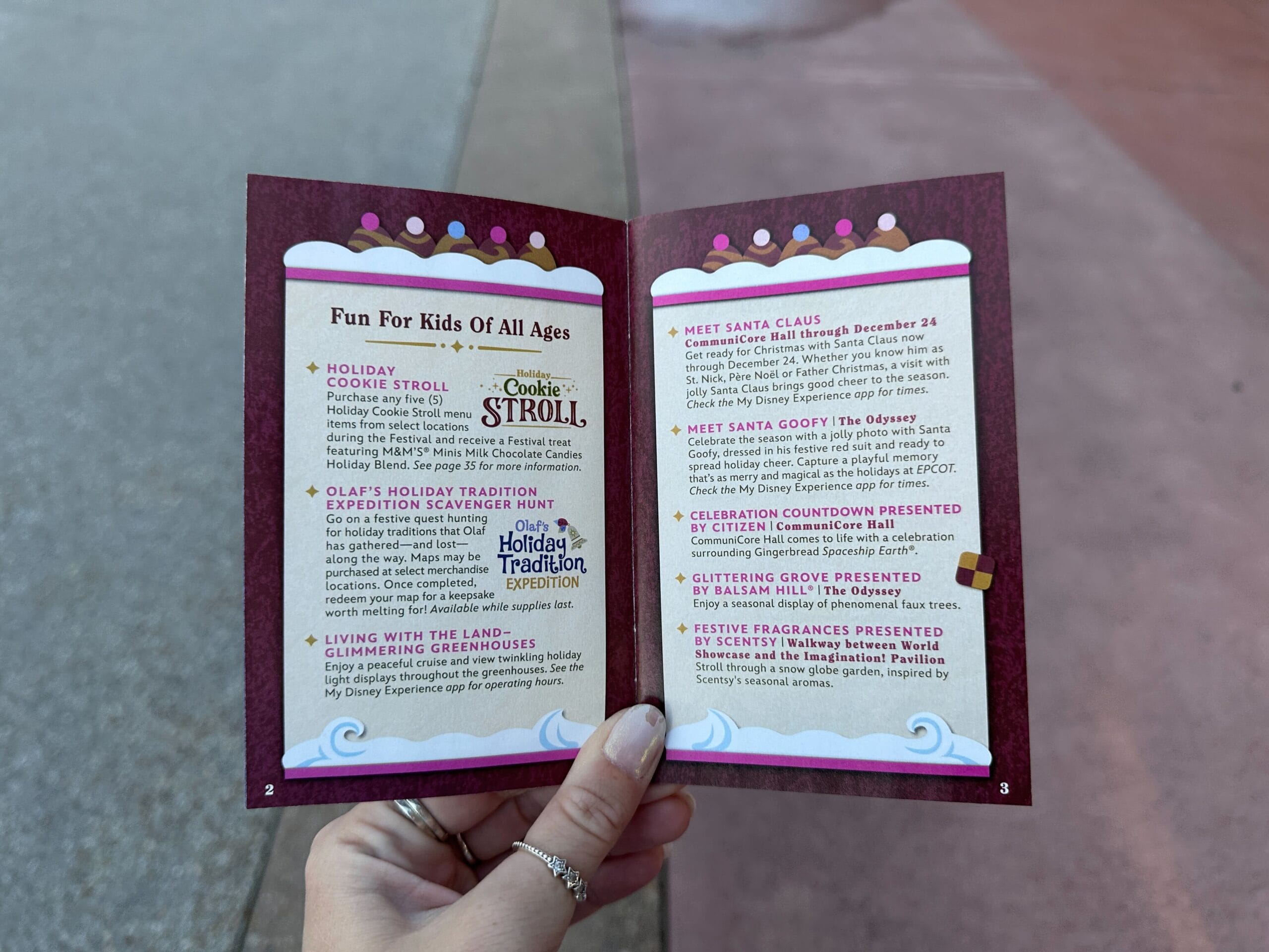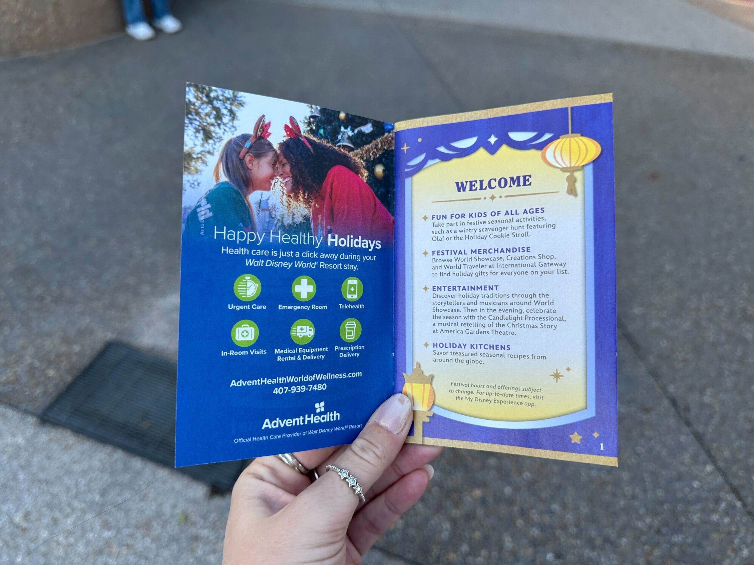 The inside cover has information about AdventHealth, the festival’s sponsor. The first page is an outline of the guide, without page numbers. It lists “Fun For Kids of All Ages,” festival merchandise, entertainment, and Holiday Kitchens.