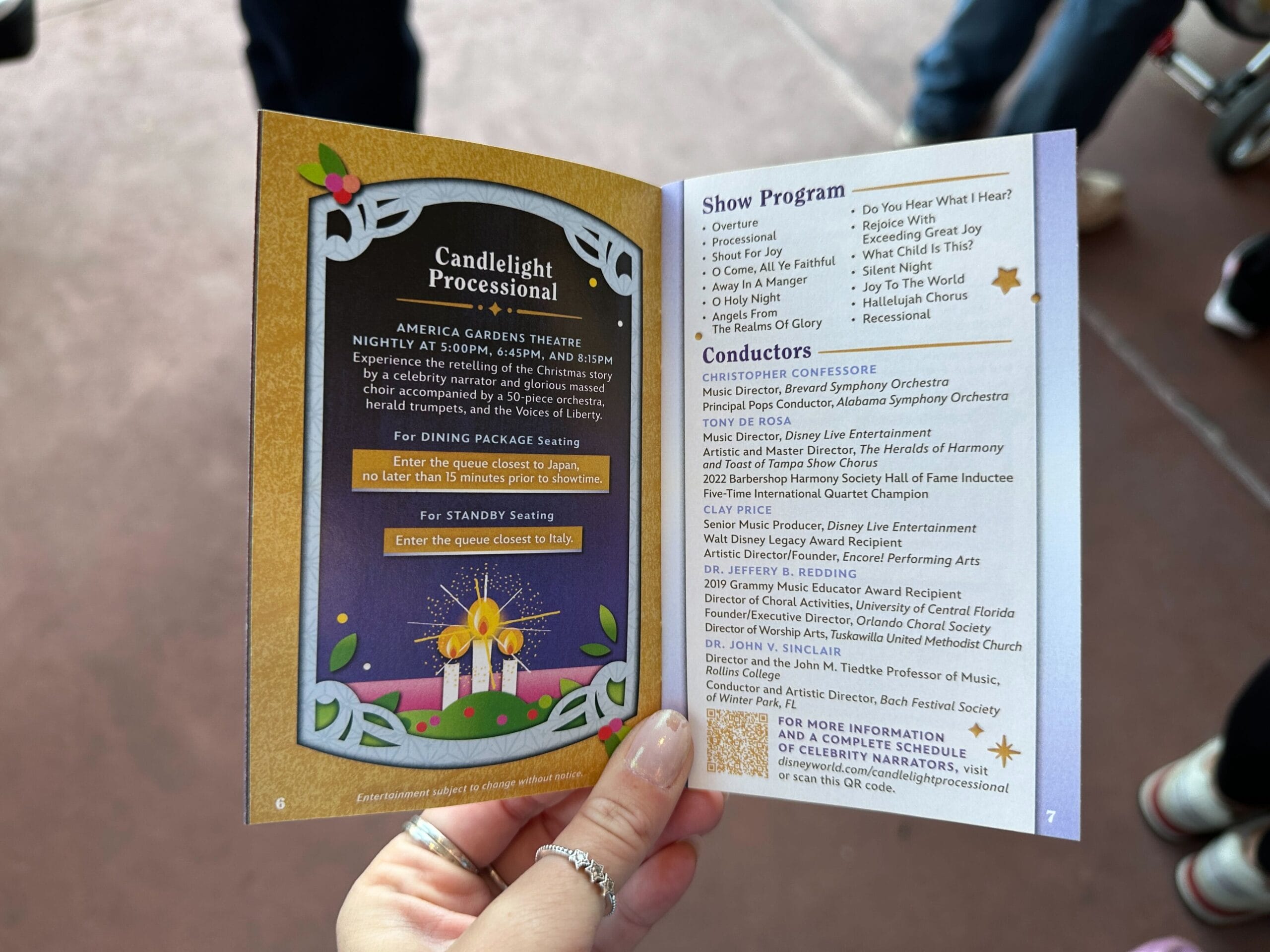 The Candlelight Processional has its own pair of pages, including the show program and conductors. This retelling of the Christmas story is nightly at 5 p.m., 6:45 p.m., and 8:15 p.m. at the America Gardens Theatre.