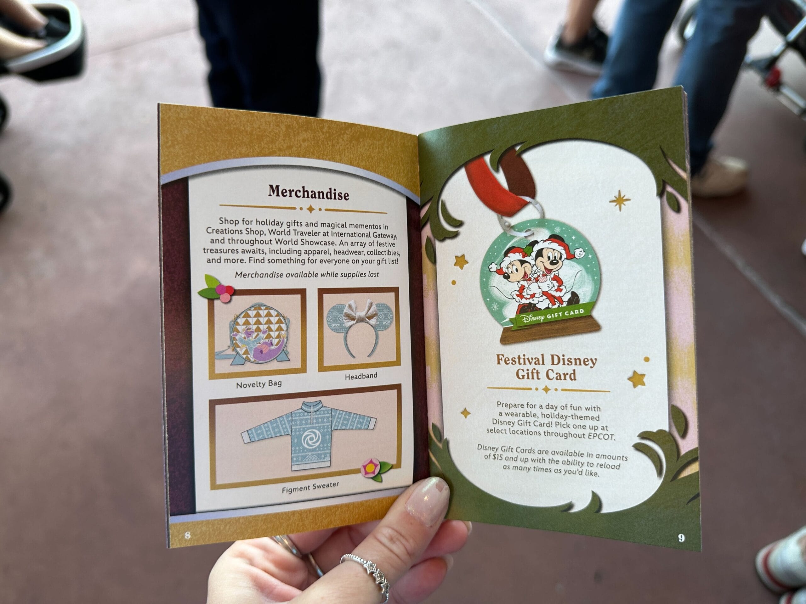 A merchandise preview page includes the Figment purse, ear headband, and sweater. A snow globe-shaped Festival Disney Gift Card will also be available.