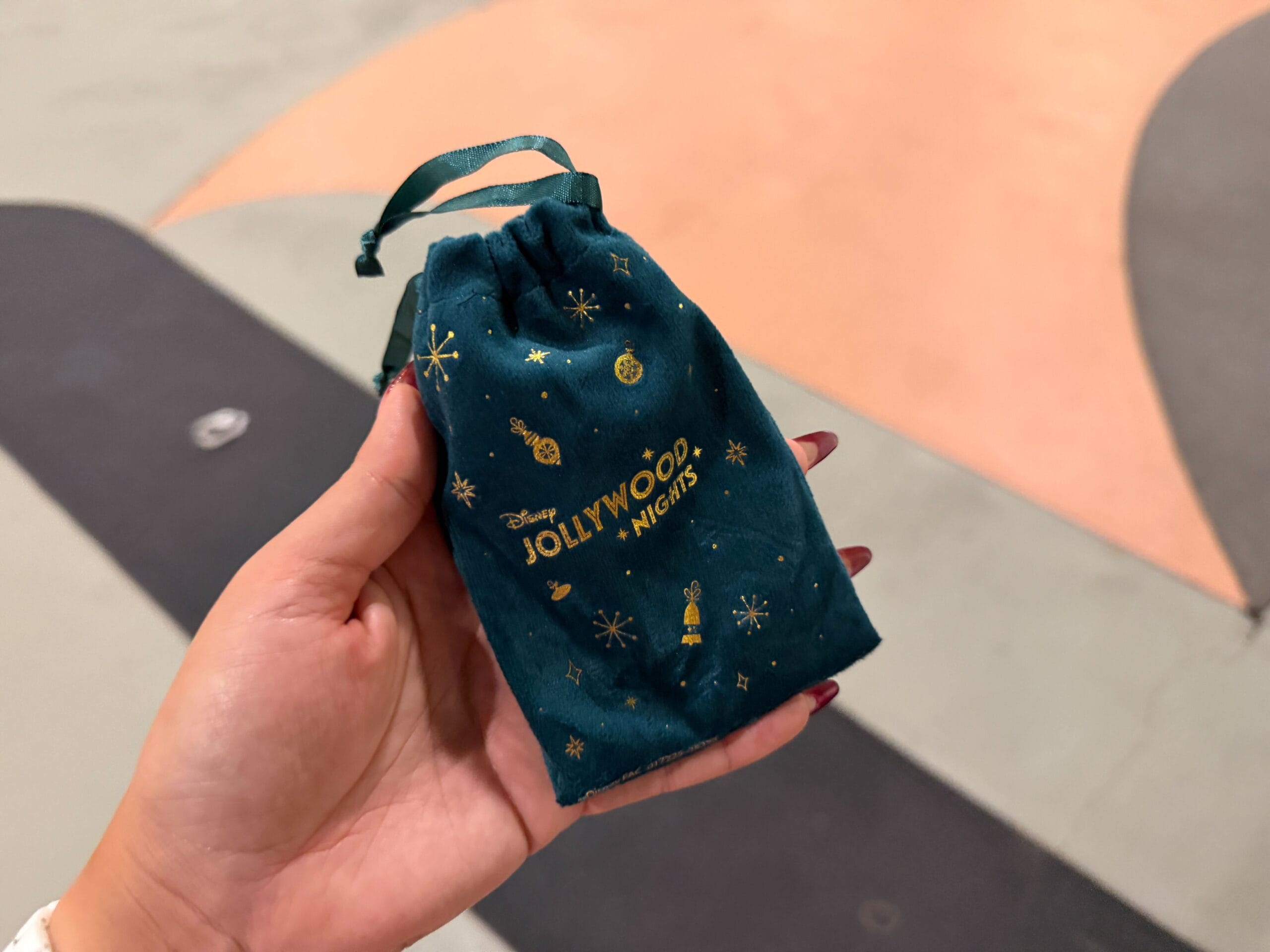 As you leave, you’ll be handed a small deep teal velveteen drawstring bag. It’s patterned all over with metallic gold stars and ornaments, plus the Disney Jollywood Nights wordmark.