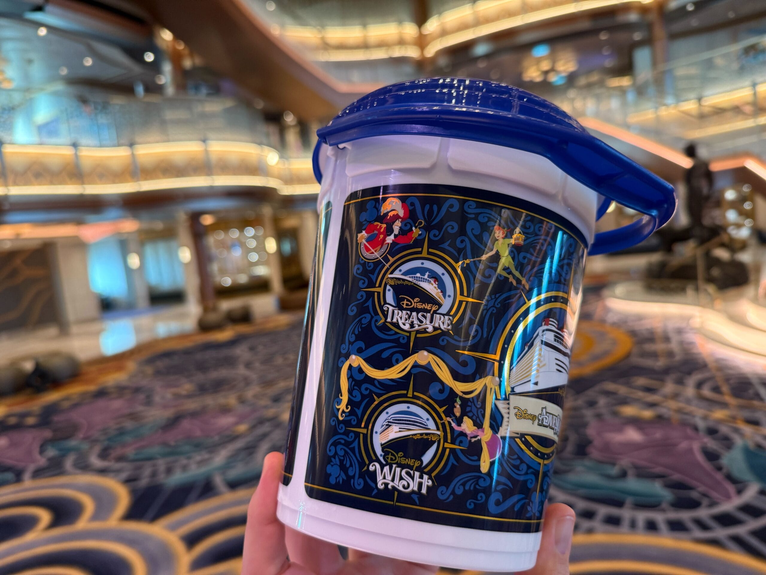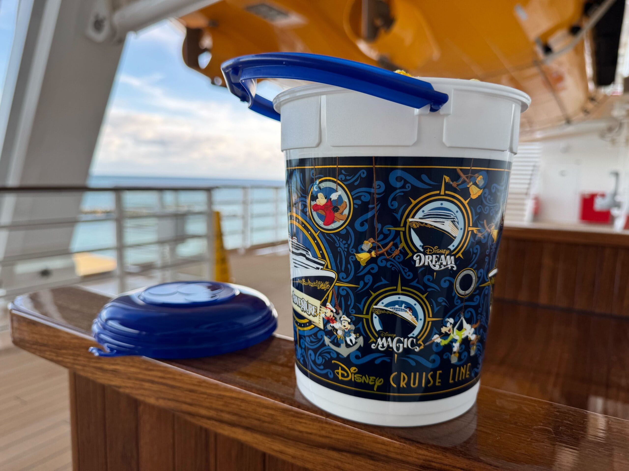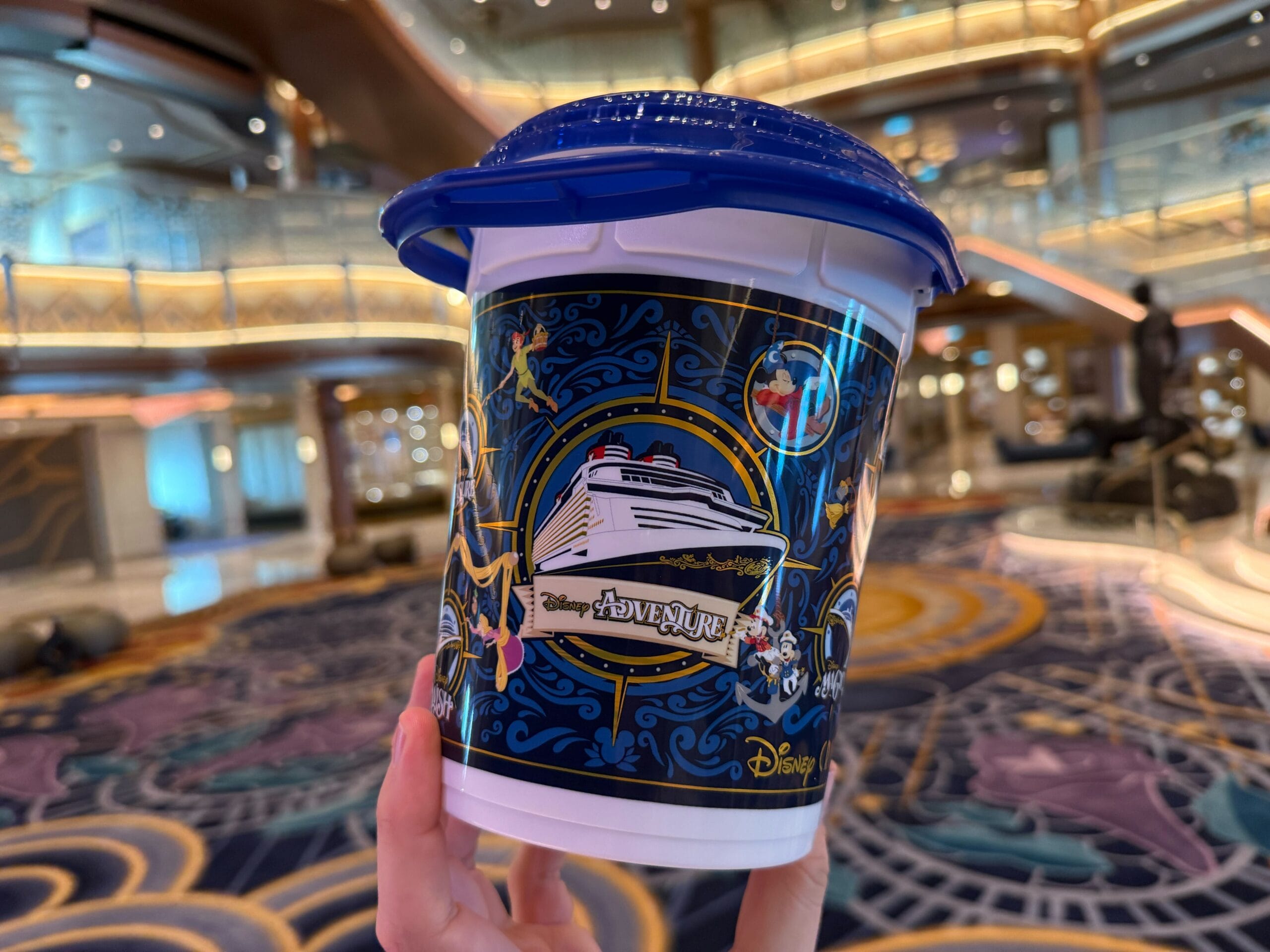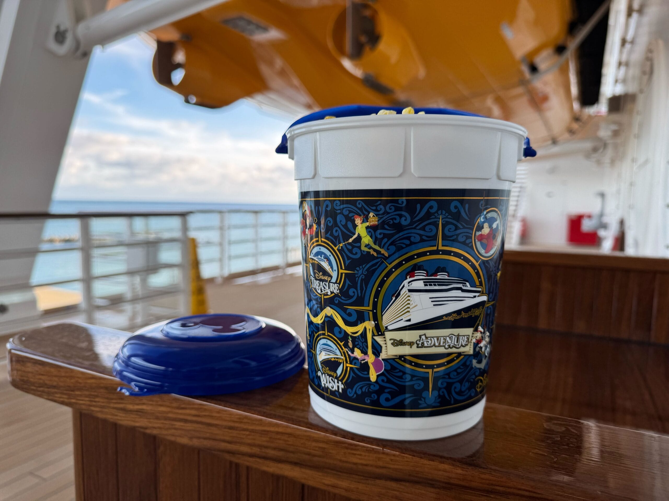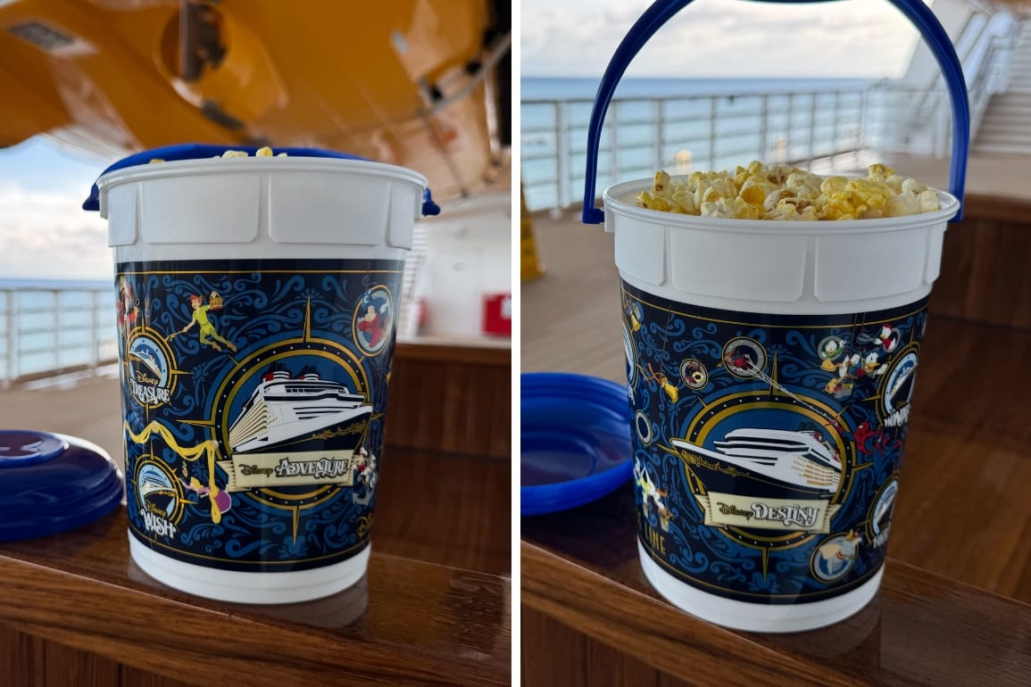 A new Disney Cruise Line popcorn bucket available on the Disney Destiny features not only the newest Wish-class ship, but also the upcoming Disney Adventure.