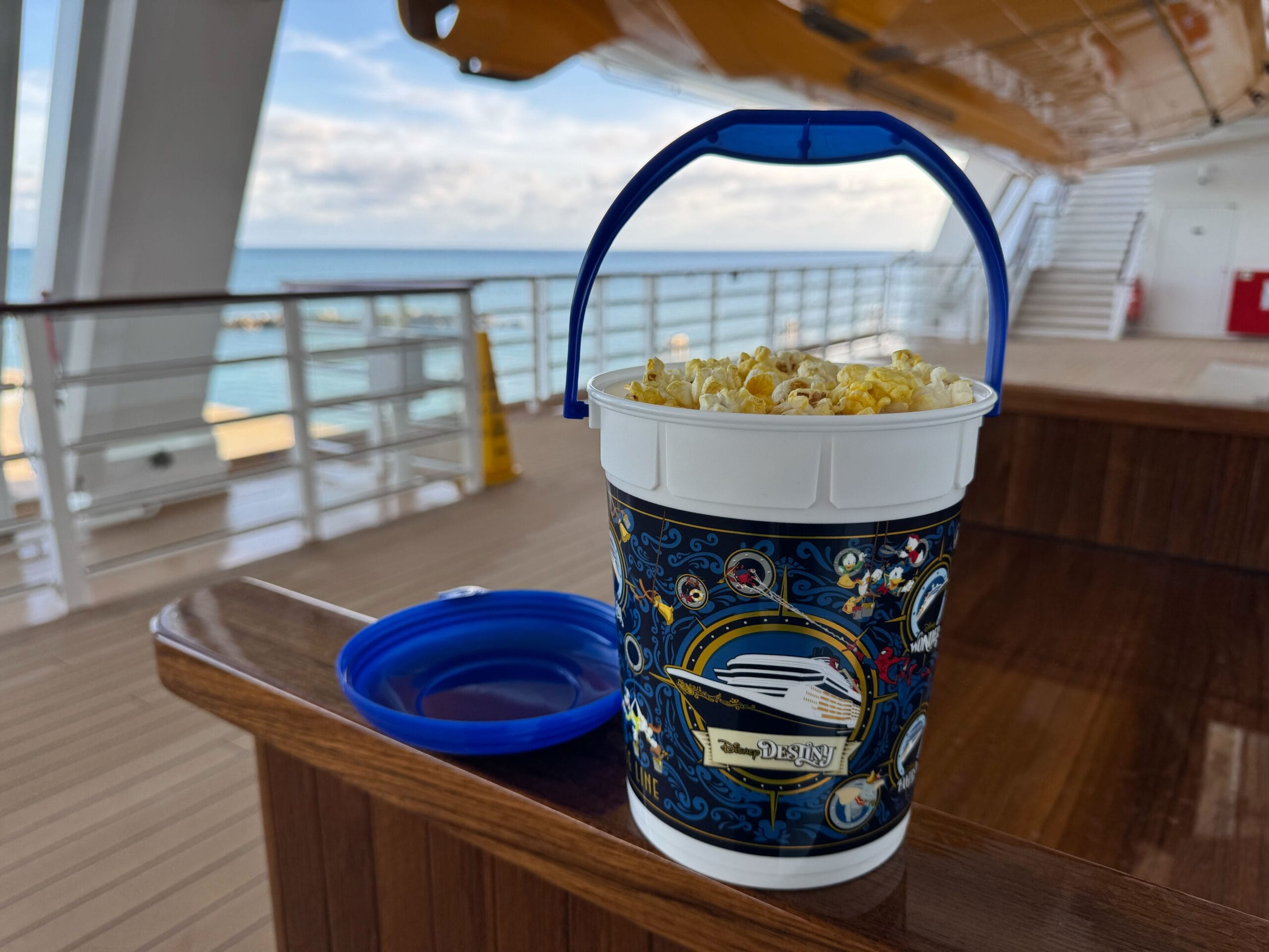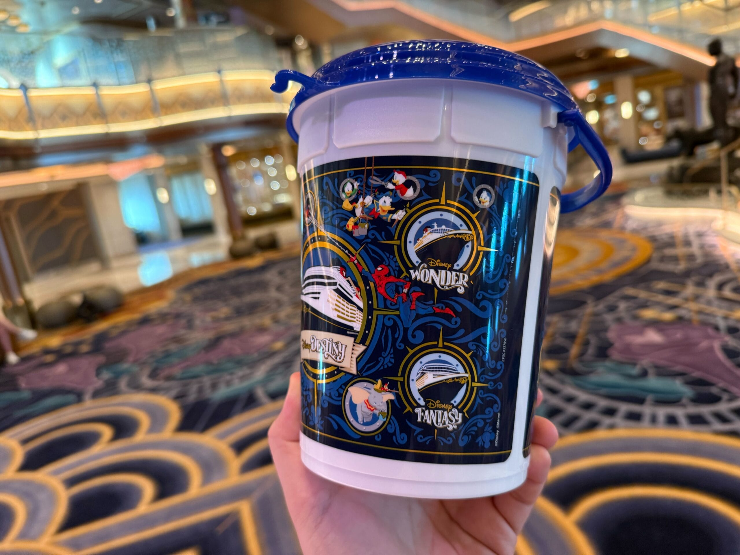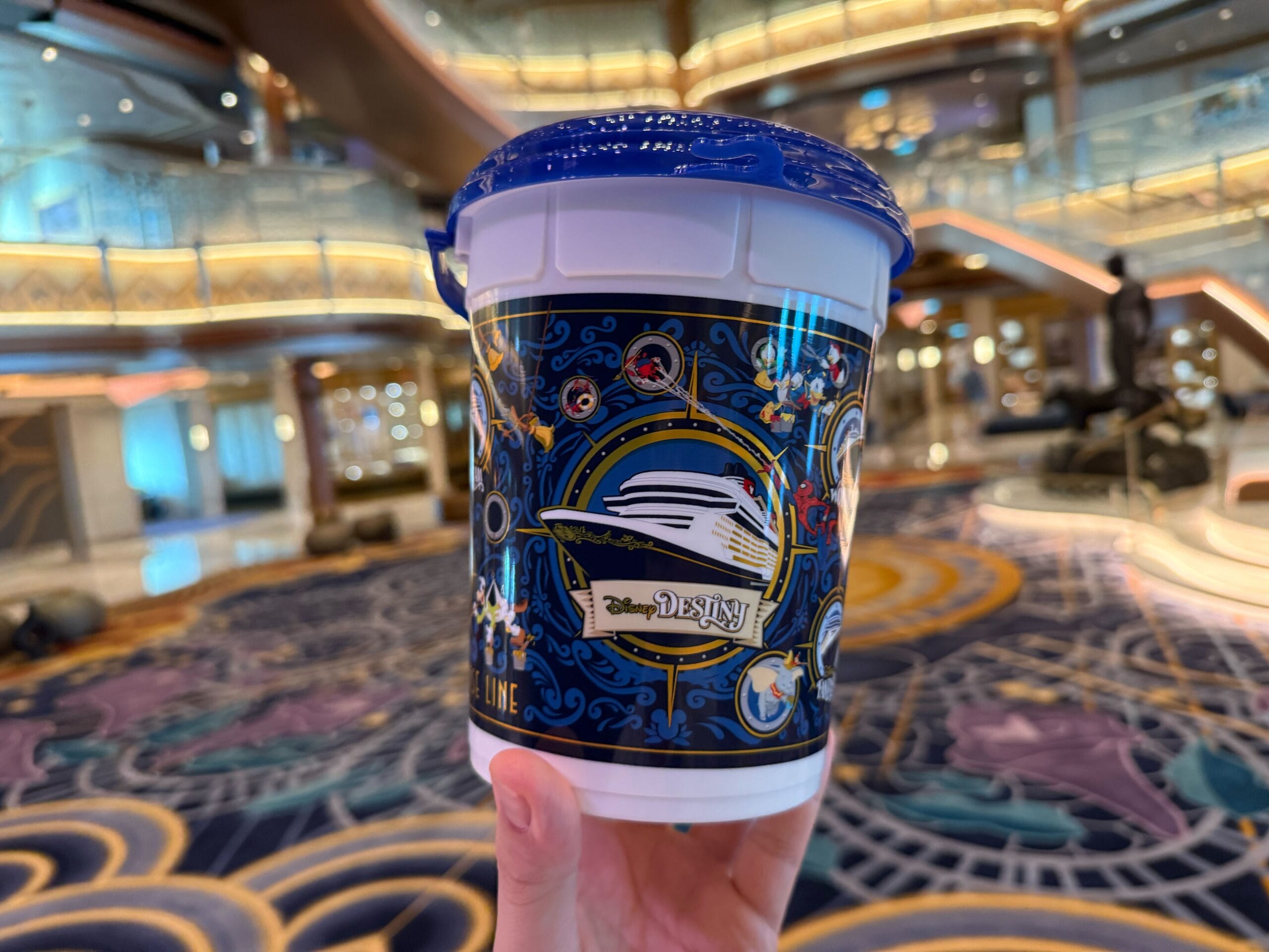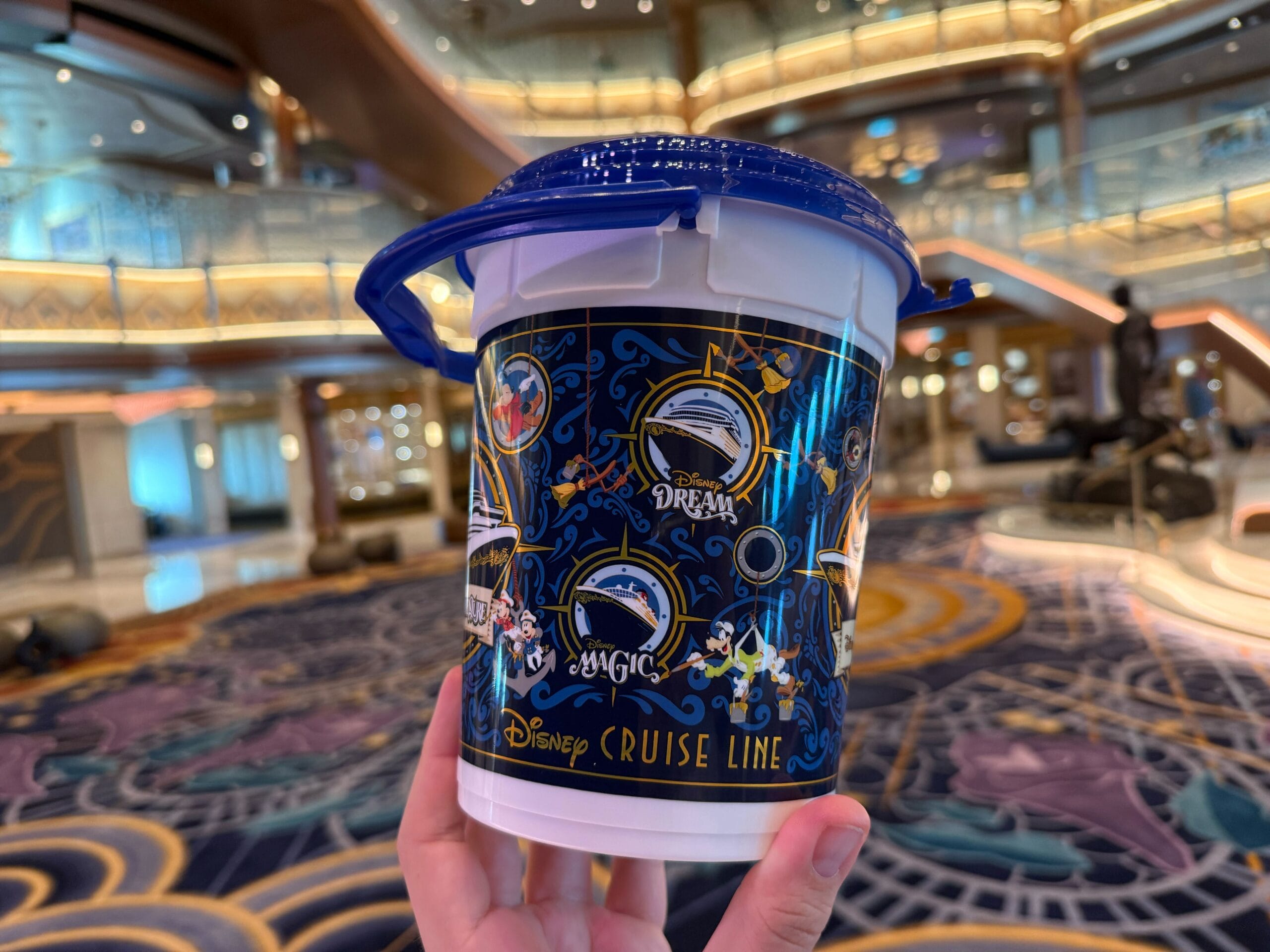 A new Disney Cruise Line popcorn bucket available on the Disney Destiny features not only the newest Wish-class ship, but also the upcoming Disney Adventure.