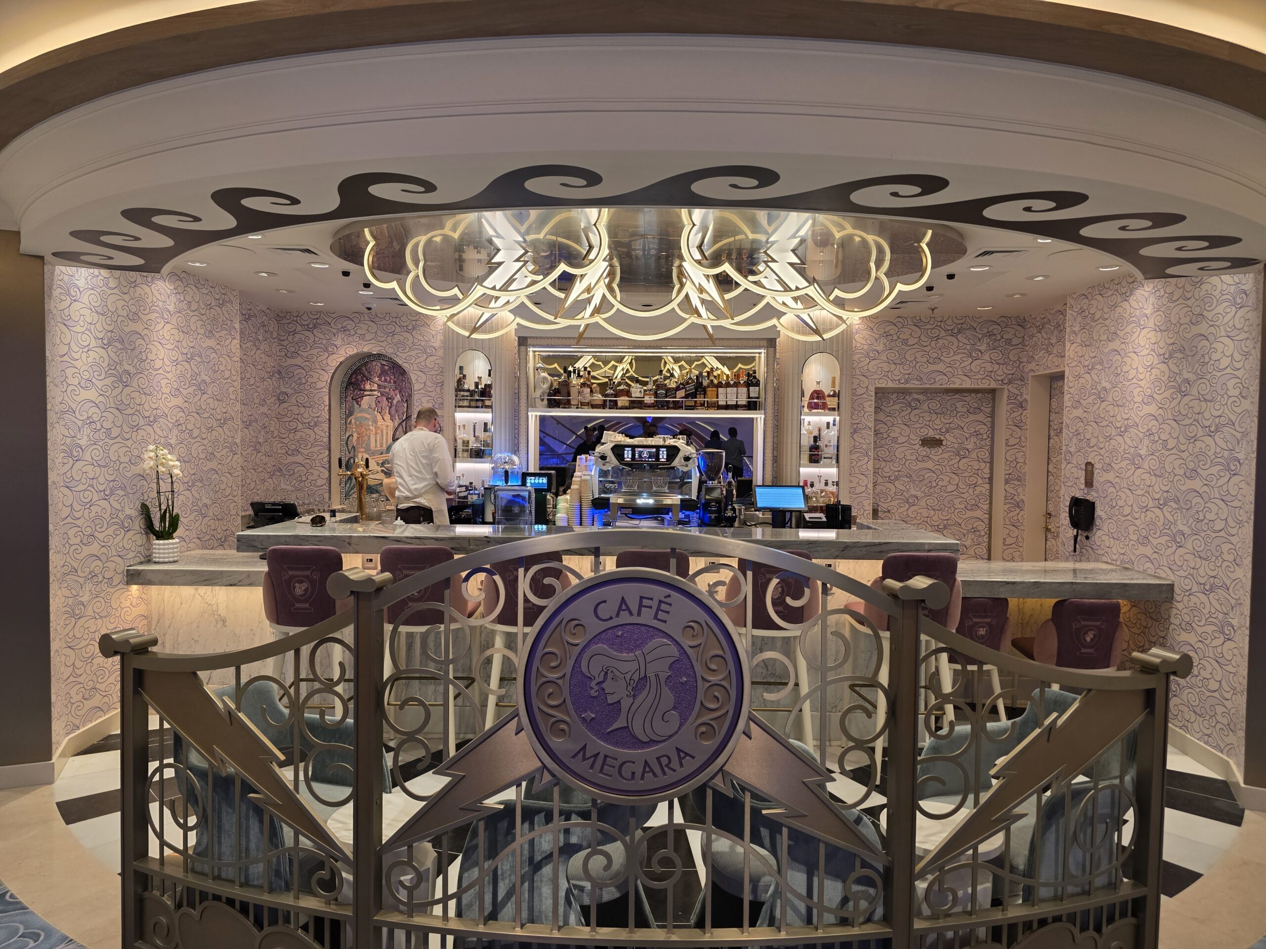 To the left is the Disney Adventure, the one-of-a-kind Adventure class ship that will be sailing out of Singapore starting March 2026 (after being delayed from December 2025). Her distinctive profile emerges from a gold porthole as her stern characters, Captains Mickey and Minnie, sit on an anchor painting “Disney Adventure” onto the banner.