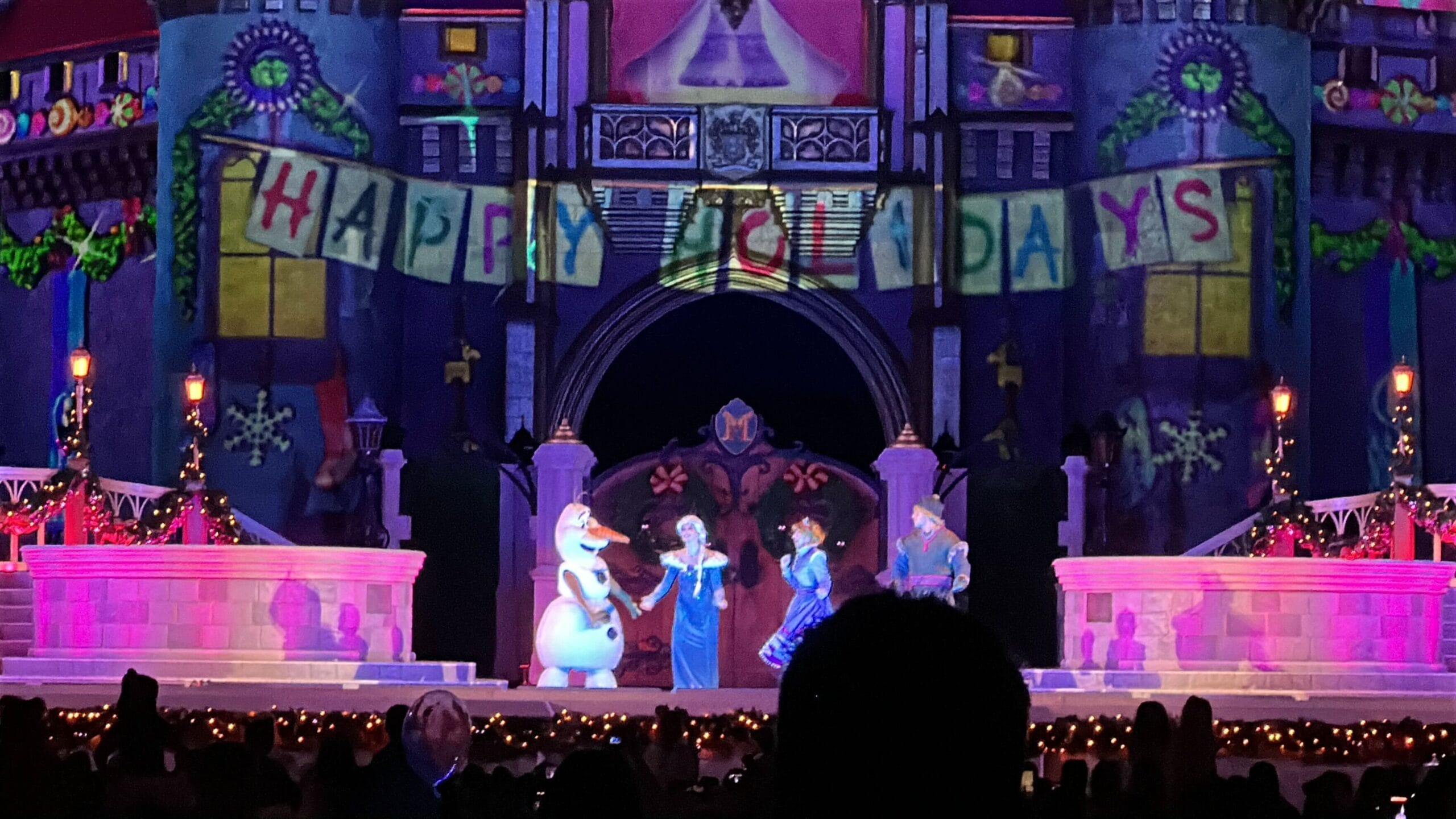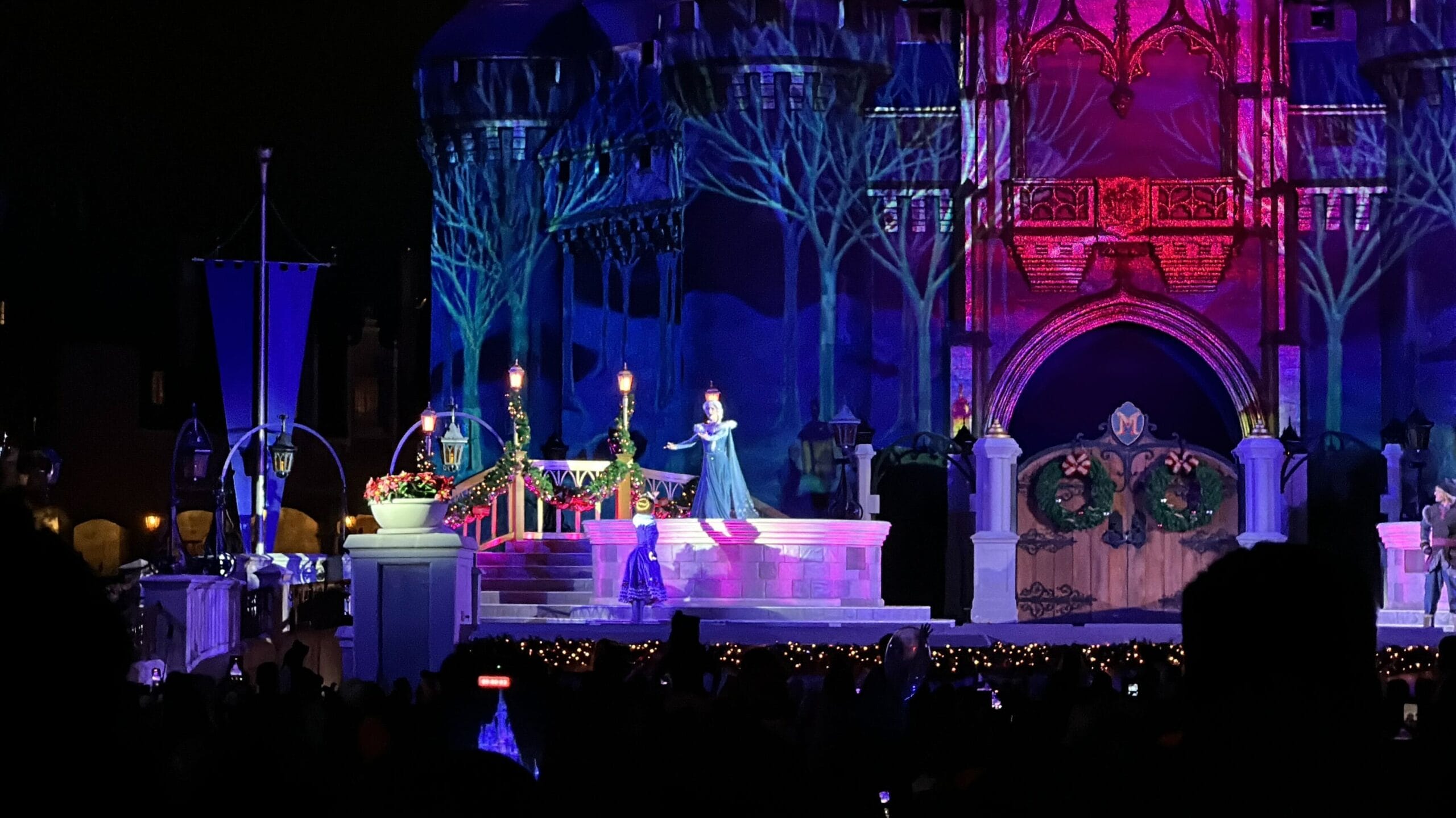 The cast sings “Ring in the Season” and “That Time of Year” from the 2017 animated short. Cinderella Castle is transformed by Elsa’s “magic” during the show via projections and fireworks.