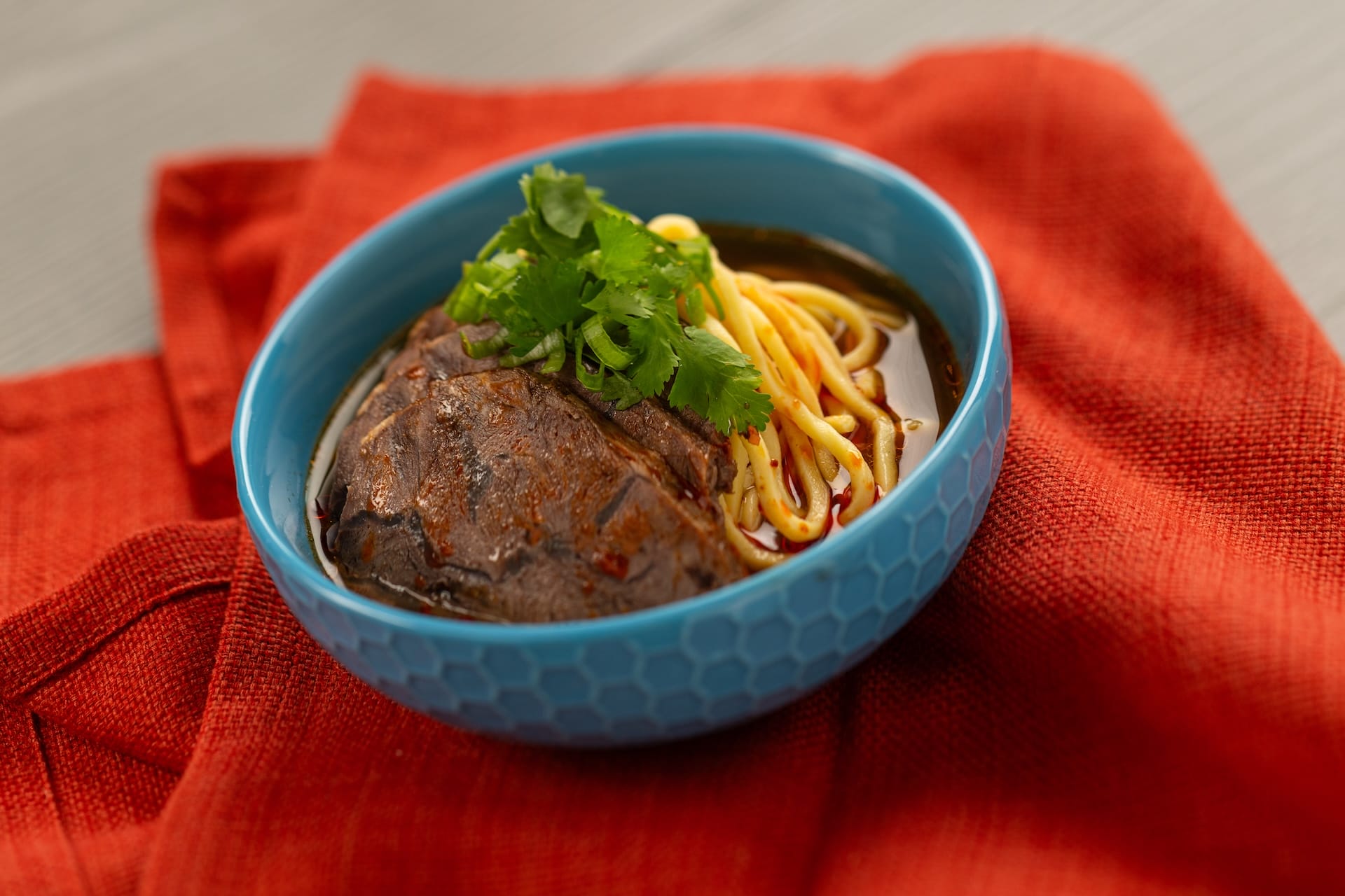 - Beef Noodle Soup Bowl with slow-braised beef shank, green onion, and house-made chili oil