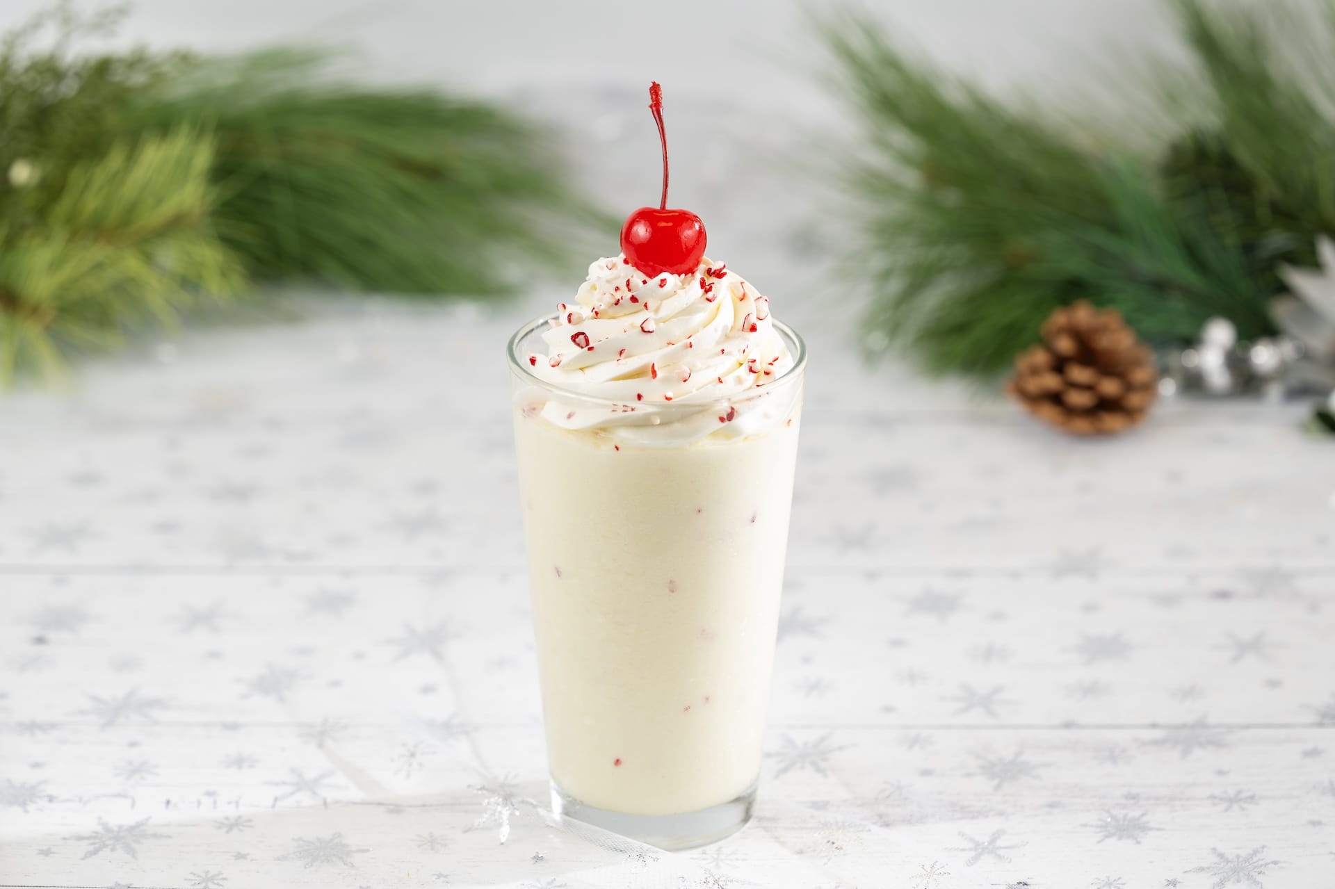 Candy Cane Shake: Choice of vanilla or chocolate peppermint shake with whipped cream, peppermint pieces, and a cherry (New) (Non-alcoholic)