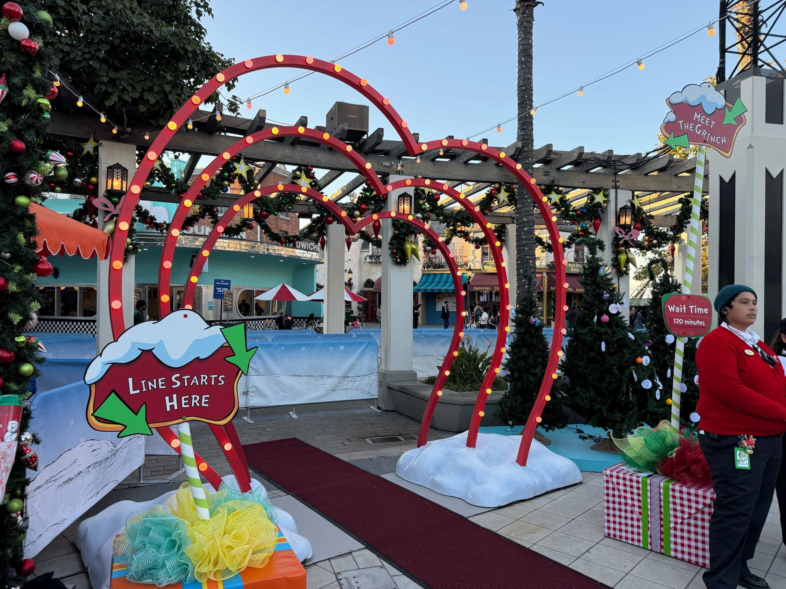The Grinch meet and greet is accessible through a red heart archway. A wait time is posted outside. The Grinch is popular so often has an hours-long wait.