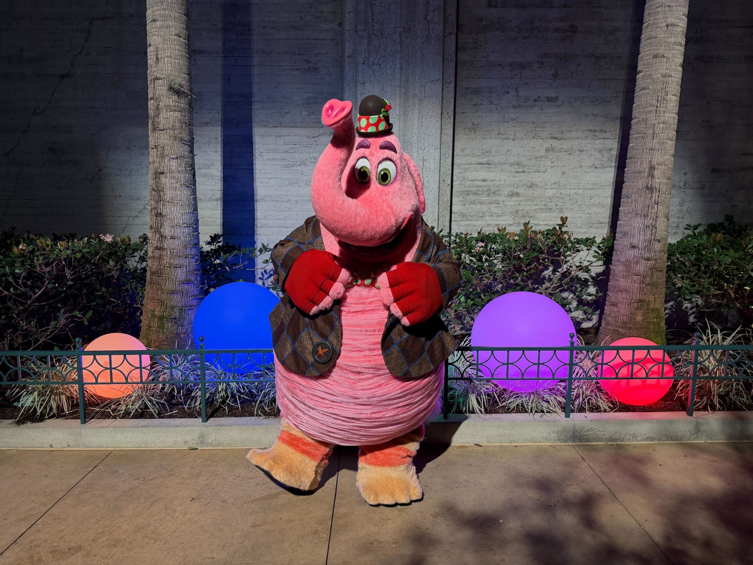 Donald and Daisy meet in front of a chest overflowing with oversized ornaments. They wear their same polka-dot Jollywood Nights outfits introduced last year. The meet and greet is in a new location near the Pixar Plaza entrance.
