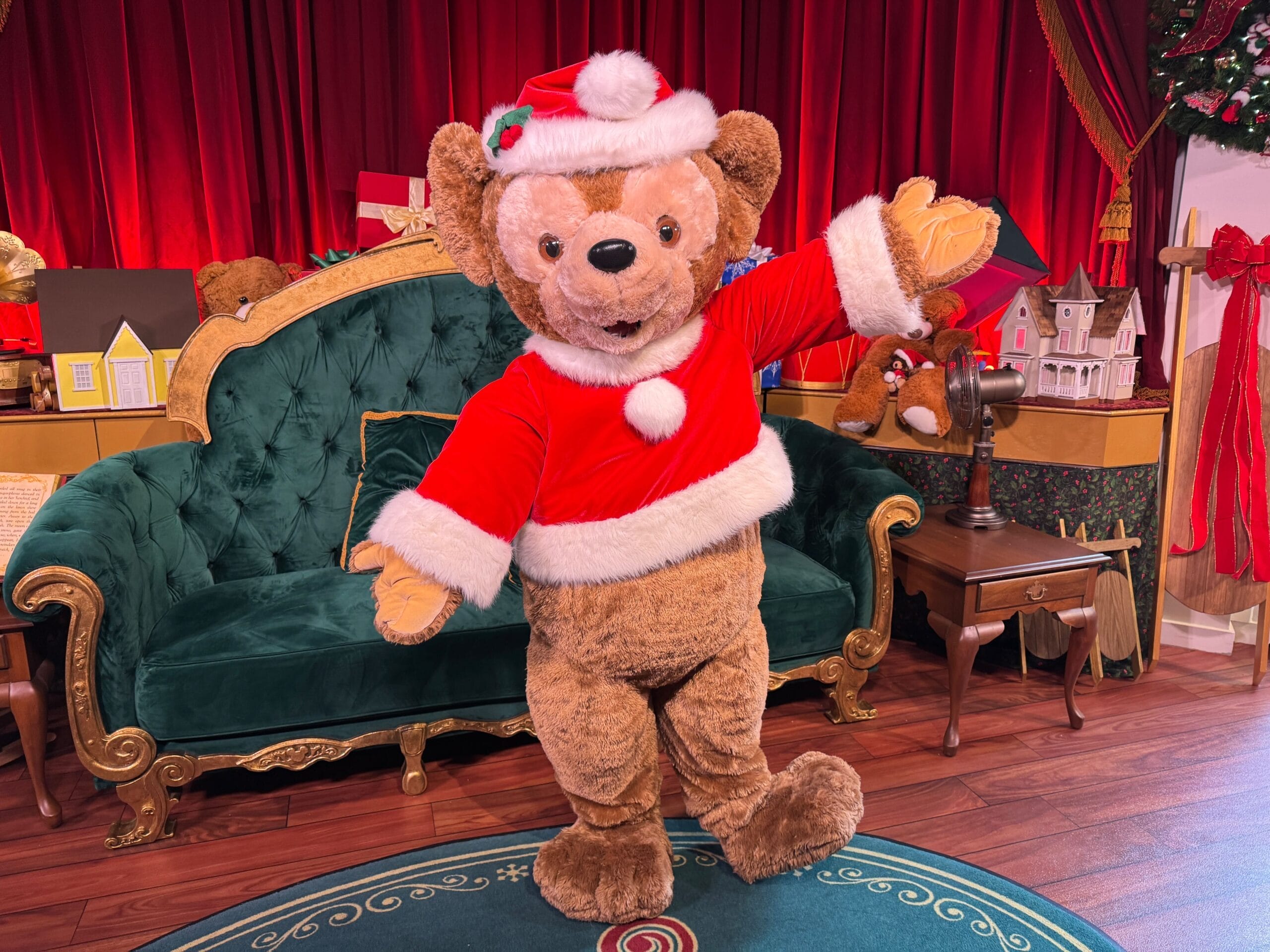 Santa Duffy is meeting in Walt Disney Presents. Duffy the Disney Bear wears a cozy-looking red tunic with white trim, and a matching hat with holly attached.