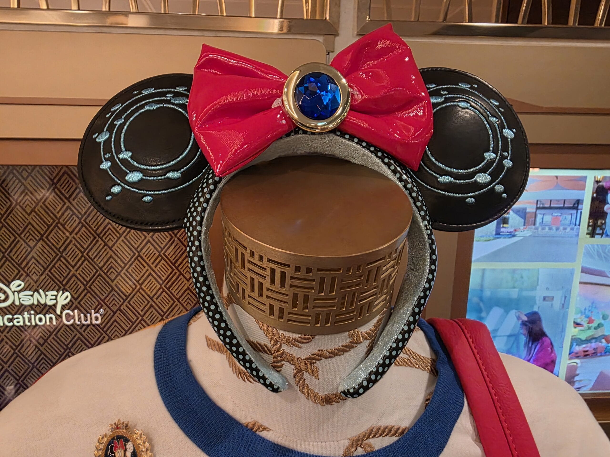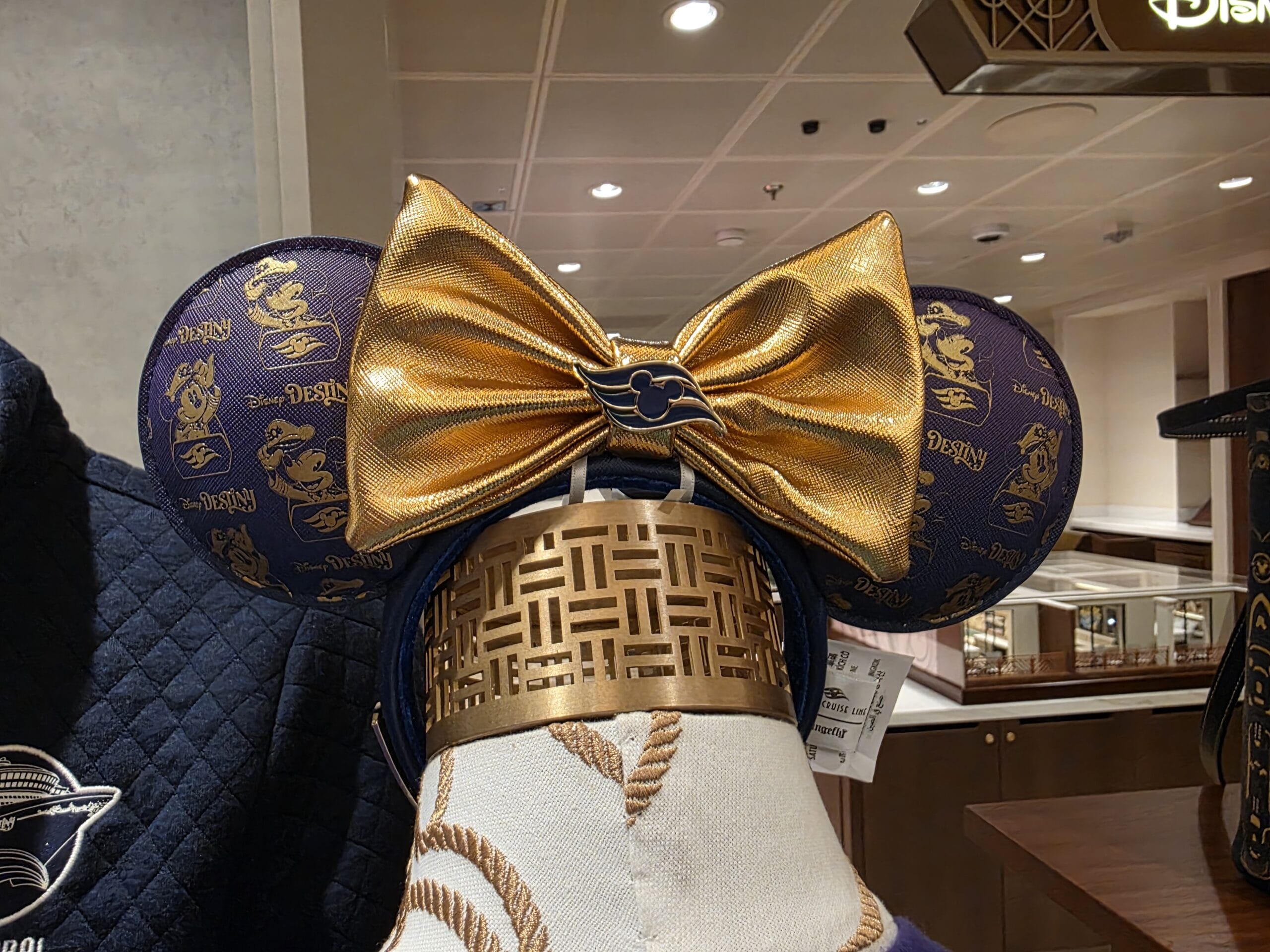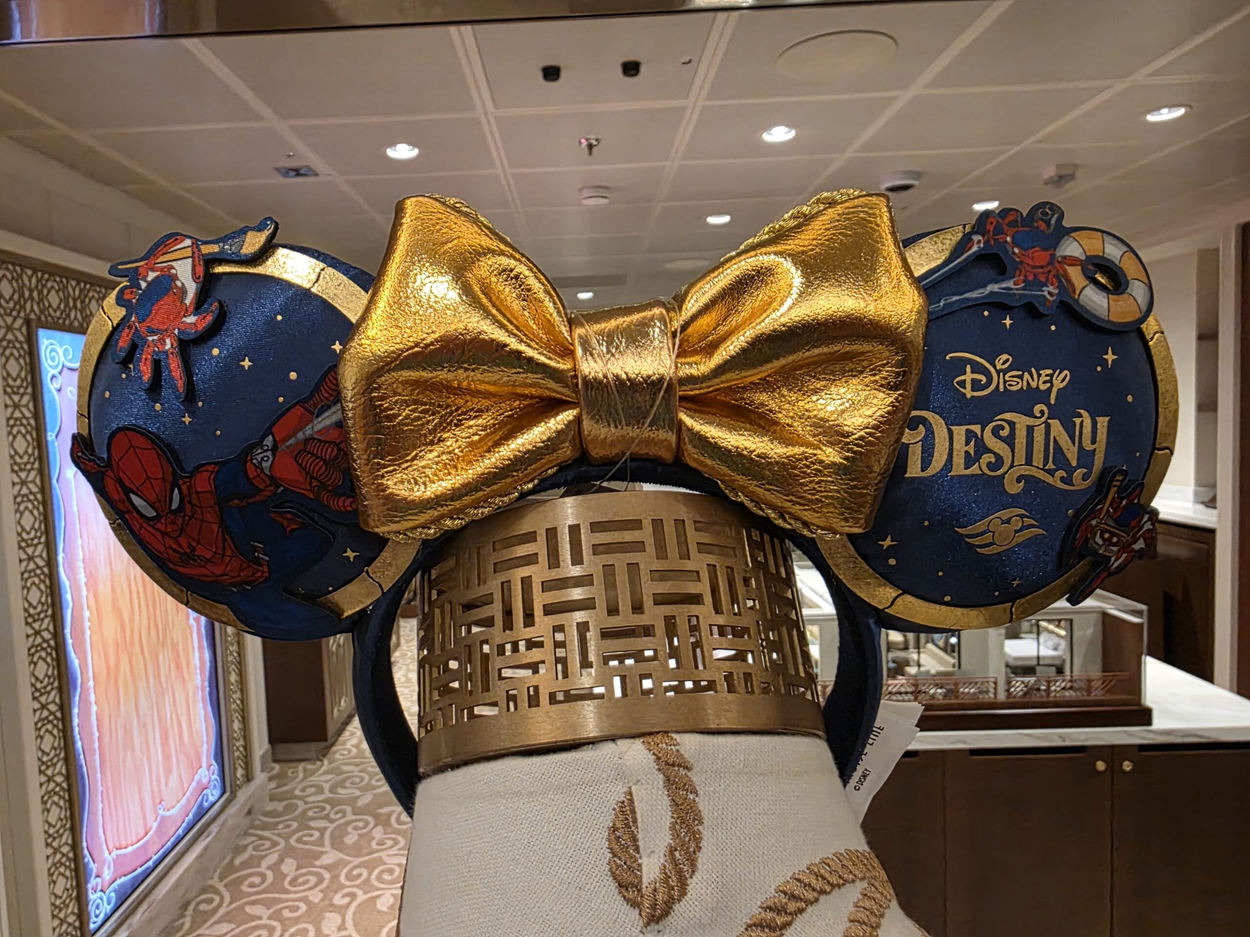 The Destiny gets its own version of the porthole-styled navy and gold ears based on the ship’s stern design. Both ears are made of padded navy fabric patterned with gold stars and edged with a gold “porthole” frame; the right ear also has gold Disney Destiny and Disney Cruise Line logos. The left ear features an appliqued Spider-bot and Spider-man shooting a web. The web is seen across the top of the right ear grabbing a Spider-bot holding a striped inner tube; there’s also an additional Spider-bot wearing a snorkel. The center bow is made of gold pleather edged with gold rope.