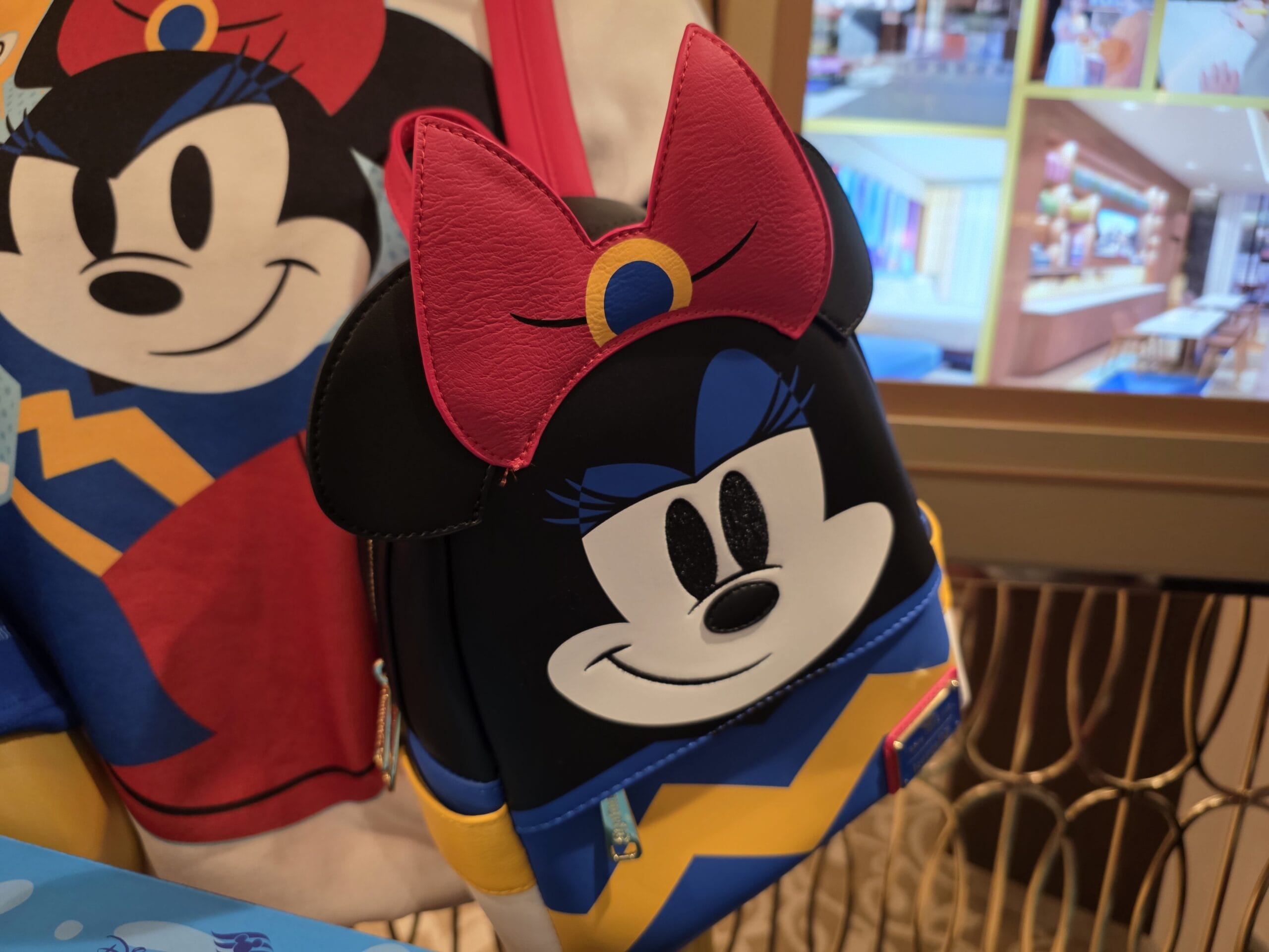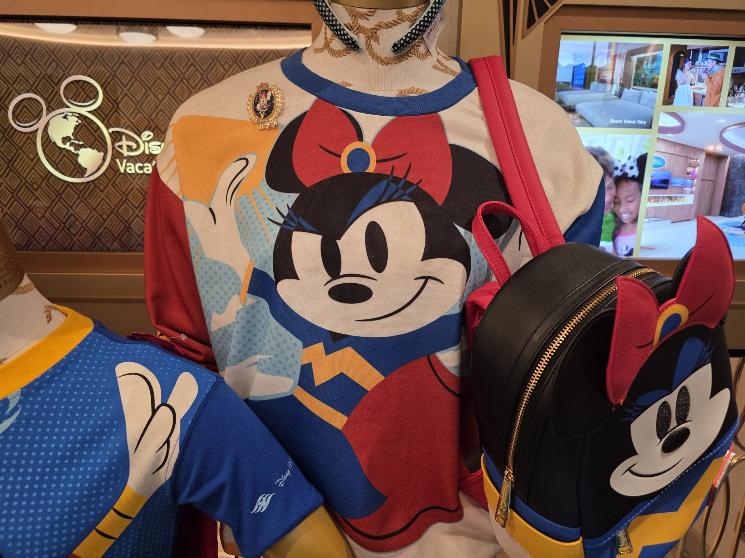 The Disney Destiny’s unique, comic book-styled hero take on Mickey & Friends also features across a line of exclusive merchandise. This long-sleeved top has the stylized Hero Minnie design front and center in primary shades of red, yellow, and blue. The left sleeve is blue while the right sleeve is red.