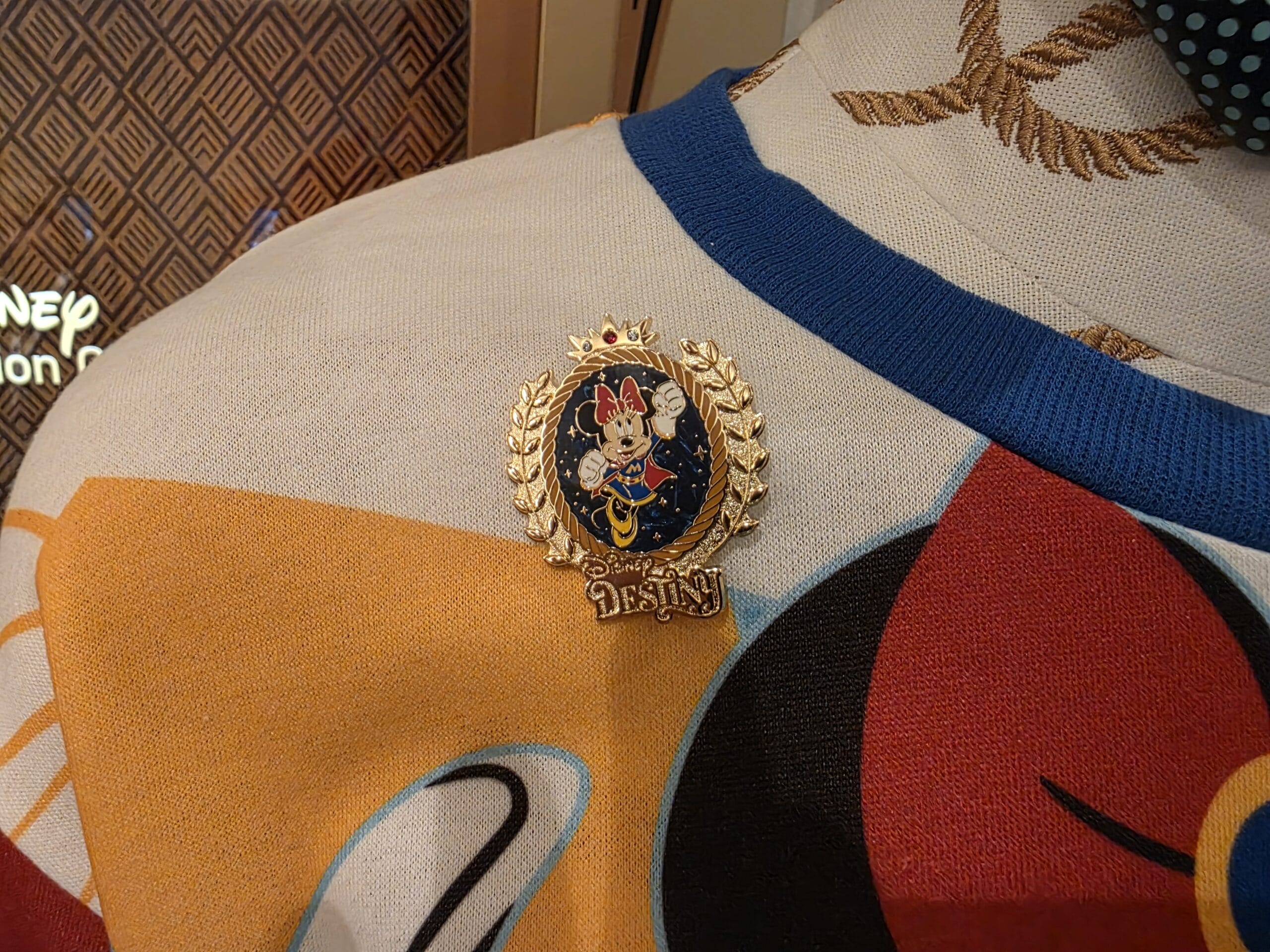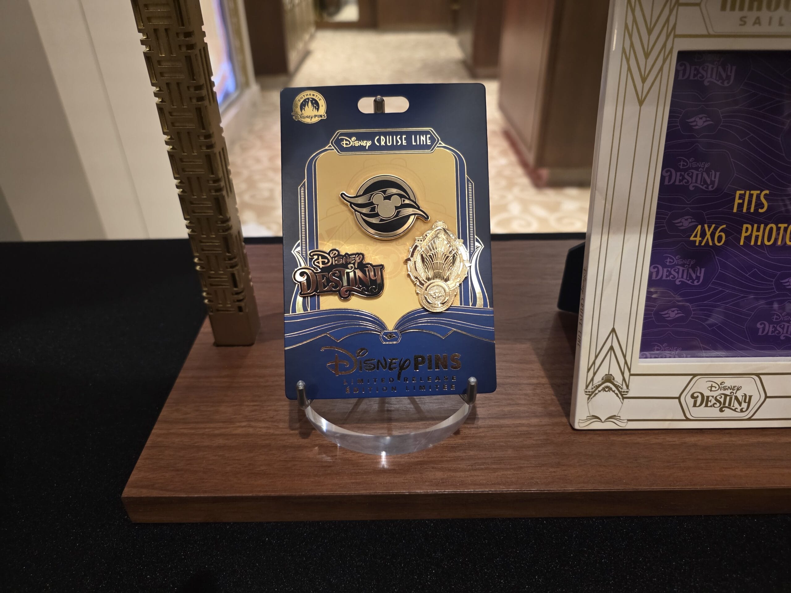 This set of three pins features a smaller, all-gold version of the medallion design above, as well as navy-fill pins of the Disney Destiny and Disney Cruise Line logos.