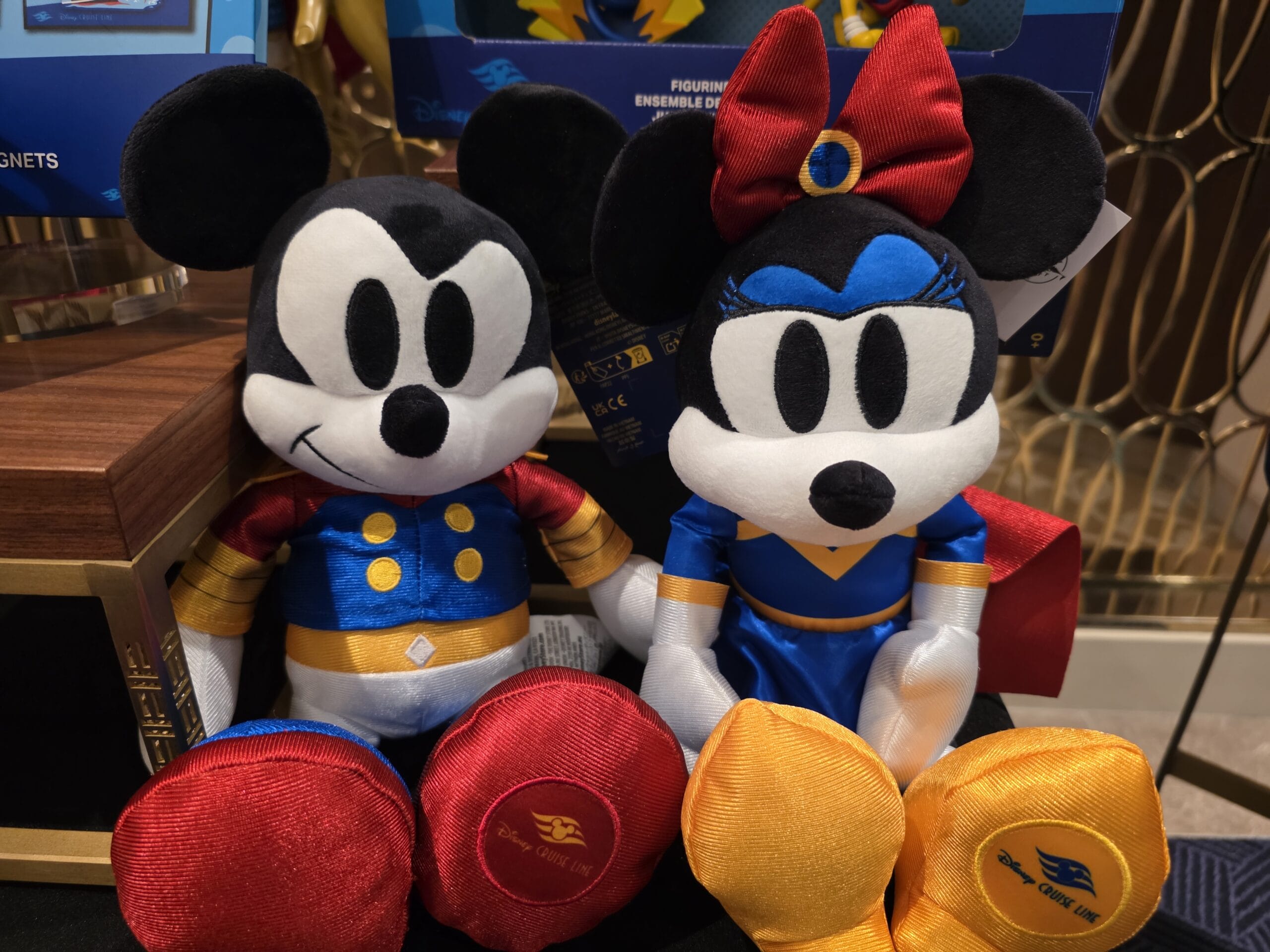 Hero Mickey and Minnie are here in plush form, wearing their respective red, yellow, and blue costumes with attached capes. The Disney Cruise Line logo is on the bottom of each plush’s left foot.