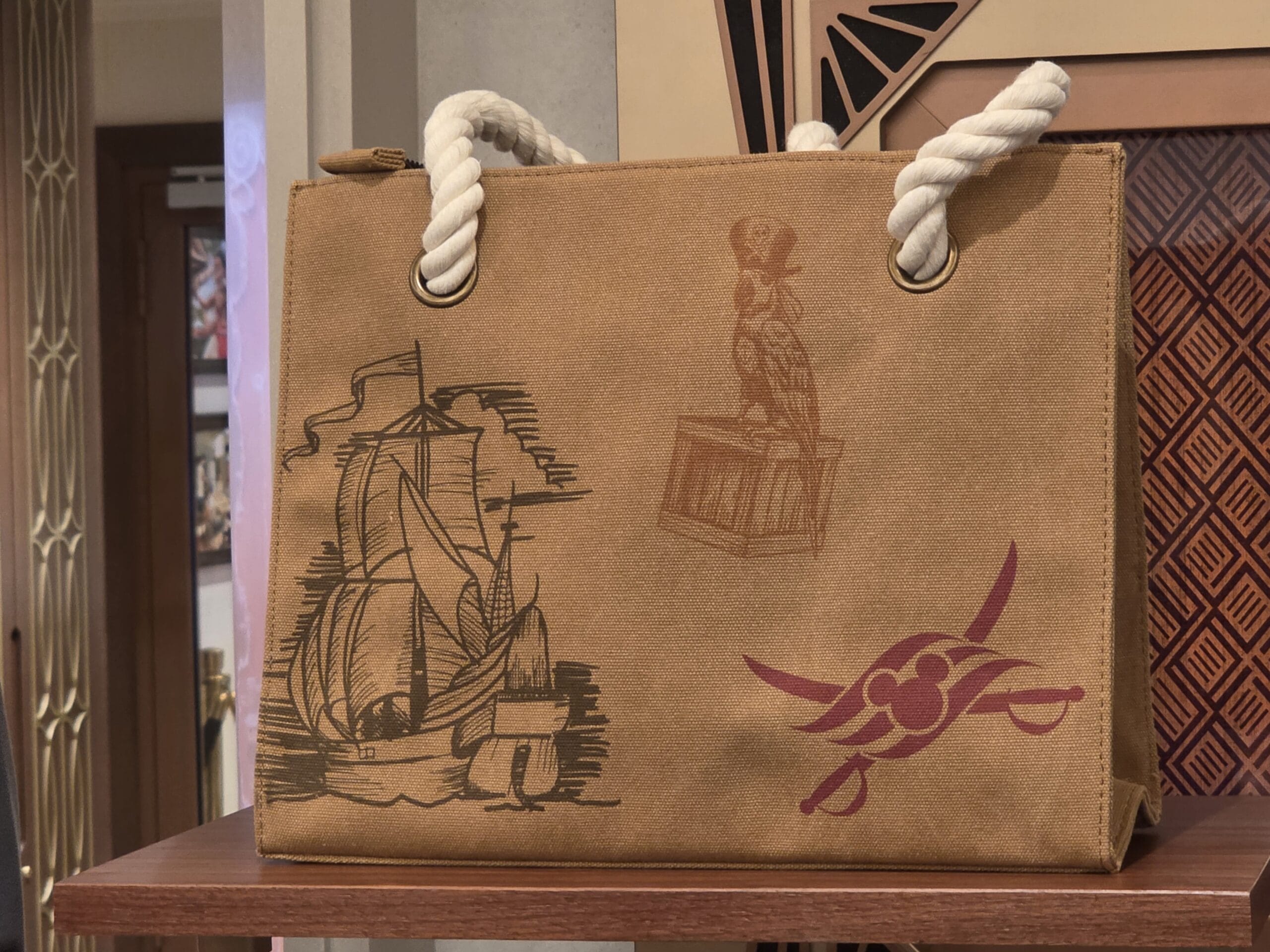 Another merch item for the Pirates of the Caribbean bar is this brown canvas tote with rope handles. The front is printed with three images: a dark brown pirate ship, a light brown pirate parrot perched on a crate, and a red Disney Cruise Line logo with crossed rapiers behind.