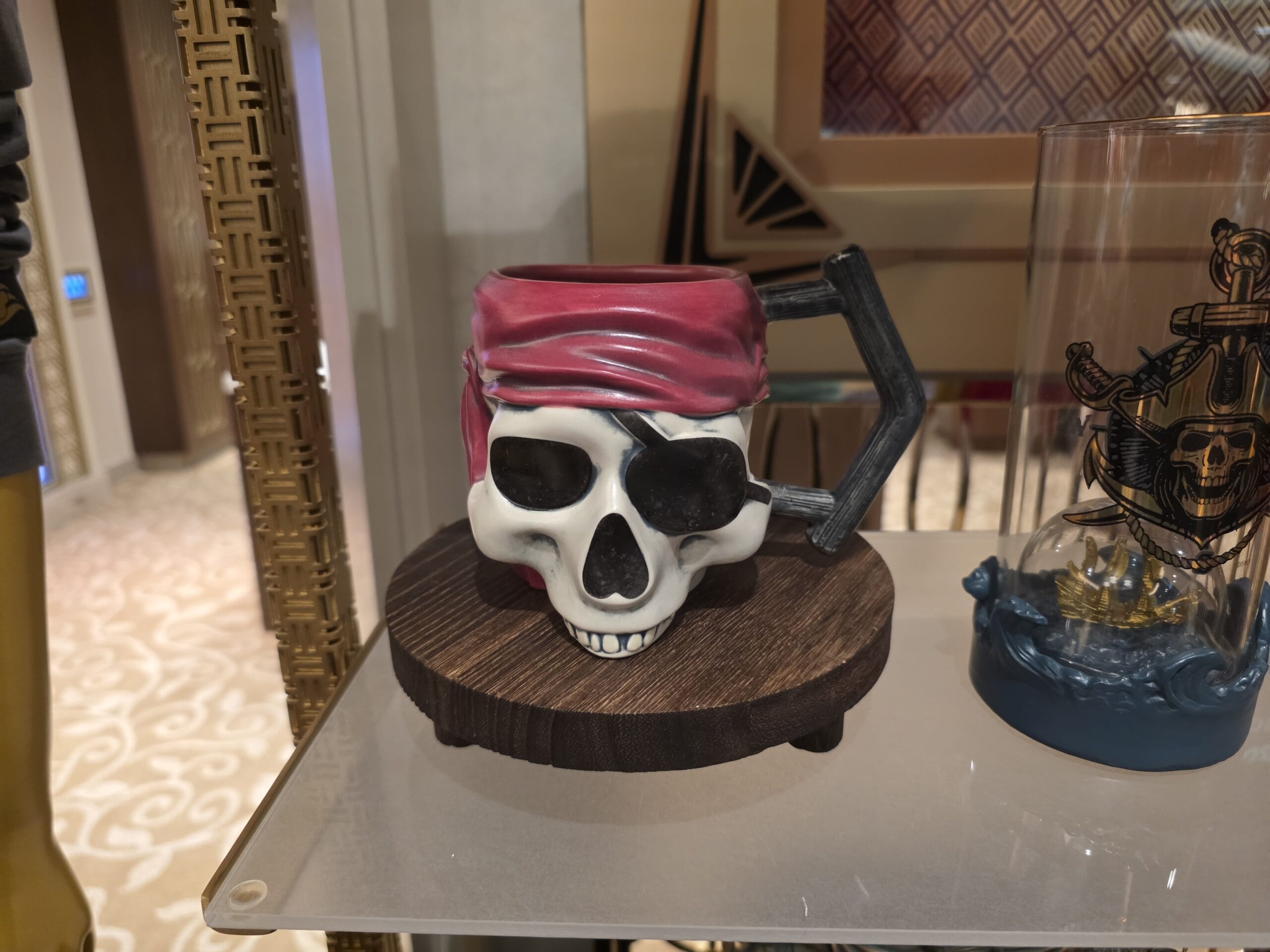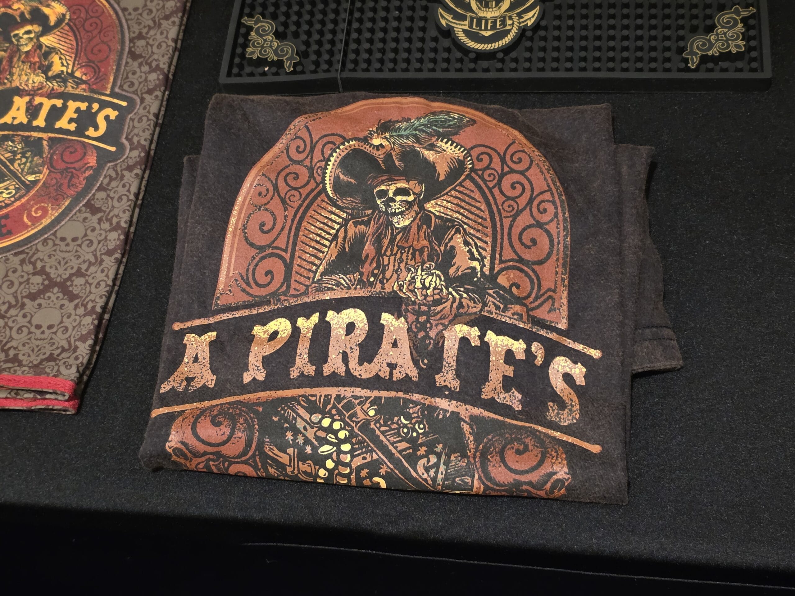Like the Disney Treasure, the Disney Destiny has merch themed to its exclusive lounges. This acid-washed shirt represents the Cask & Cannon with a large red graphic of a skeleton pirate captain sitting in an overflowing treasure chest, as seen in one of Pirates of the Caribbean’s most famous scenes. The text “A Pirate’s Life” is over the image.