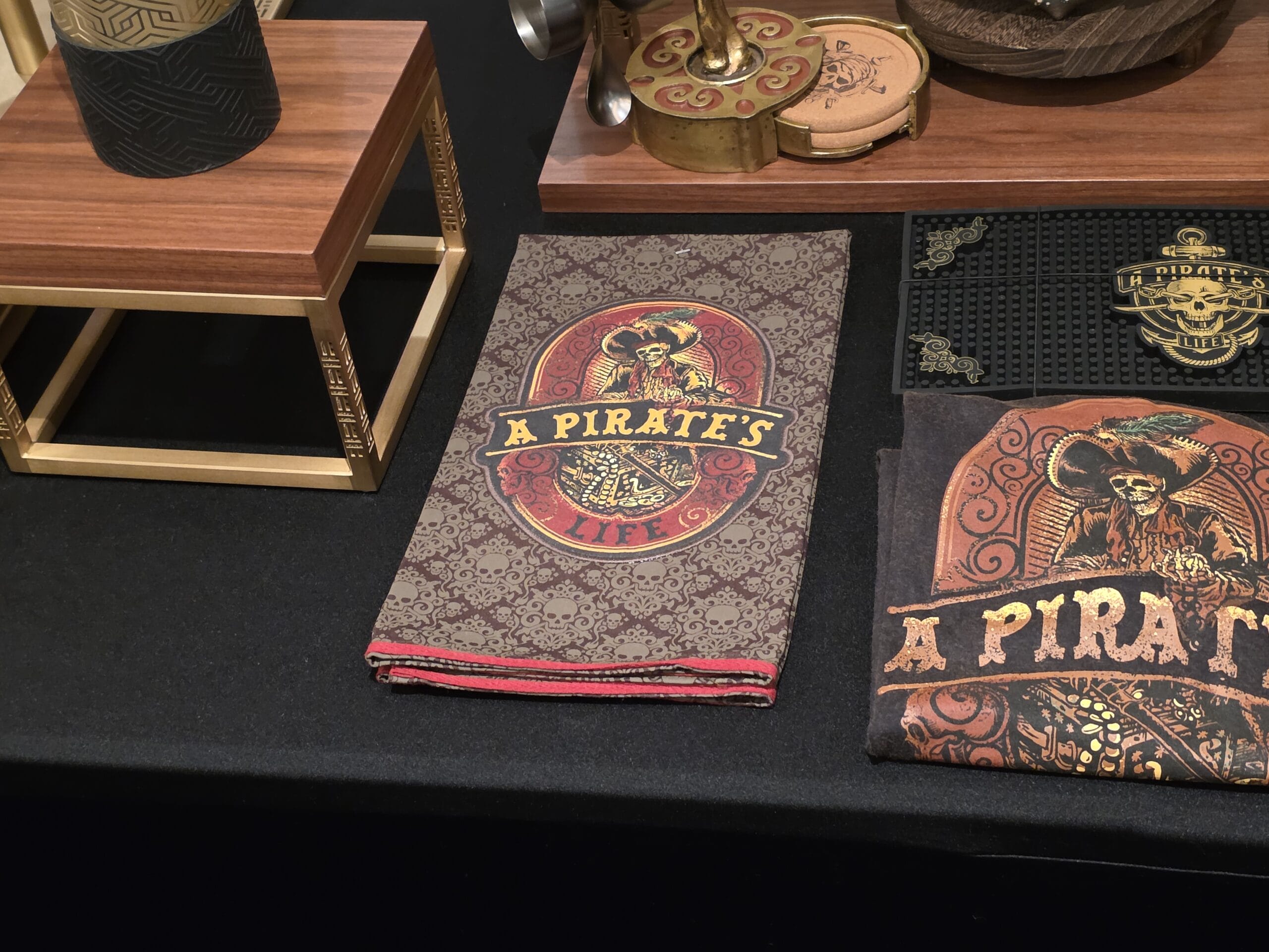 The “A Pirate’s Life” design is repeated on a kitchen towel with a burgundy and gray background pattern of skulls and tentacle-like swirls.