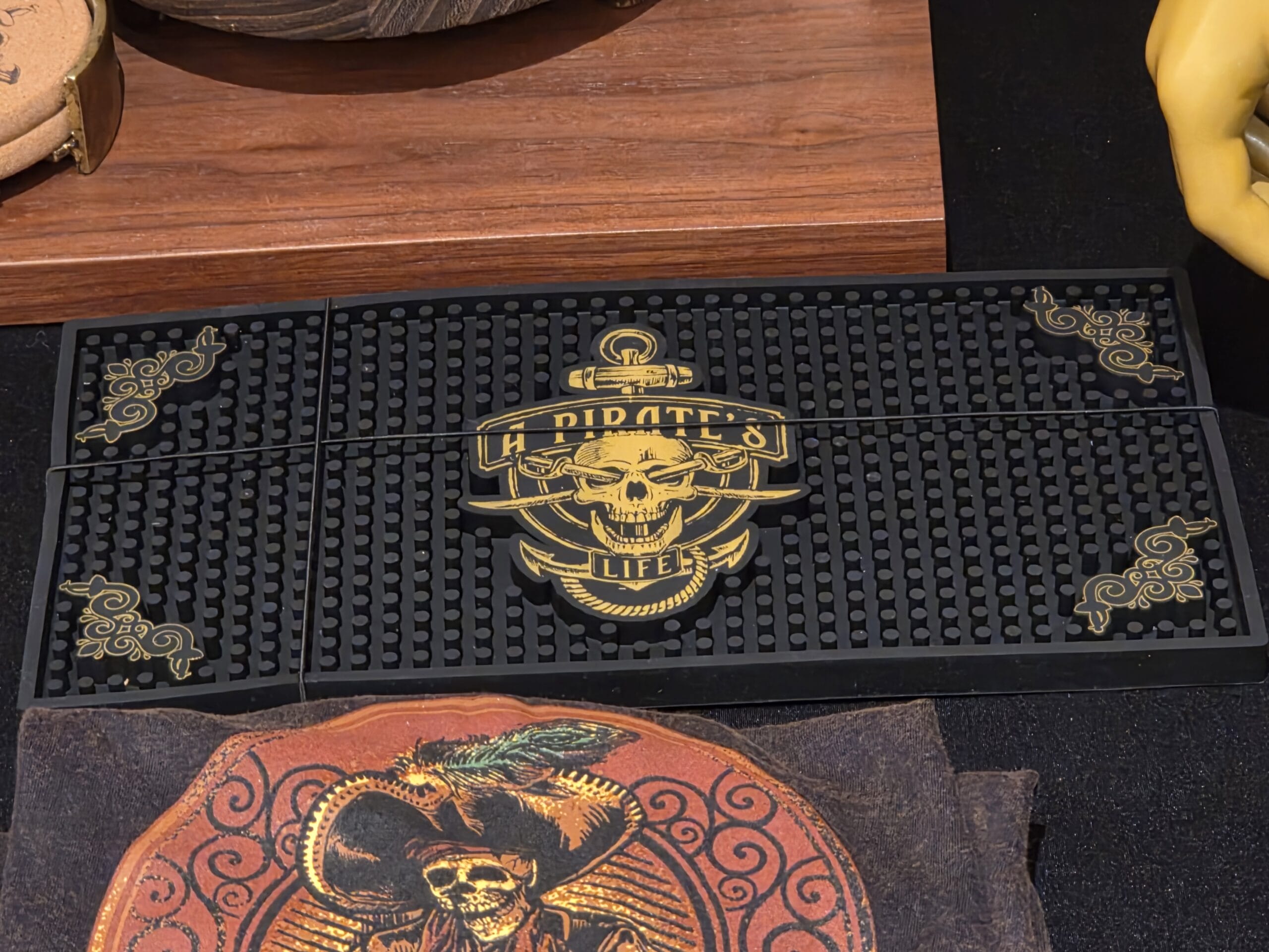 Bring the Cask & Cannon home with this black rubber bar mat, featuring a molded yellow image of a skull with rapiers going through its eye sockets in front of an anchor. The words “A Pirate’s Life” surround the skull. The corners are accented with yellow scrollwork designs.