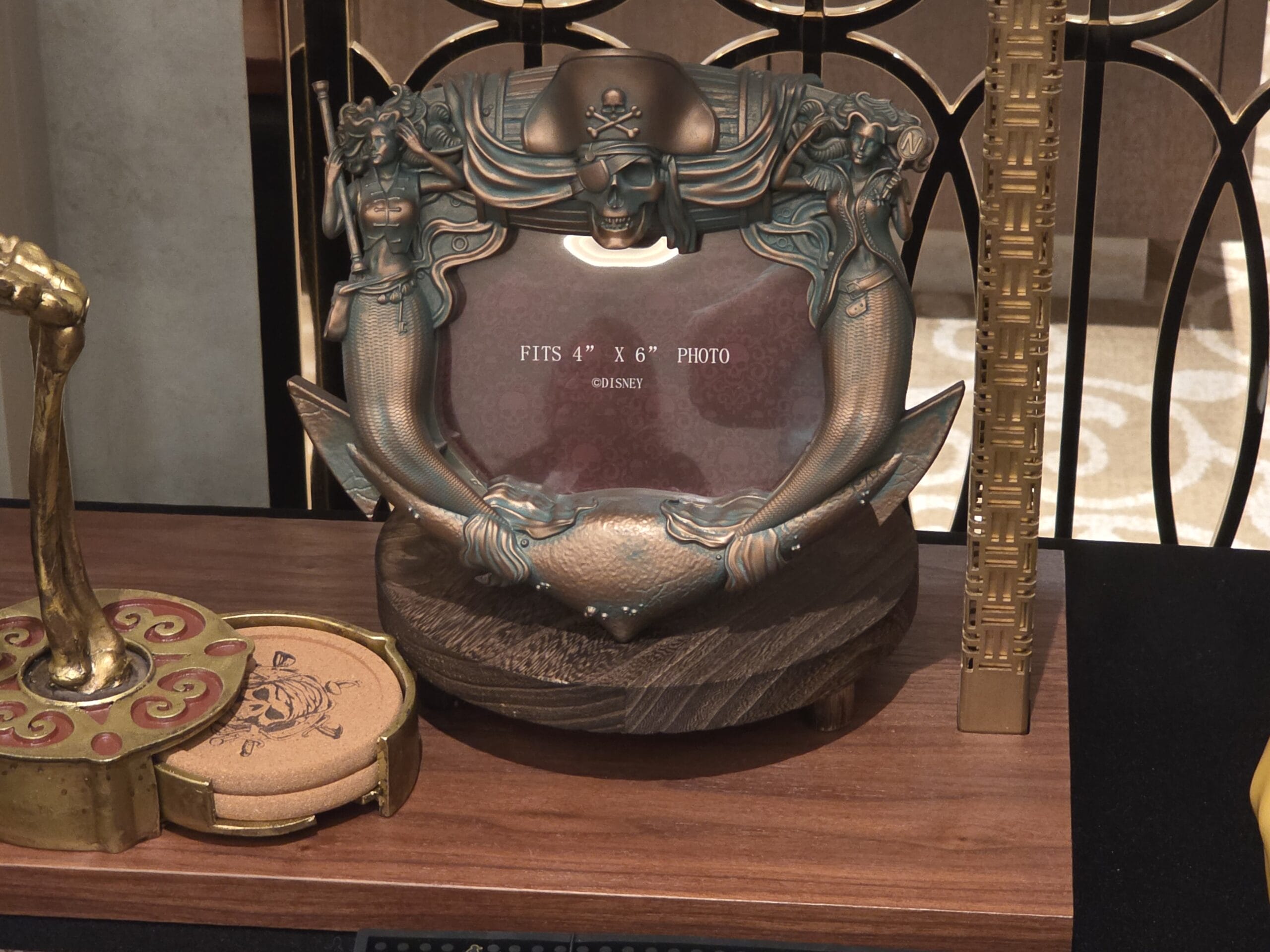 The pirate-y frame is bronze-colored with green shading. An anchor forms the bottom, while two mermaids flank the actual frame. Above the frame opening is a pirate skull in front of a banner stretched across a rum cask.