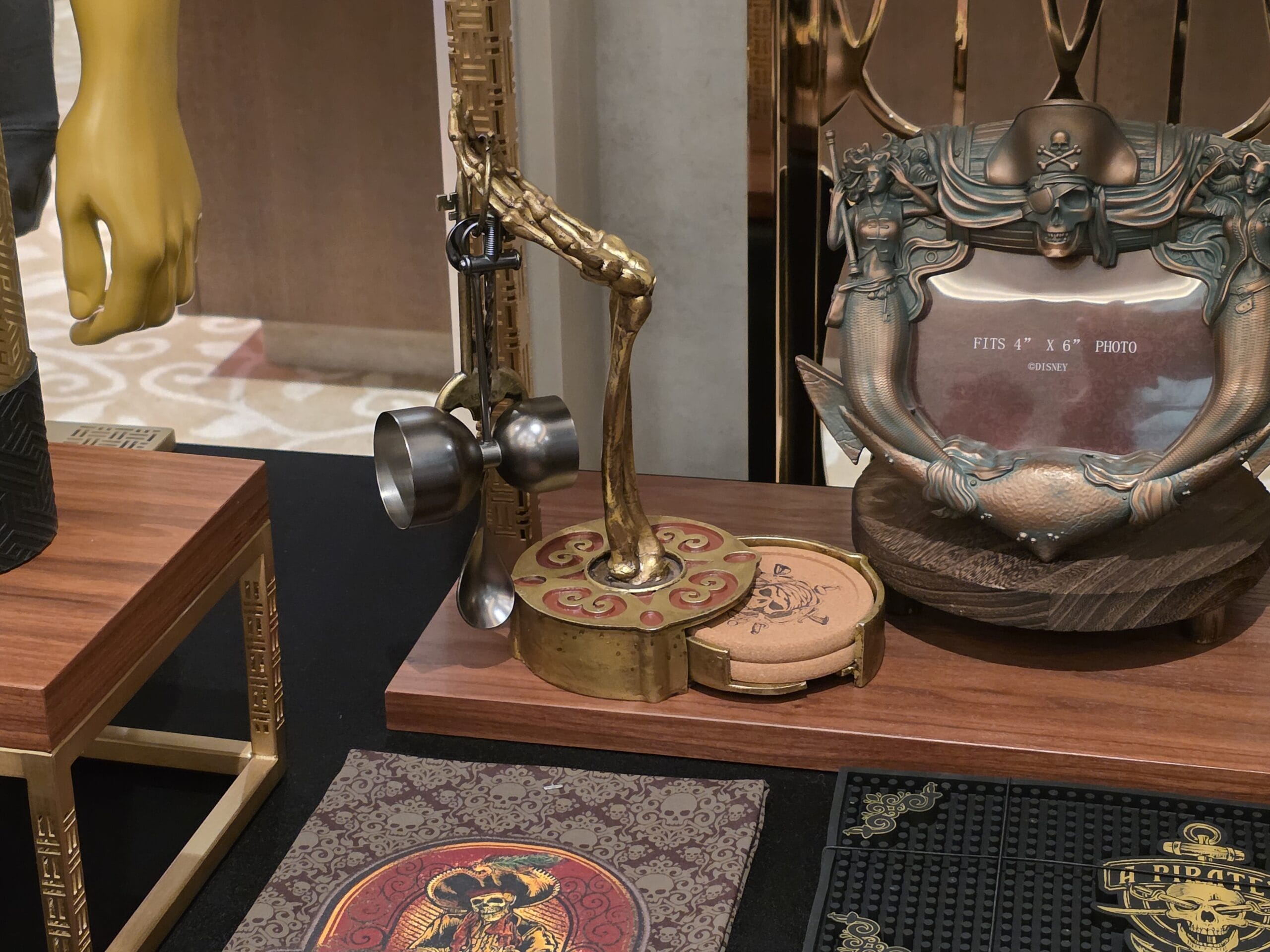 Accent your home barrr with a special set inspired by the Cask & Cannon. A gold skeleton hand holds a “keyring” with a jigger, bar spoon, and bottle opener. The red scrollwork-accented base swivels opens to reveal a pair of Jolly Roger cork coasters.