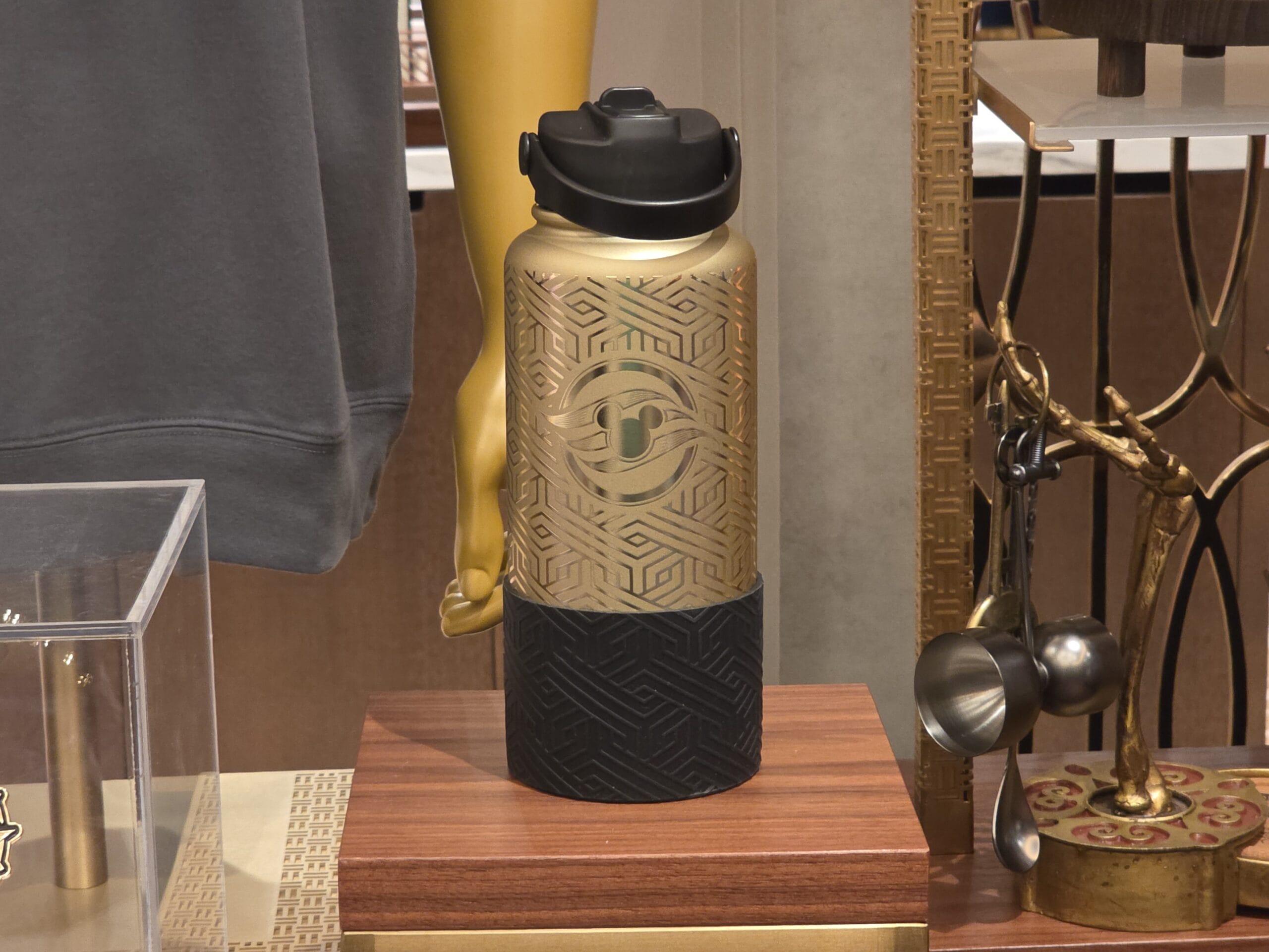 The Wakandan-inspired geometric pattern of the Great Hall covers this metal gold water bottle and continues onto its black silicone boot. There’s also a Disney Cruise Line logo. The lid has a flip-top sipper and a carrying handle.