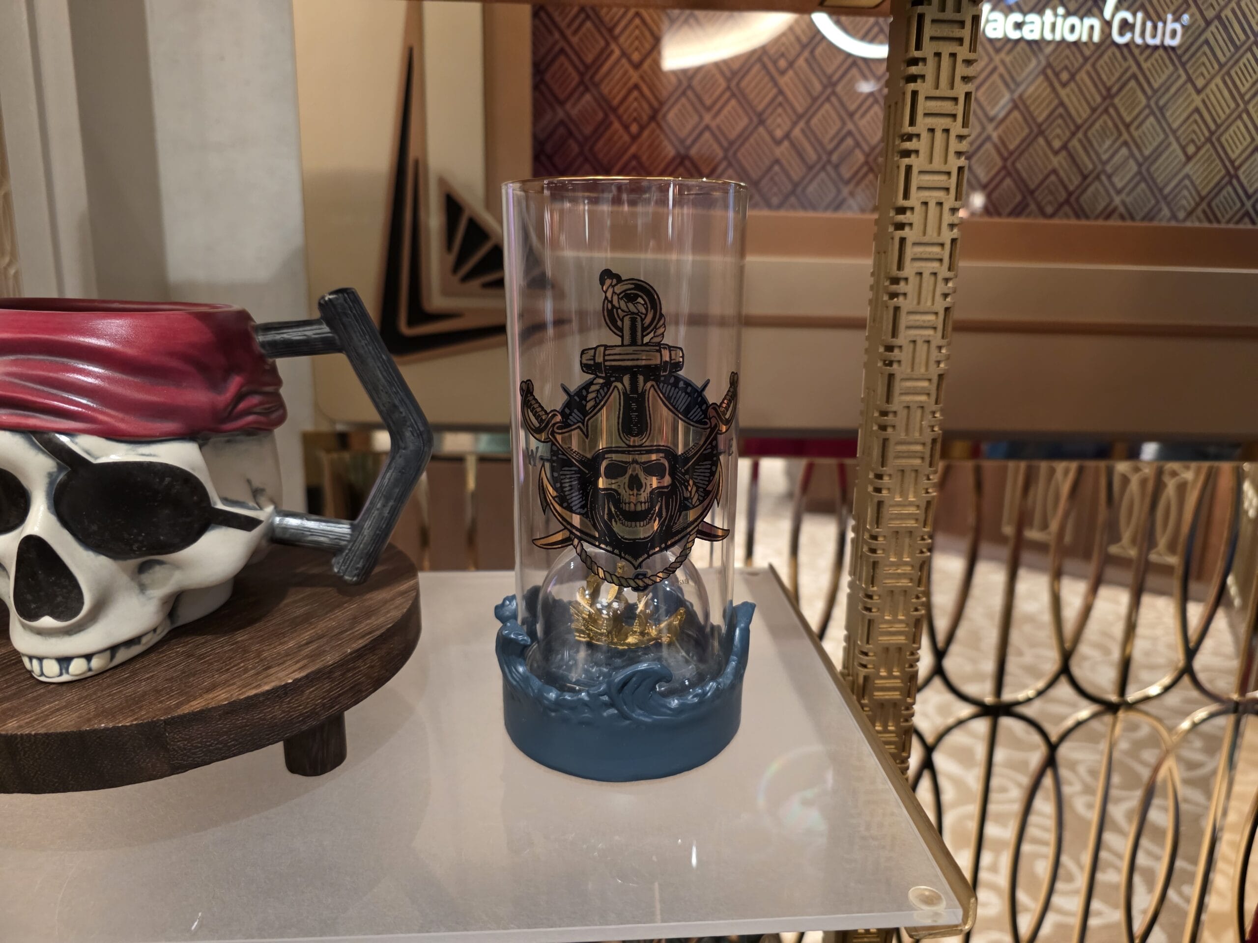 A piece of art as much as a glass, this tall glass rises from a blue wave-shaped base. Inside at the bottom is a small gold pirate ship encased in a bubble. The front of the glass features a gold and black pirate skull in front of an anchor and crossed rapiers.