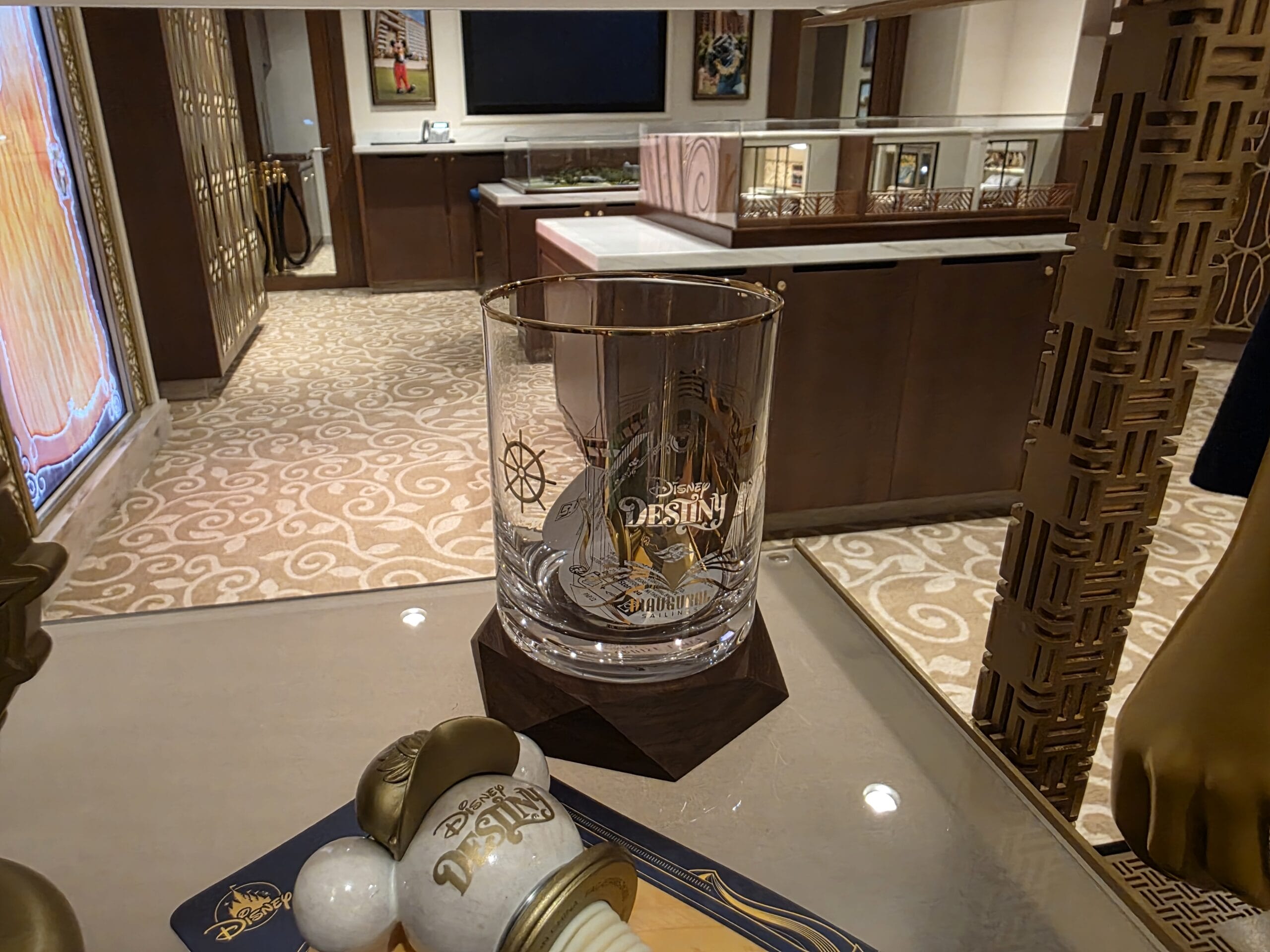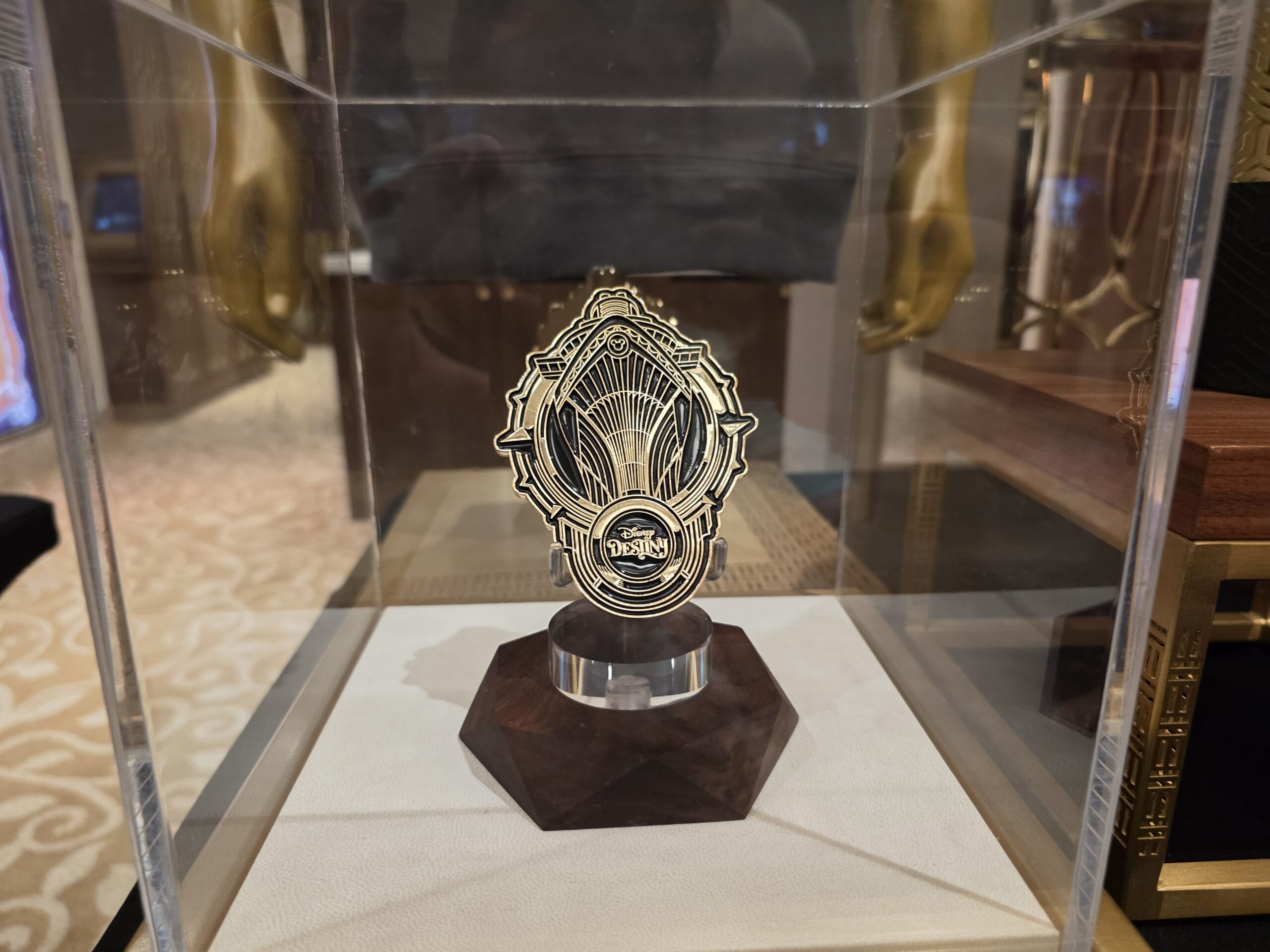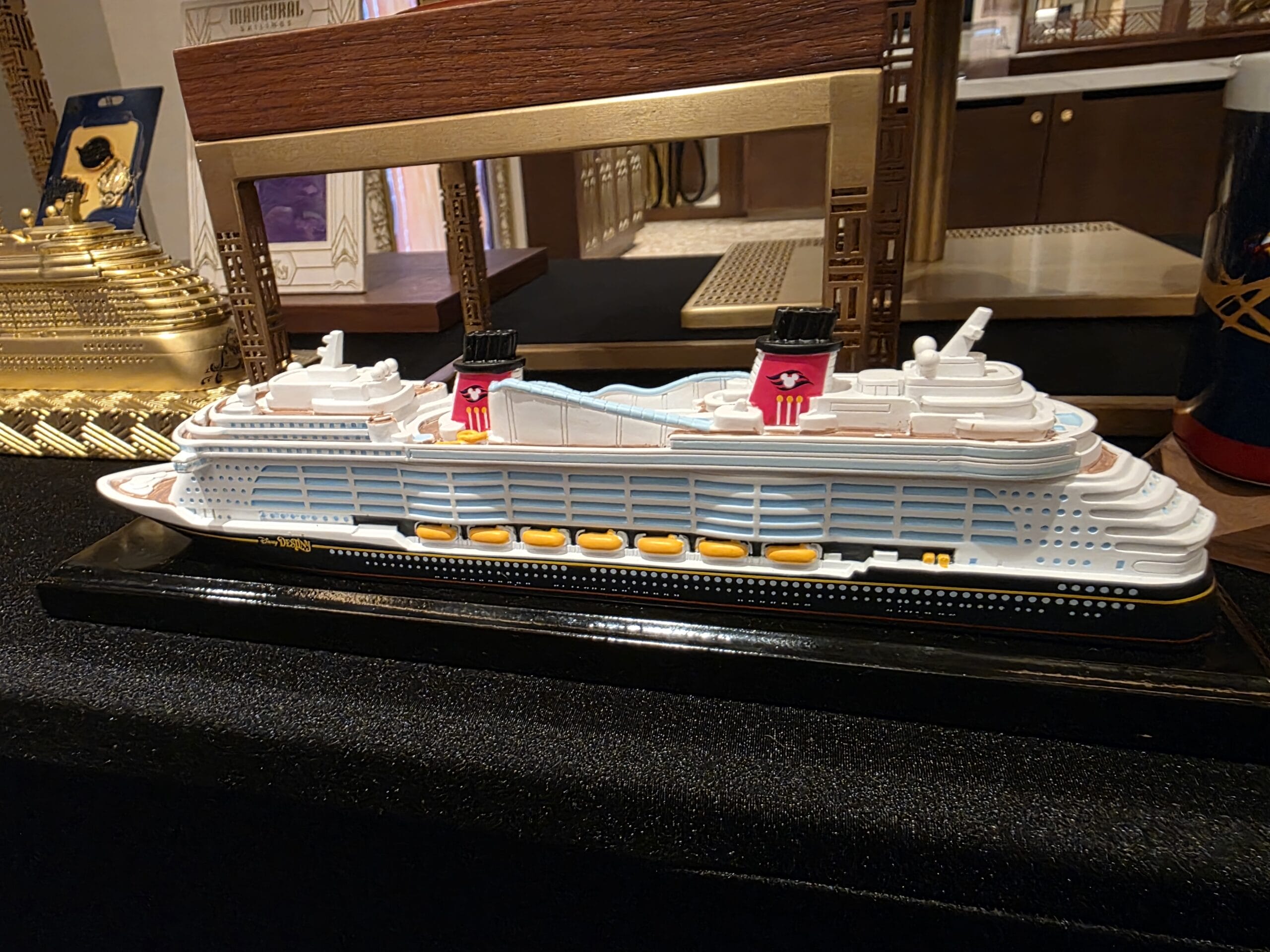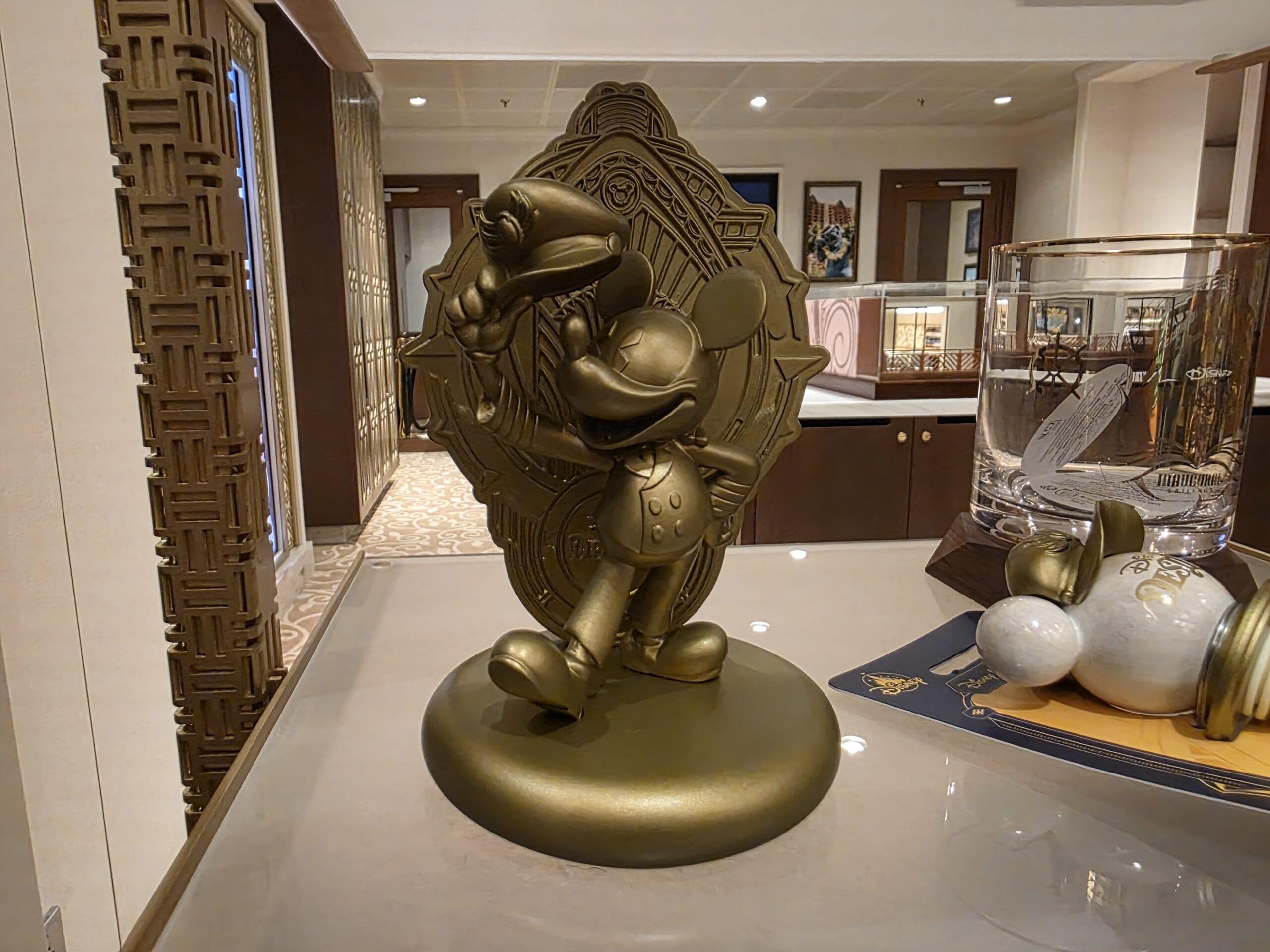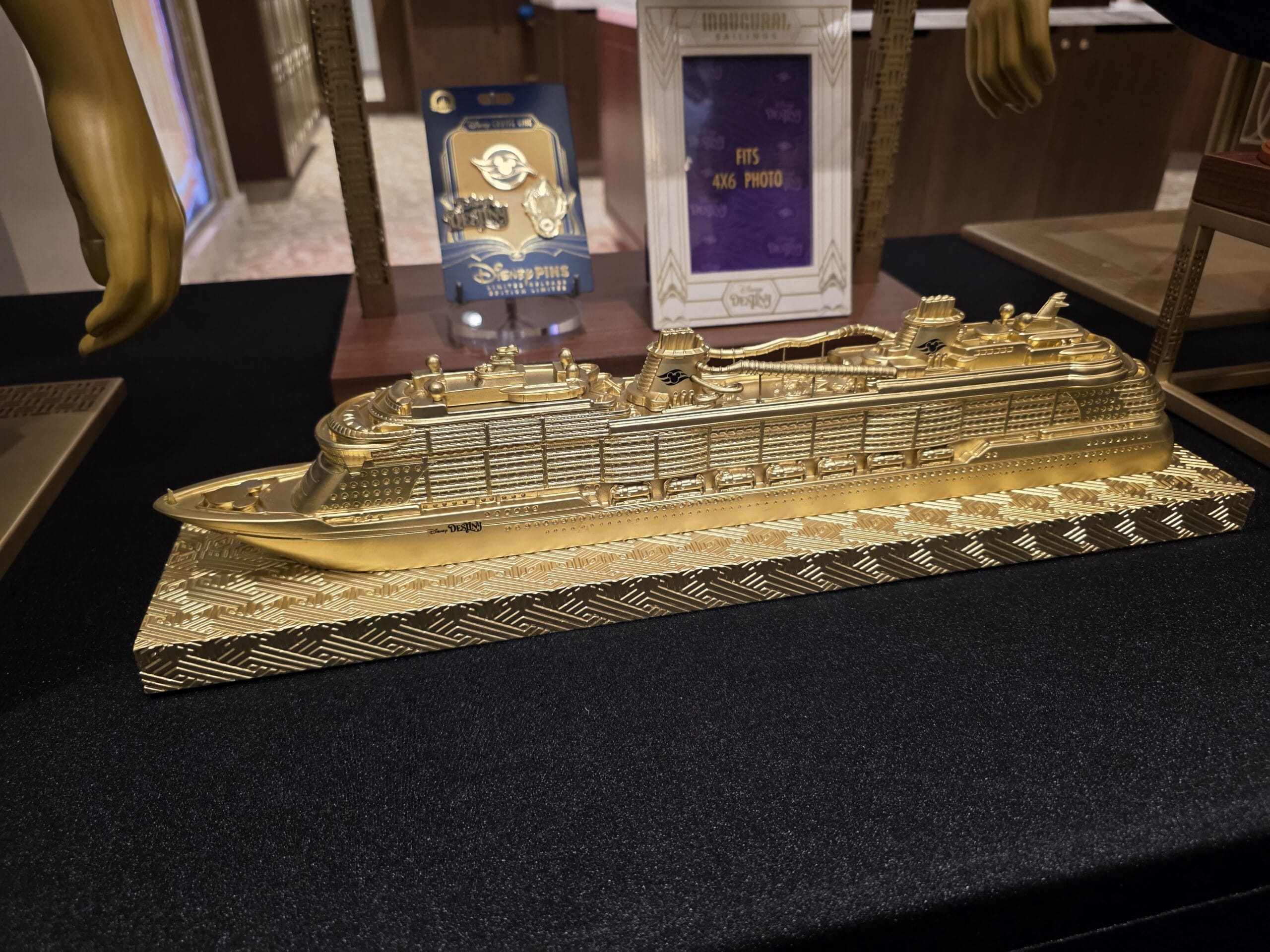 There’s also a fully gold Disney Destiny ship model, with the Great Hall geometric pattern covering its display base.