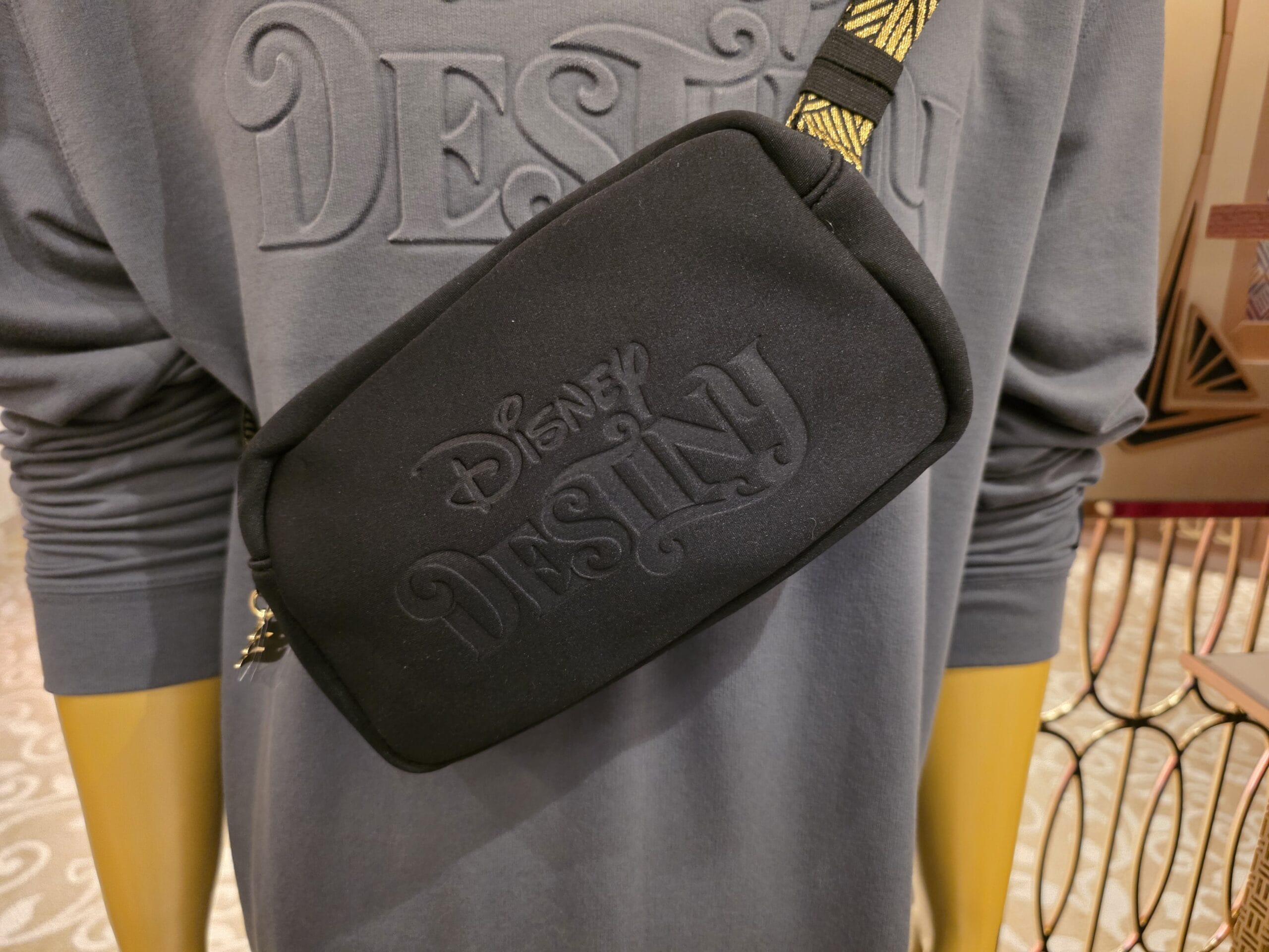 Keep it simple with a black crossbody bag with an embossed Disney Destiny logo. The zipper pull is a gold Disney Cruise Line logo. The strap features a gold and black geometric pattern inspired by the Grand Hall.