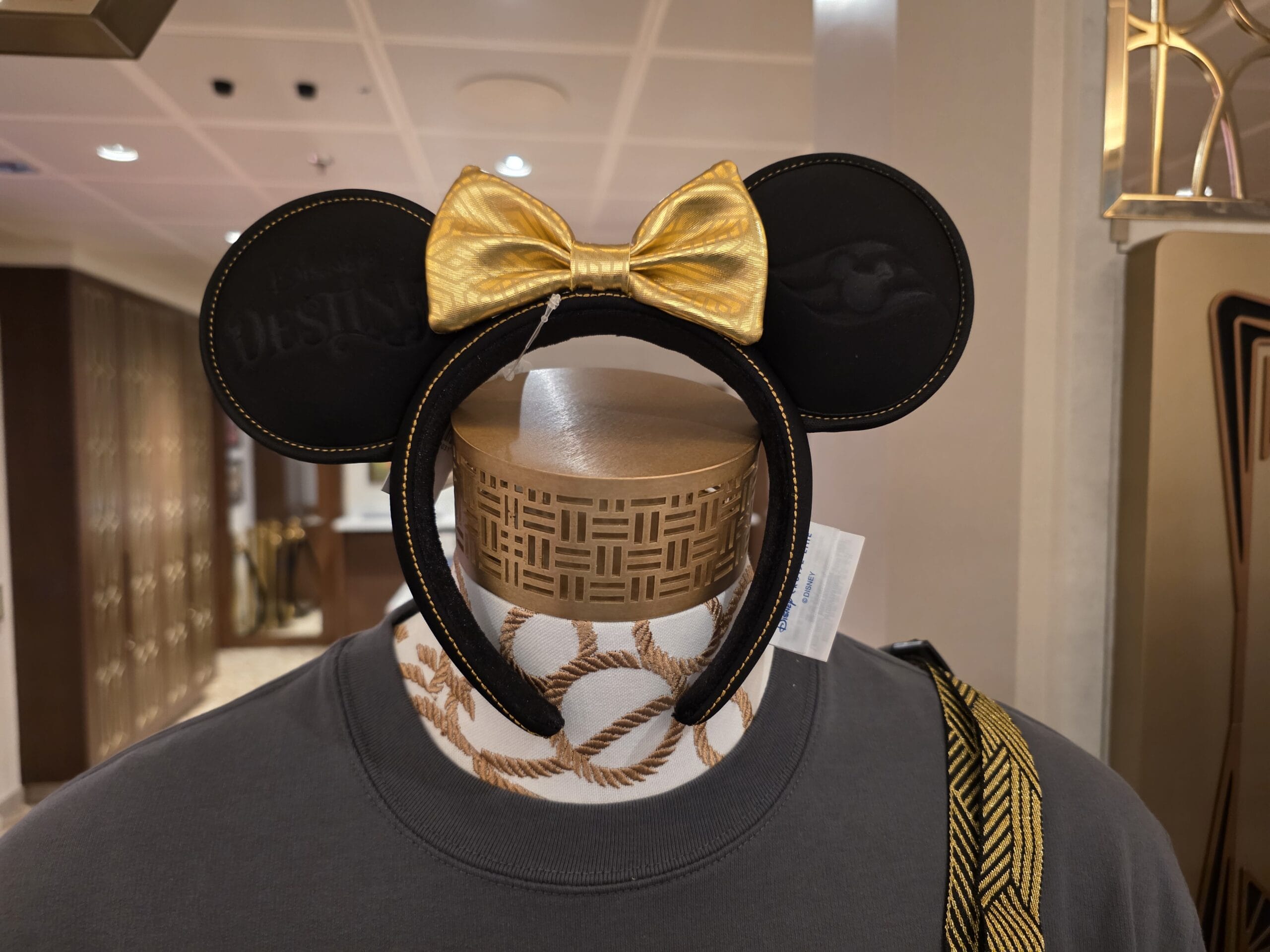This minimalist ear headband is fully made of black sueded fabric with yellow accent stitching. The Disney Destiny logo is embossed on the left ear and the Disney Cruise Line logo on the right. The middle bow is made of gold fabric patterned with a geometric design inspired by the ship’s Great Hall. The headband is lined with soft black fleece.