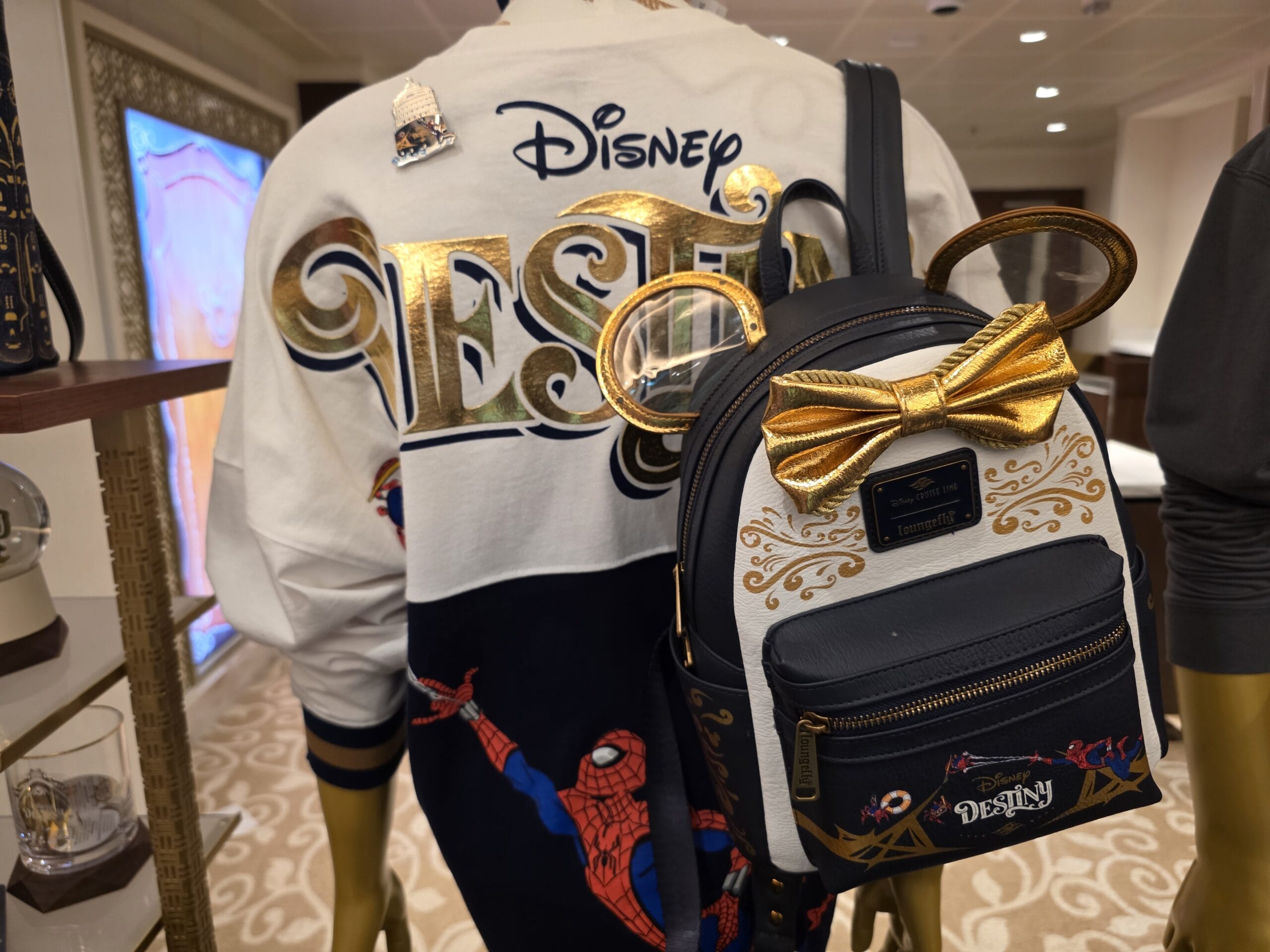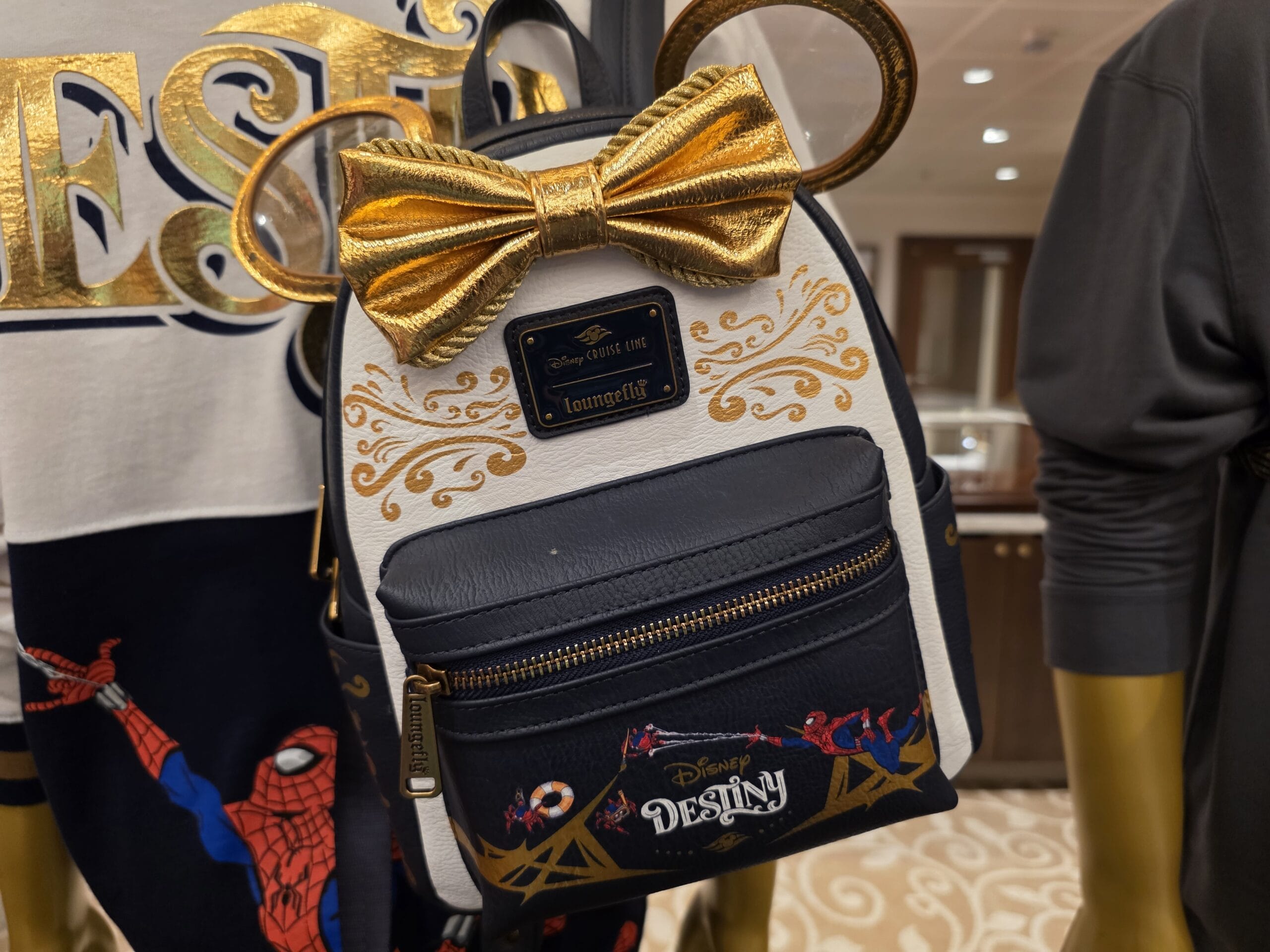 Finally, the Destiny gets its own navy and white Loungefly backpack with transparent “porthole” ears. The front zipper pocket is printed with the Disney Destiny stern design with Spider-man, three Spider-bots, and the Destiny’s unique gold web-inspired filigree. The white body of the bag and navy side slip pockets have a gold scrollwork pattern. The bow is made of gold pleather edged with gold rope above a navy Disney Cruise Line | Loungefly logo badge.