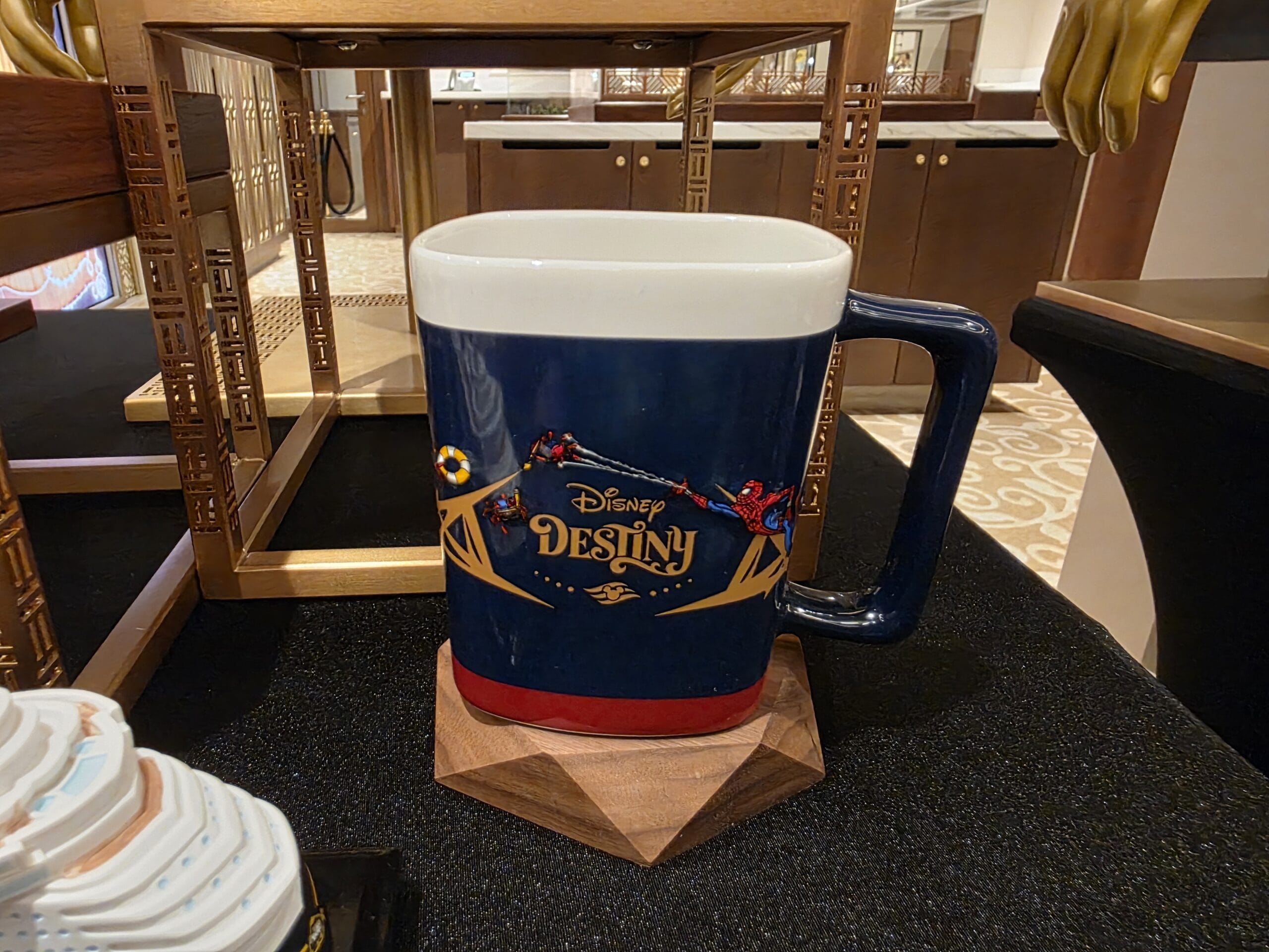 The square navy Disney Cruise Line mug is a classic, and here’s the Destiny’s version featuring the Spider-man stern design. The mug features a red stripe around the bottom and a white rim and interior.
