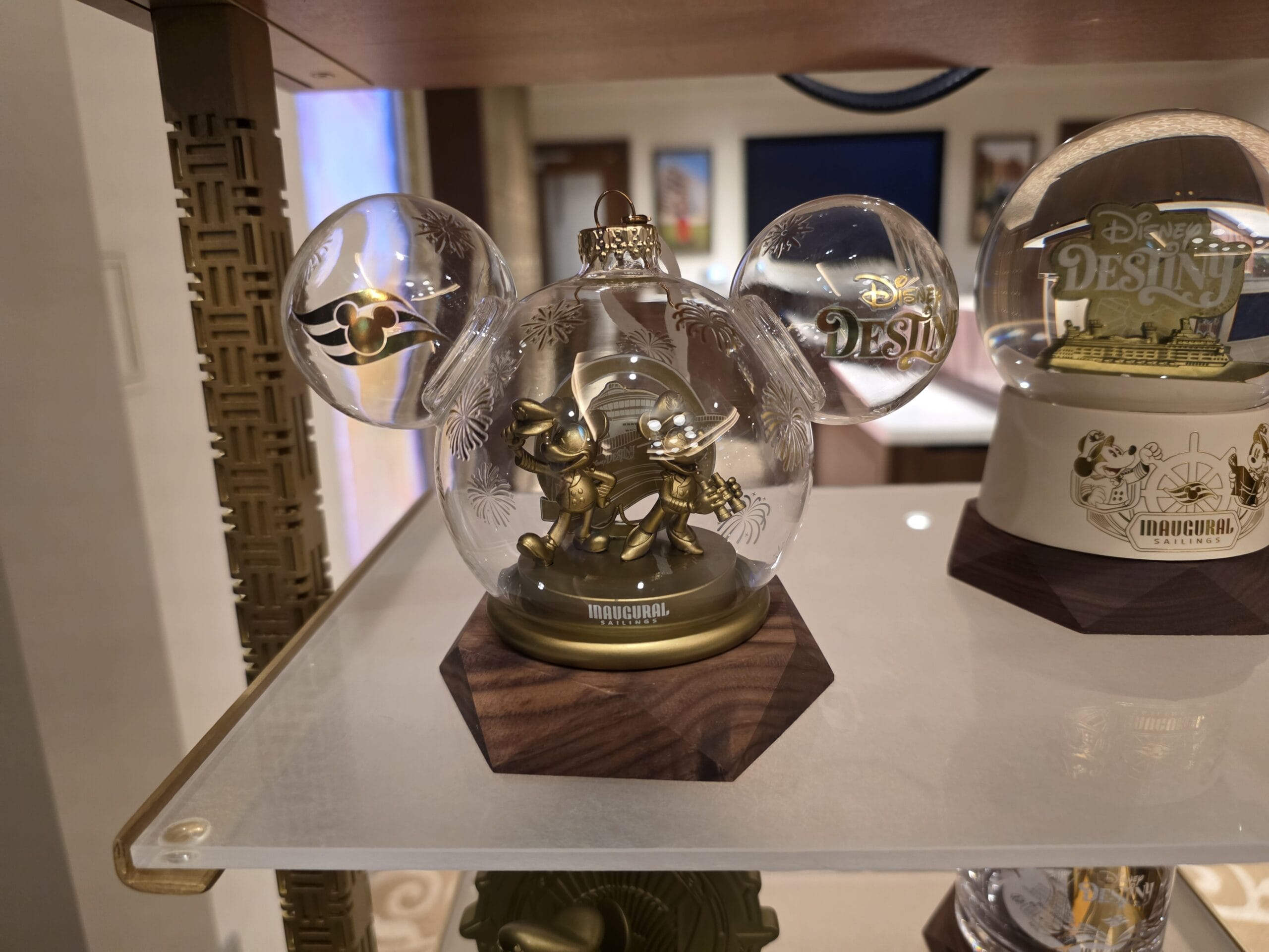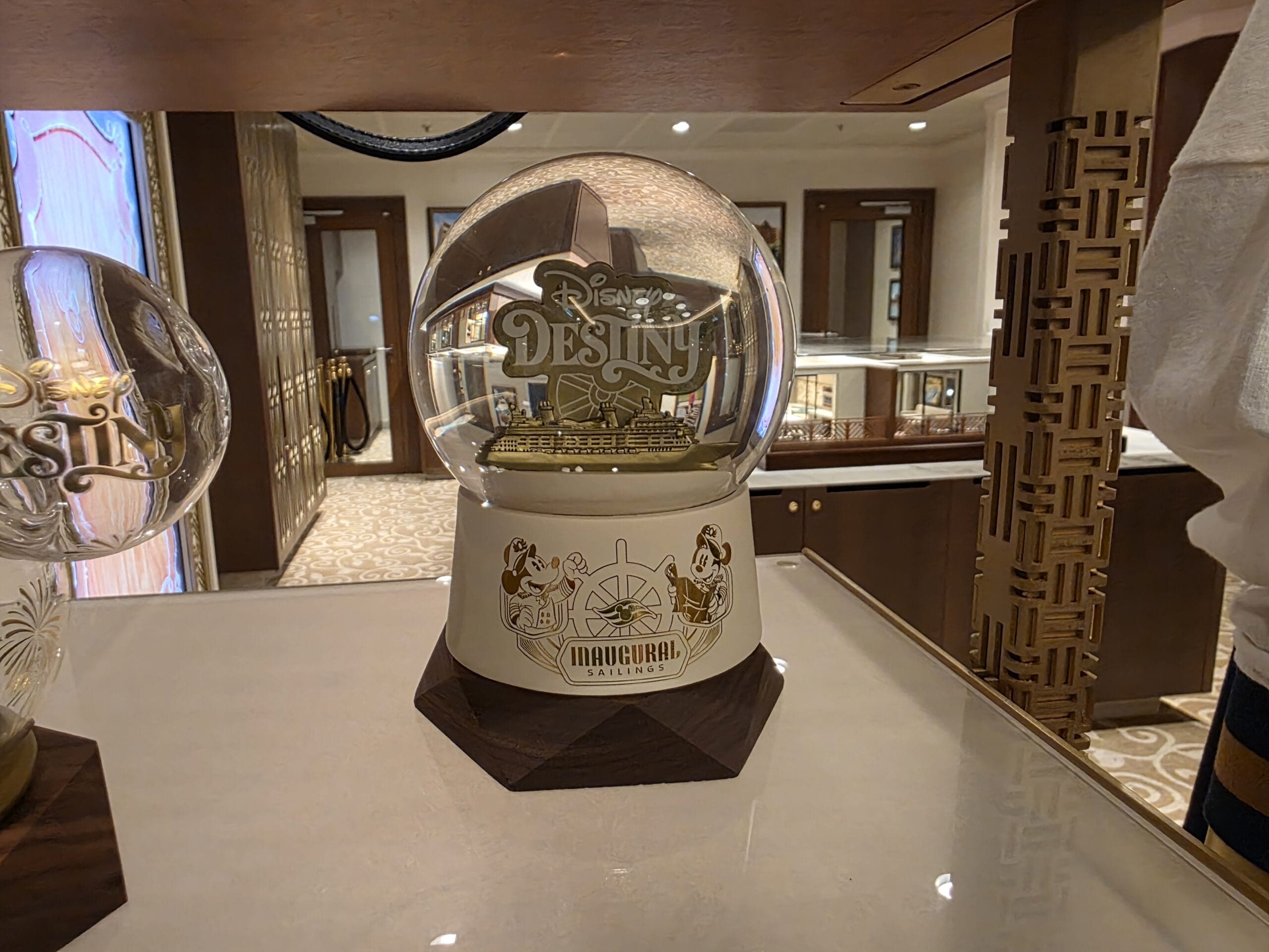 A small gold model of the Disney Destiny below her logo rest inside this snowglobe, which sits on a white base printed with Captains Mickey and Minnie, a Disney Cruise Line ship’s wheel, and “Inaugural Sailings.”