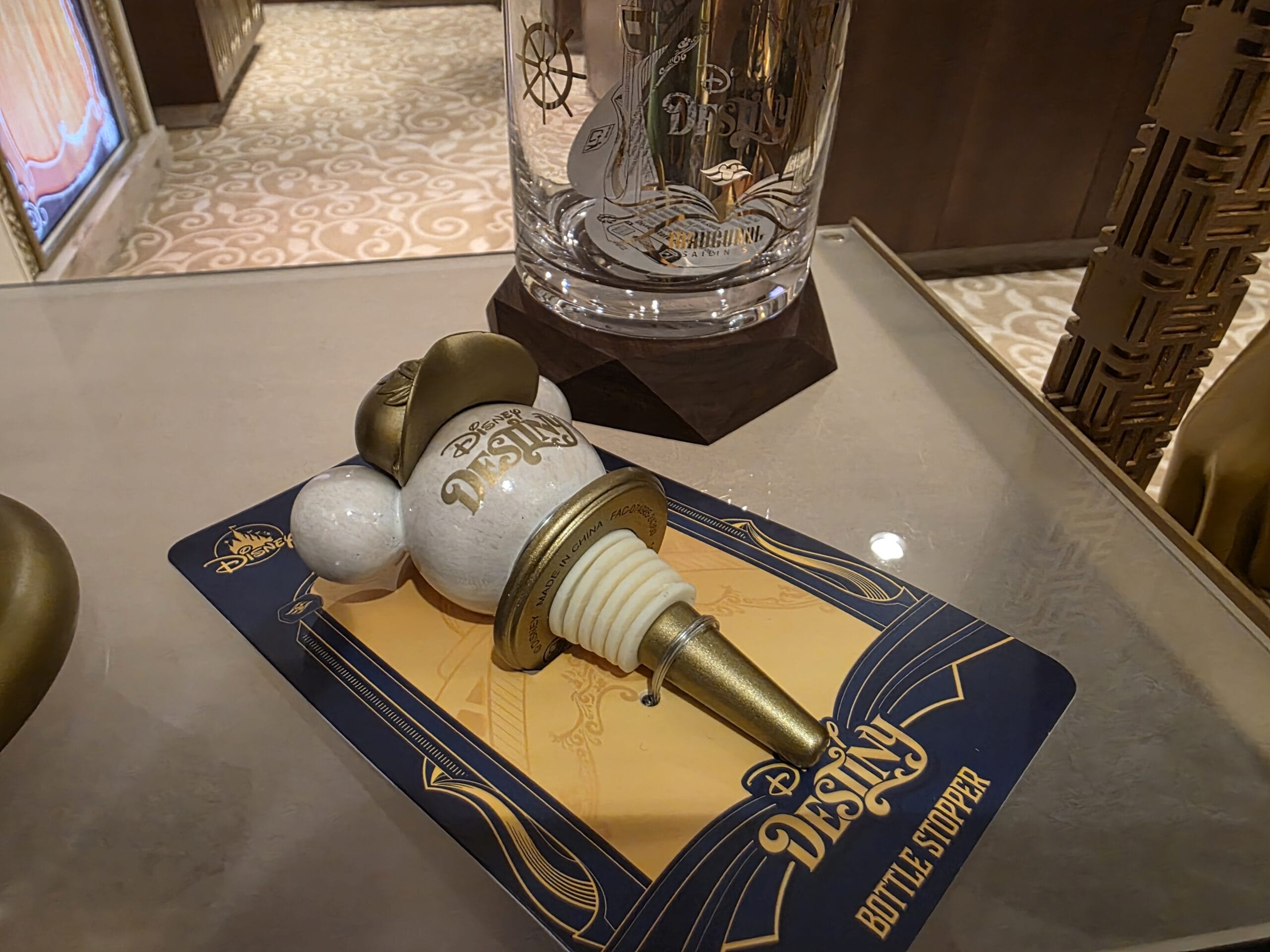 A white marble-patterned Mickey head wearing a gold captain’s hat head tops this bottle stopper.