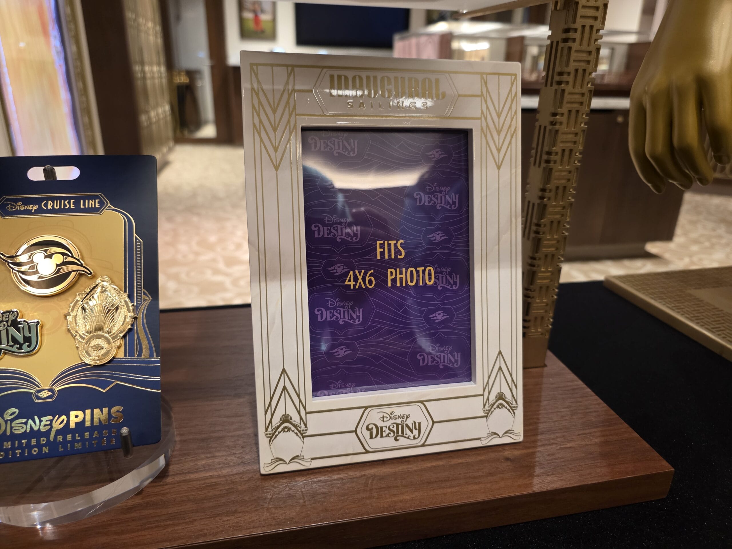 This white marble-patterned photo frame commemorates the Disney Destiny Inaugural Sailings with a gold design reminiscent of the Great Hall along the sides, ending in the Destiny bow at the bottom corners. “Inaugural Sailings” is at the top and the Disney Destiny logo is at the bottom.