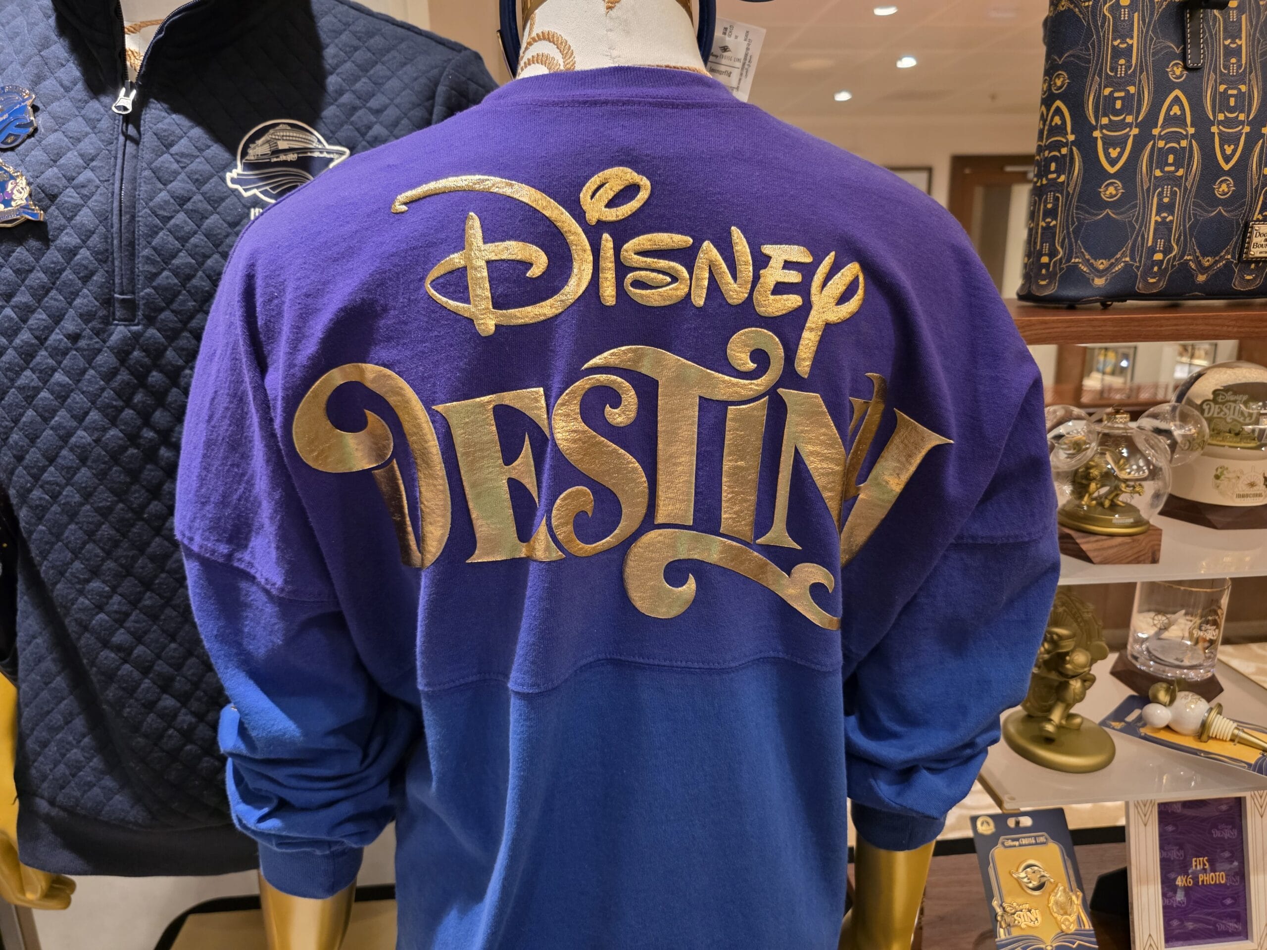 The Disney Destiny Inaugural Sailings merchandise features a rich purple, blue, and gold color scheme, as seen on the spirit jersey. The shirt is an allover purple to blue gradient with the Disney Destiny in puffy gold across the back shoulders.