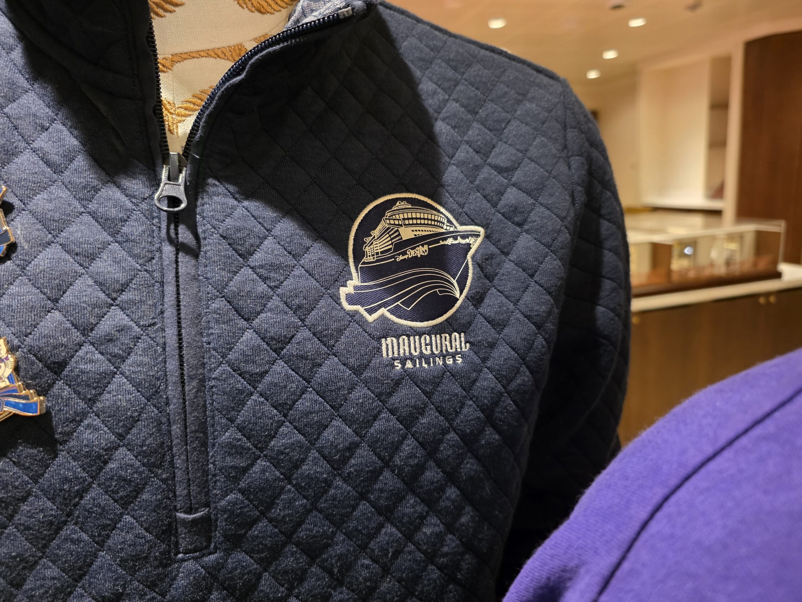 This quilted navy 3/4 zip pullover has a commemorative gold and navy patch of the Destiny slicing through stylized waves over a gold embroidered “Inaugural Sailings.”
